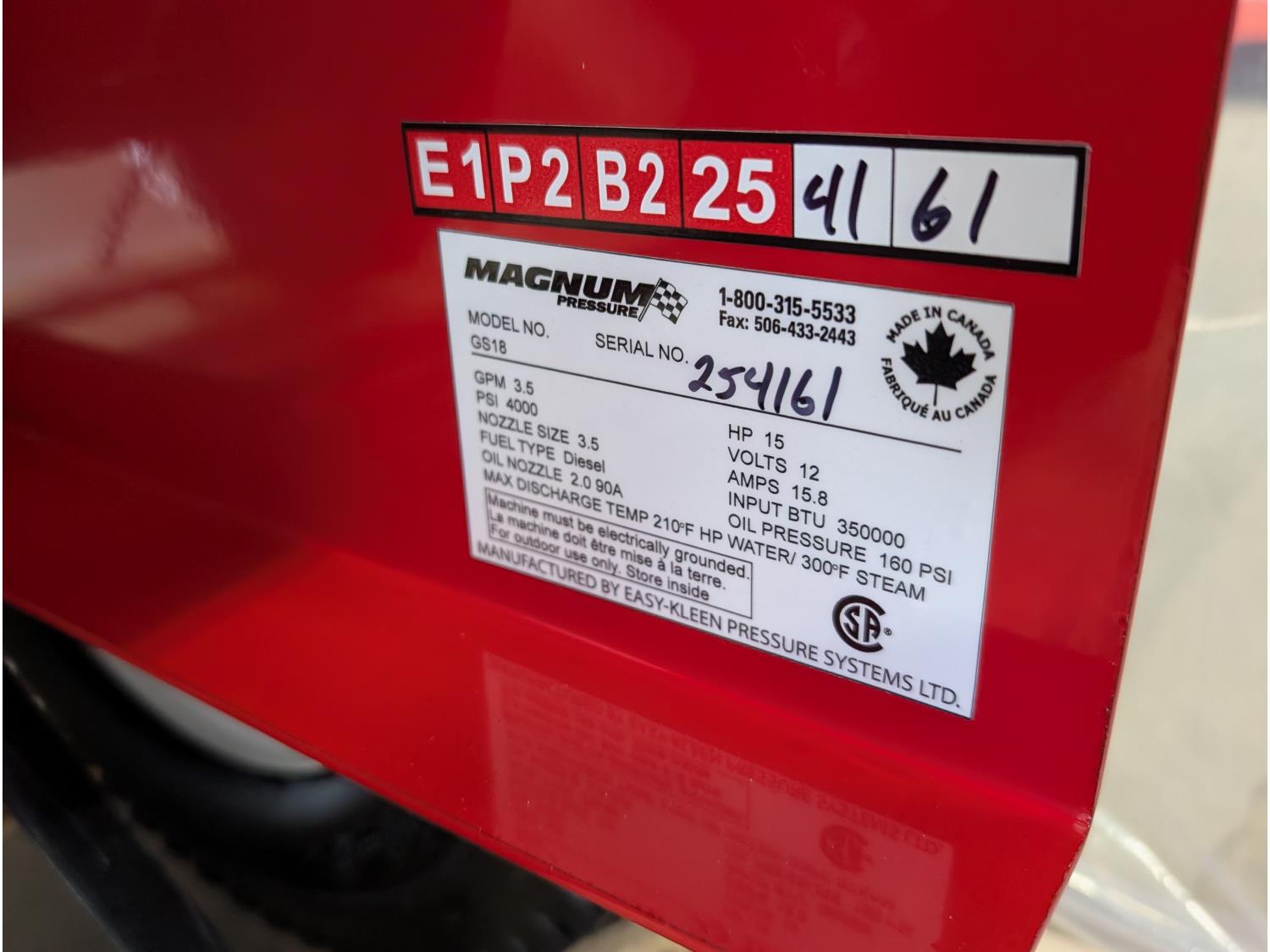 3.5 GPM at 4000 PSI, 15 HP, gasoline engine, electric start, 12 volt burner, oil/diesel fired burned/thermostat, schedule 80 coil with stainless steel housing, fully welded, powder coated frame, 10 gallon poly fuel tank, 30' hose and wand