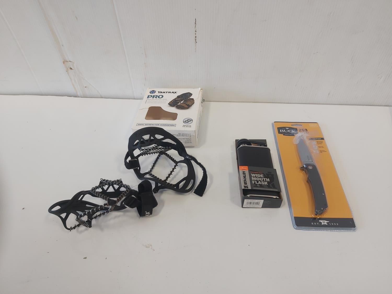 5062 Buck Folding Pocket Knife, Stanley Wide Mouth Flask and Yaktrax Cleats