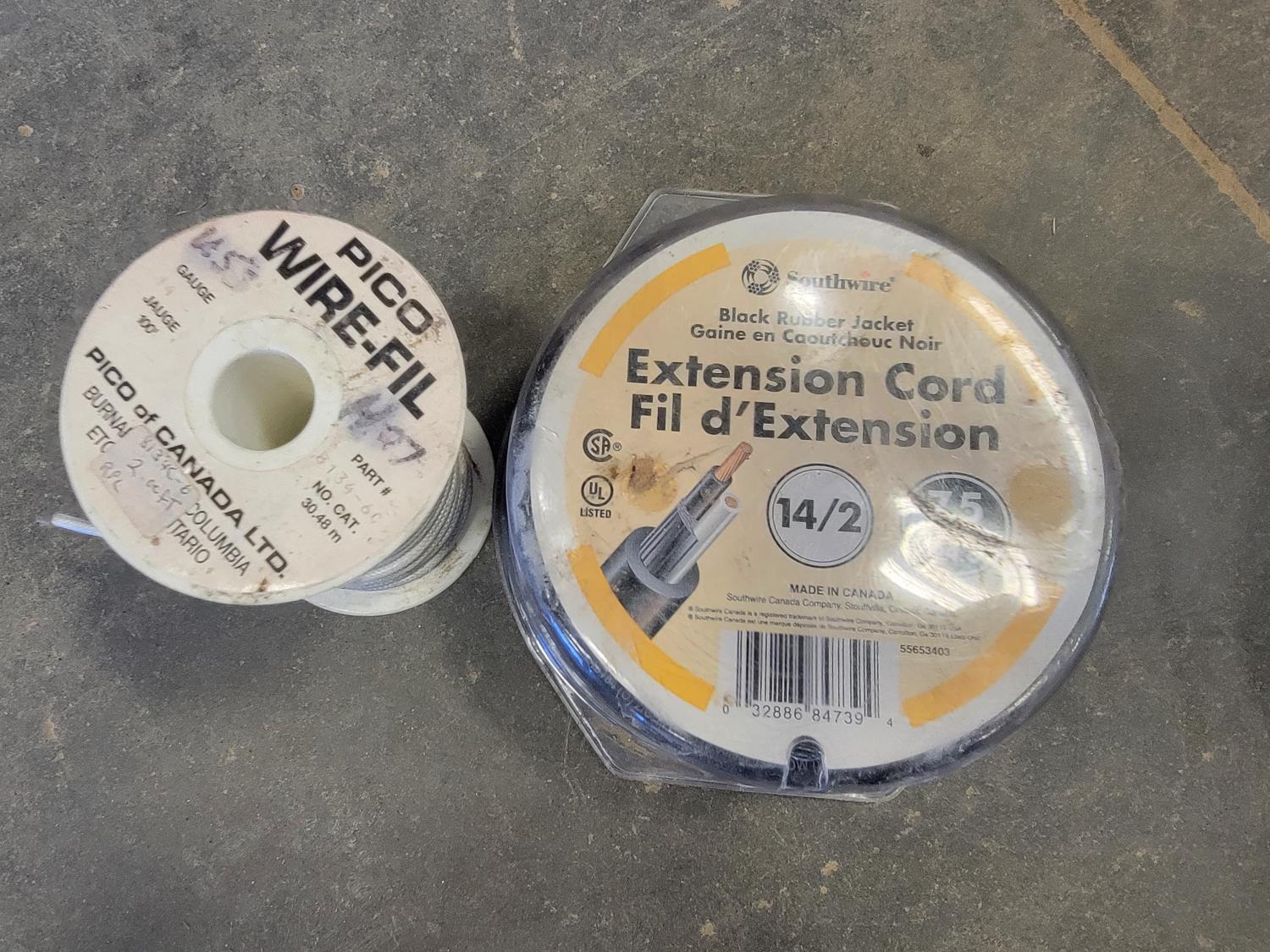 extension cords, booster cables, partial roll of electrical wire