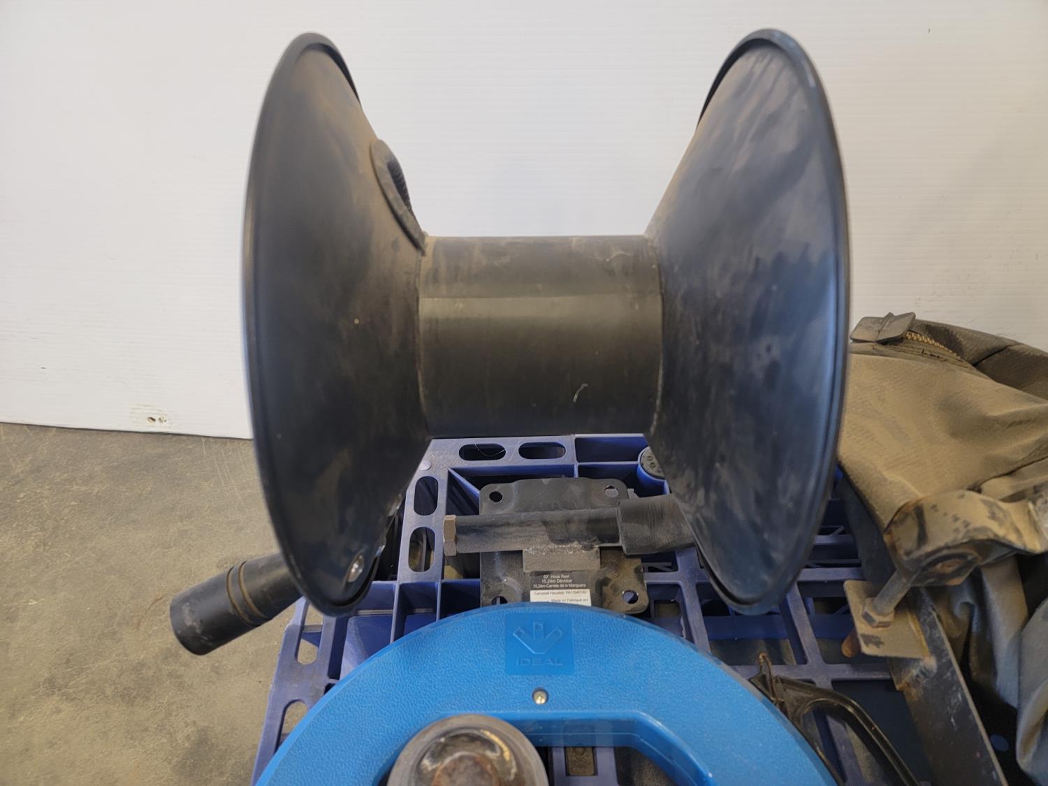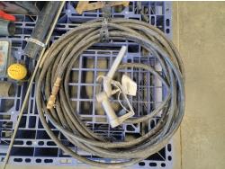 50 ft hose reel, air hose, fuel nozzle, jack stand, (2) garden sprayers, screen door catches
