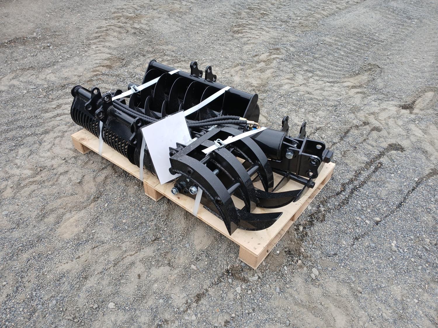 8 inch bucket, 20 inch rock bucket, 32 inch bucket, Q/C, ripper, rake, grapple, 8 inch auger, 12 inch auger