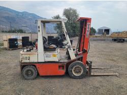 propane, hydro transmission, 80 inch lowered mast height, 187 in max lift height, 2 mast stages, 42 inch pallet forks, side shift, solid rubber 7.00-12 front tires, solid rubber 6.00-9 rear tires