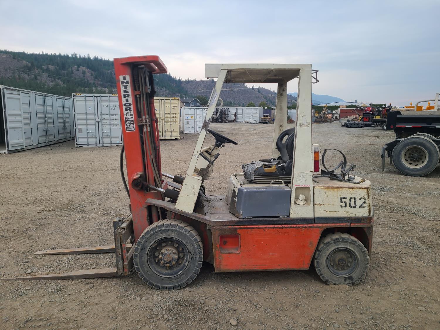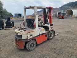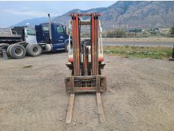 propane, hydro transmission, 80 inch lowered mast height, 187 in max lift height, 2 mast stages, 42 inch pallet forks, side shift, solid rubber 7.00-12 front tires, solid rubber 6.00-9 rear tires