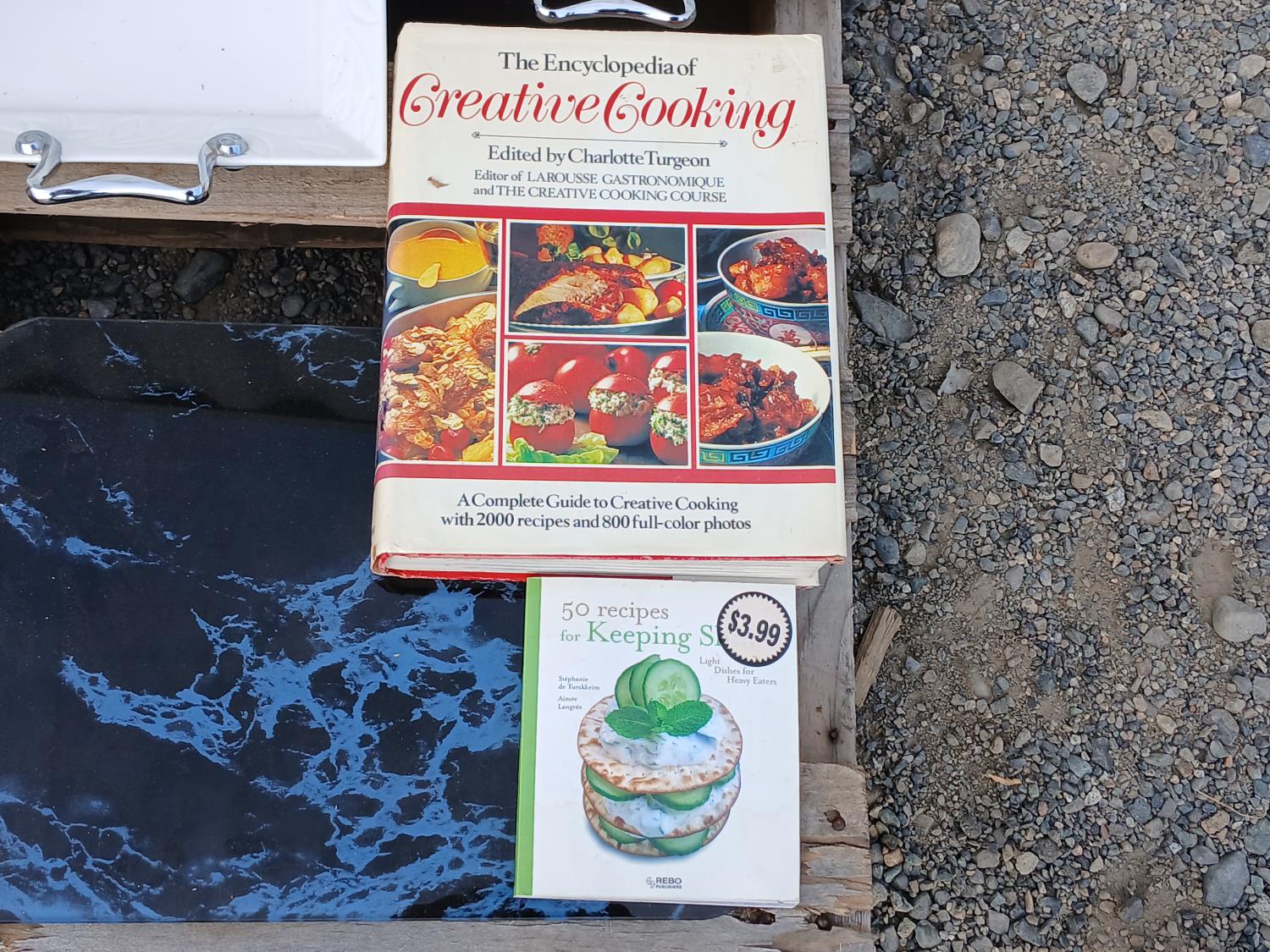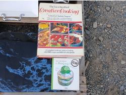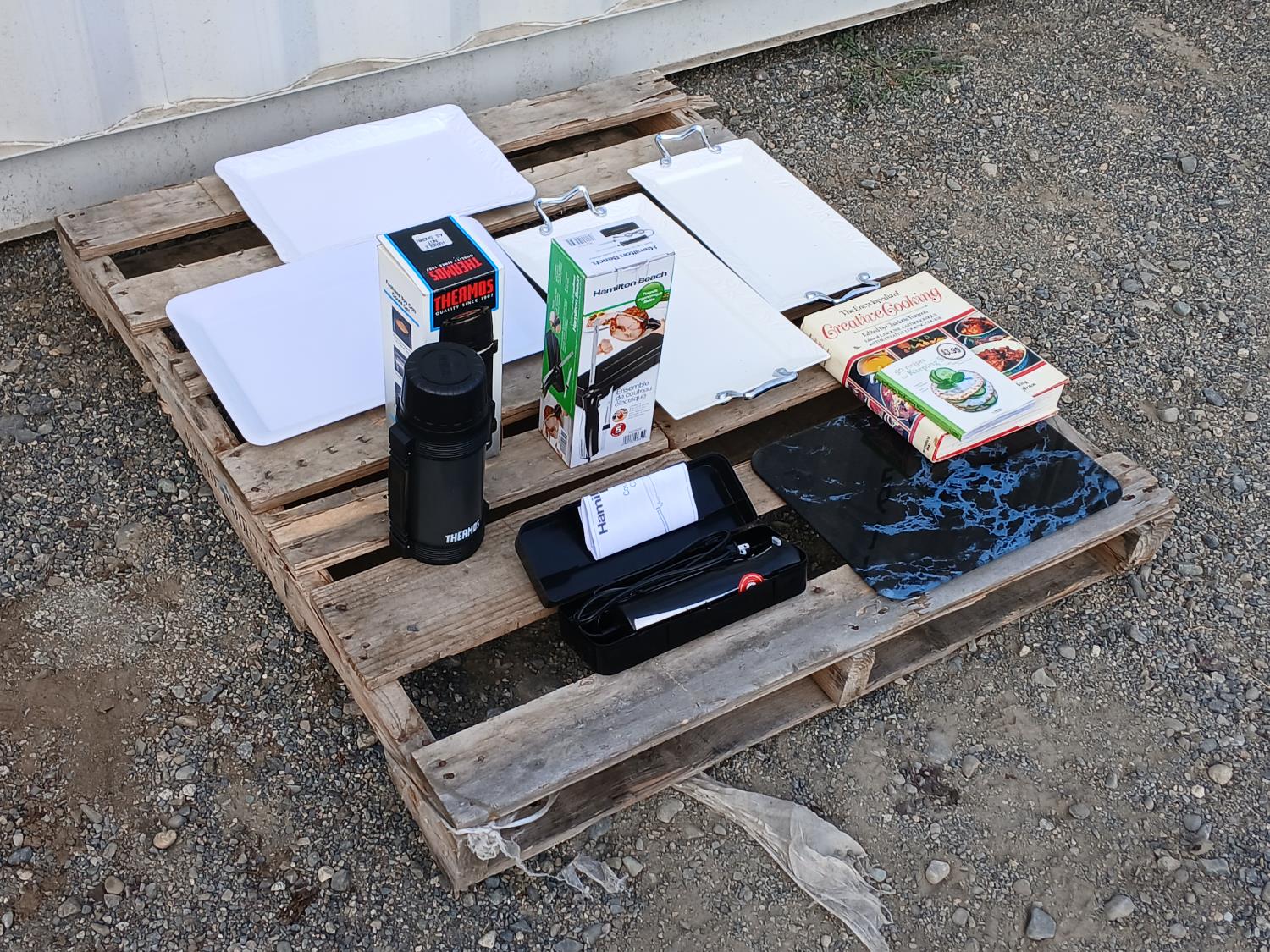 (4) Serving platters, cook books, glass cutting board, Hamilton Beach electric carving knife, 1 quart (.95Lt) insulated steel Thermos.