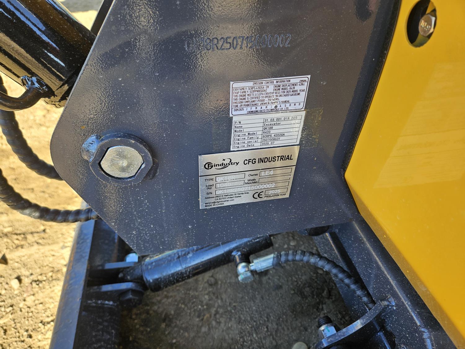 Open station, pilot controls, 420cc gas engine, 15 inch dig bucket, manual thumb, 2 Ft 8 inch stick, backfill blade, 7 inch rubber tracks