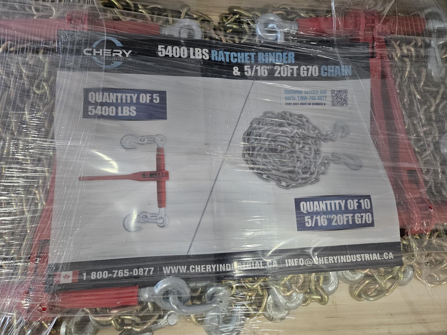 (5) ratchet binders 5400 lb capacity, (10) 20 ft 5/16 G70 Chain