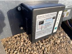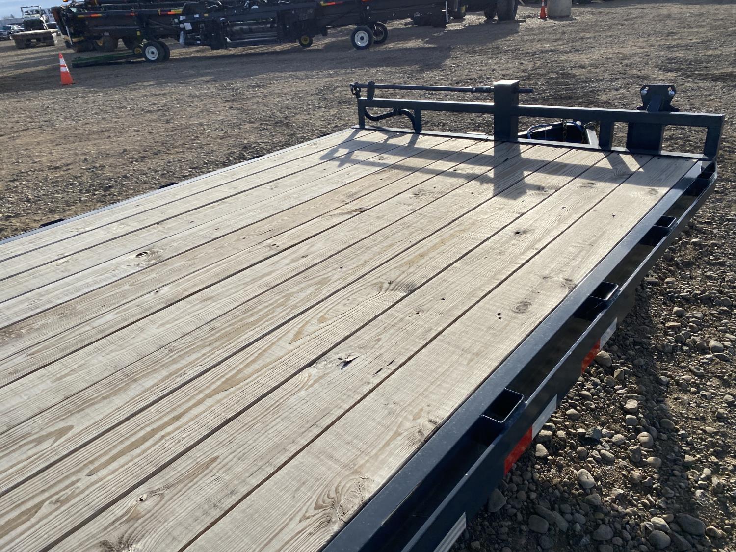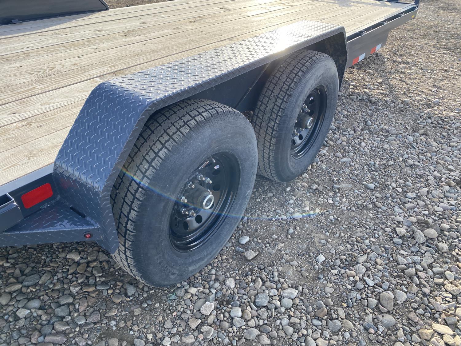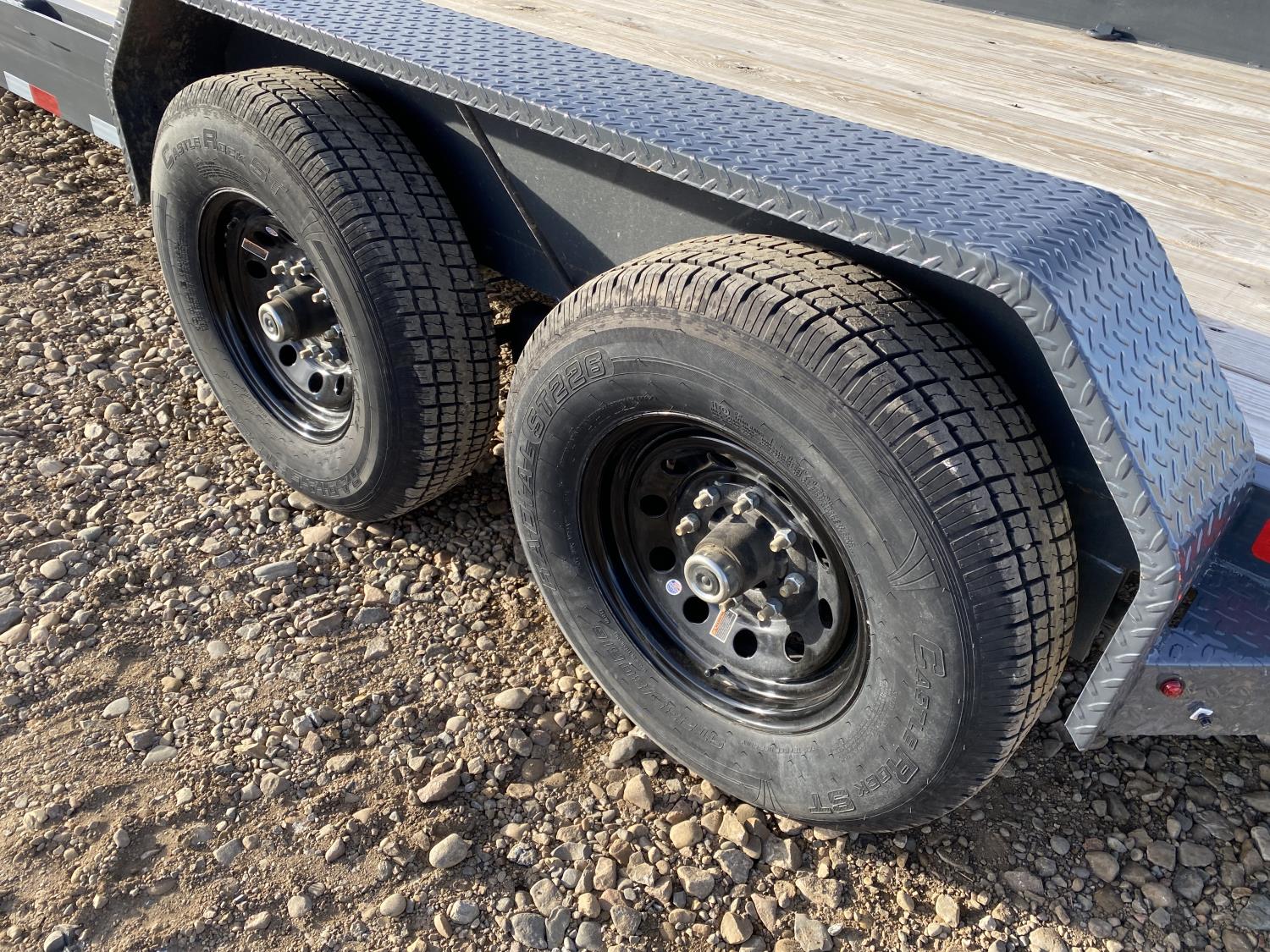 83 inch wide deck, 24 inch beaver tails, wood deck, slide in ramps, electric brakes, spring suspension, ball hitch, rub rails, stake pockets, LED lights, 7000 lb axles, 235/80R16 tires