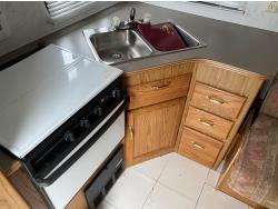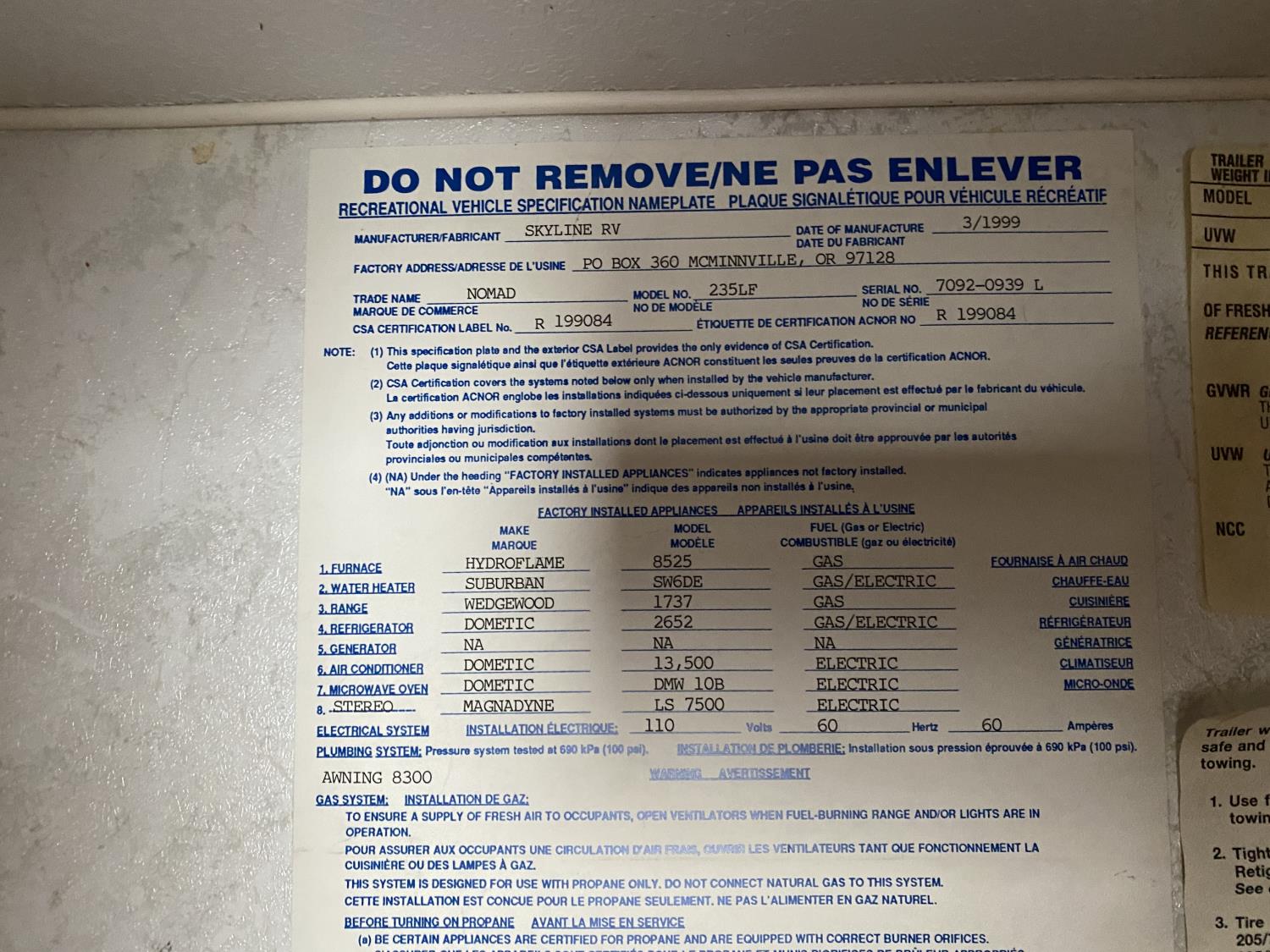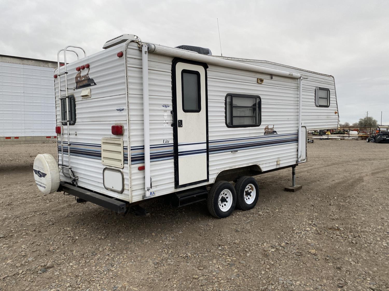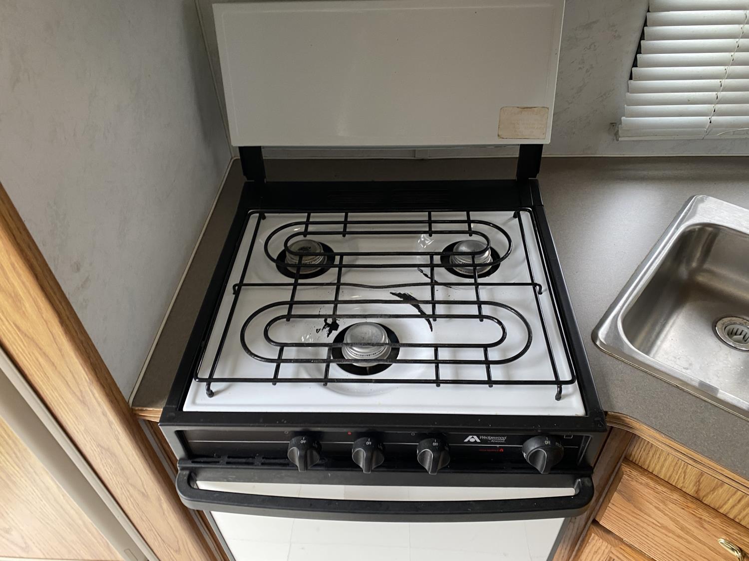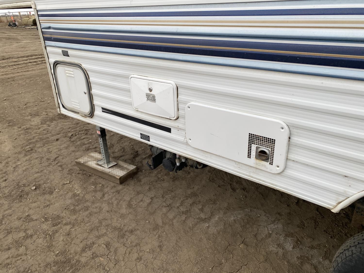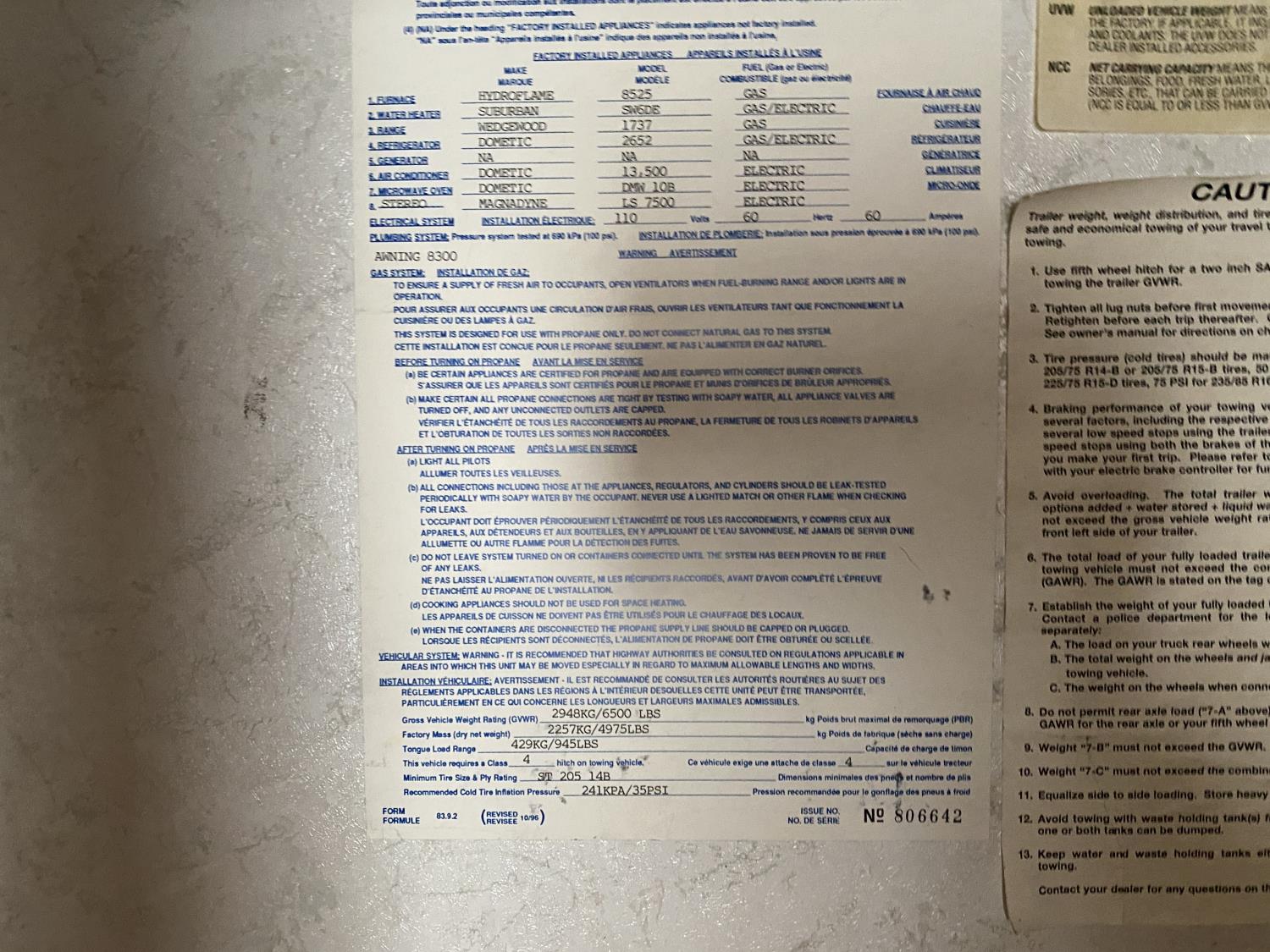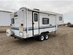 Sleeps 6, stove, fridge, microwave, full bath, A/C, manual awning, power levelling jacks, spring suspension, electric brakes, 205/75R14 tires