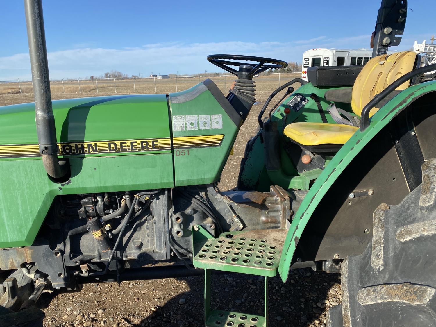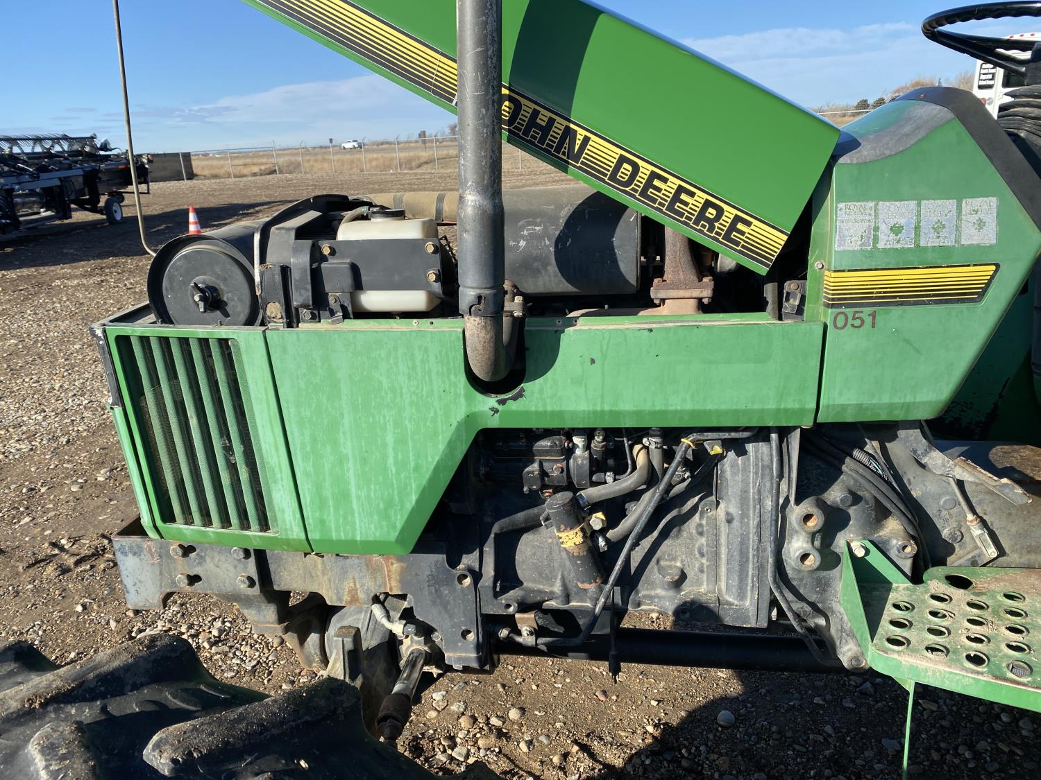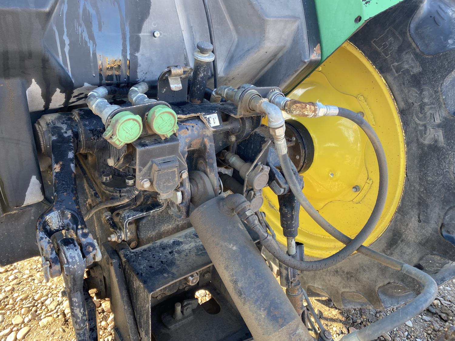 2.9 L 3 cylinder 68 HP, engine, 60 PTO HP, 9 speed manual transmission with creeper gear, 18 GPM hydraulic pump, open station platform, rear differential lock, 540 PTO, Q/A 3 point hitch, 3 rear hydraulic outlets, 320/85R24 front tires, 340/85R38 rear tires