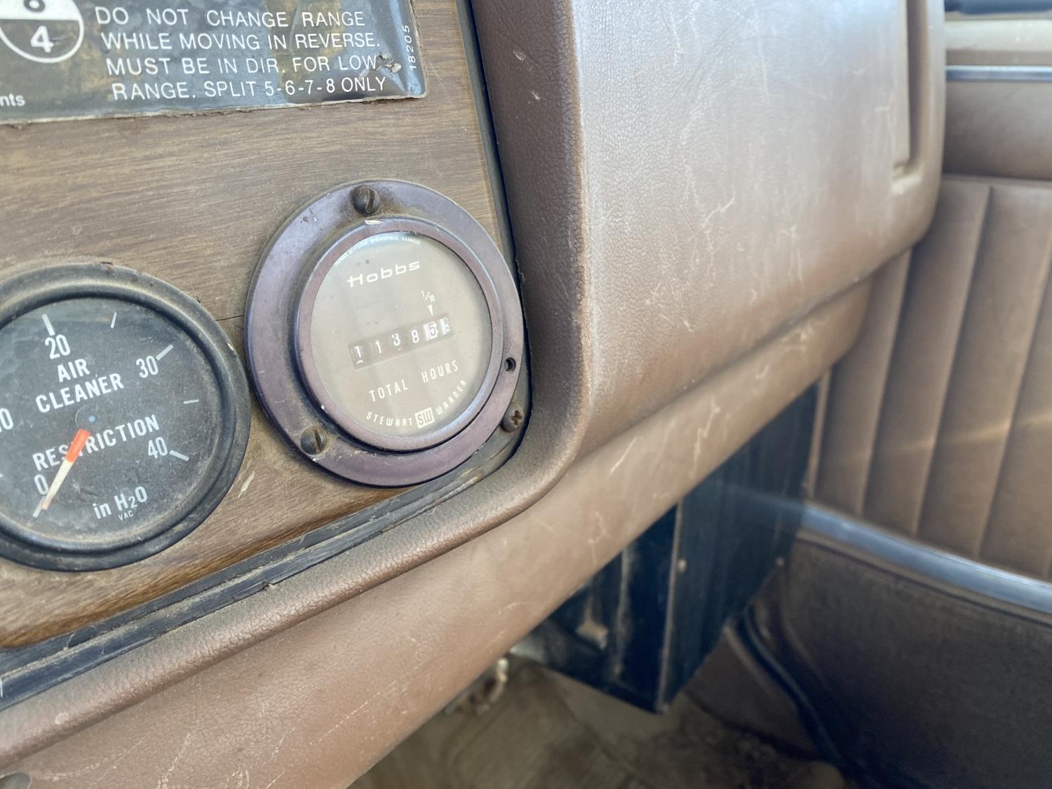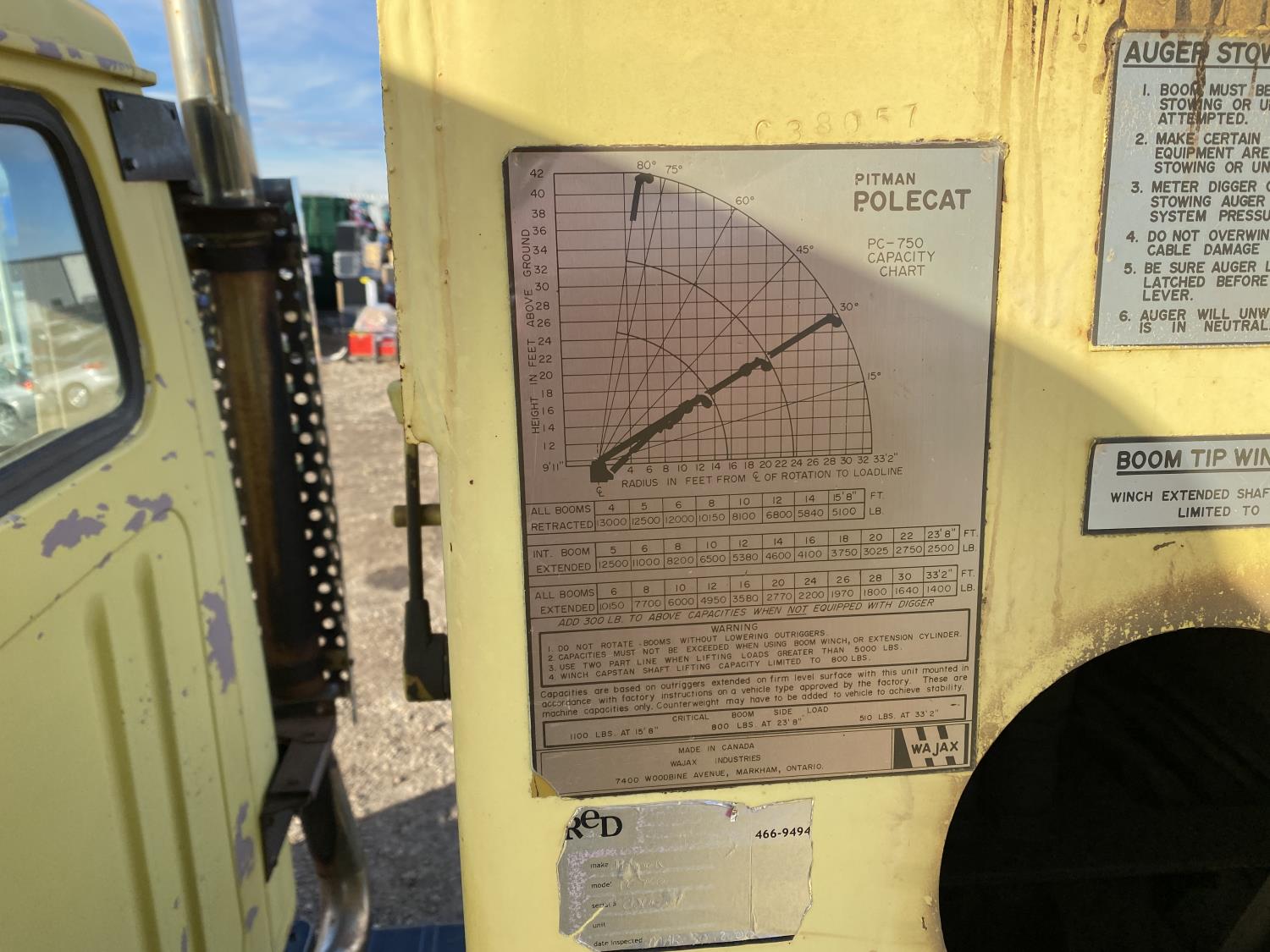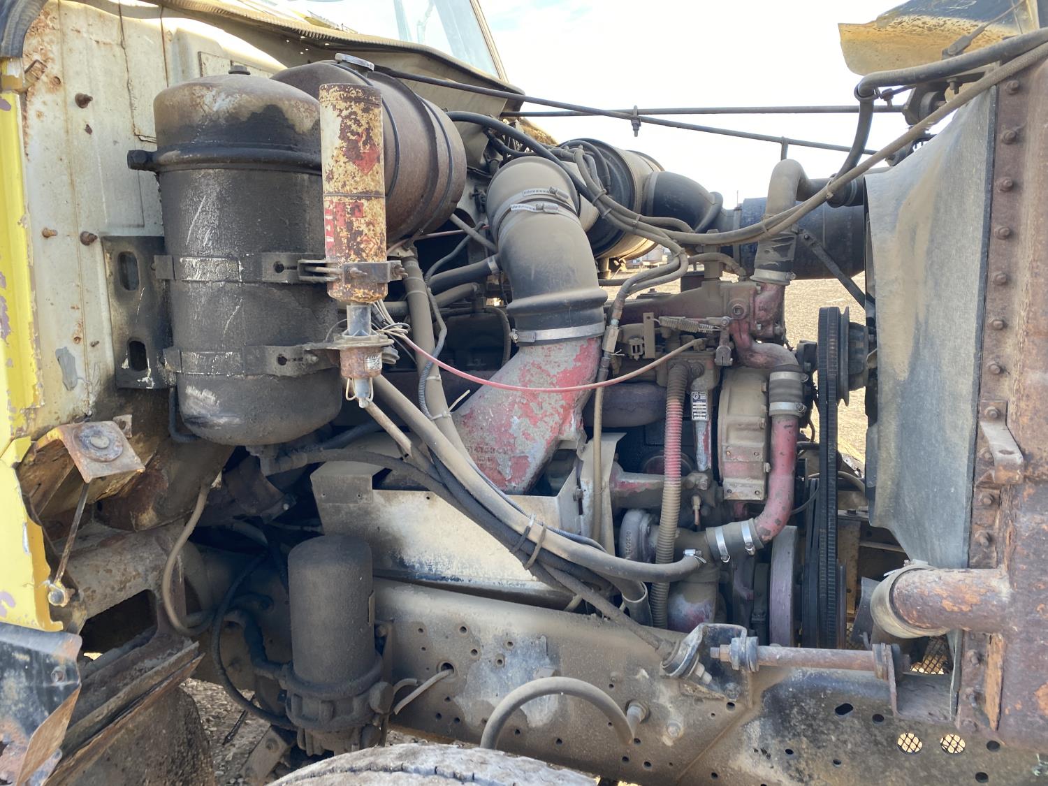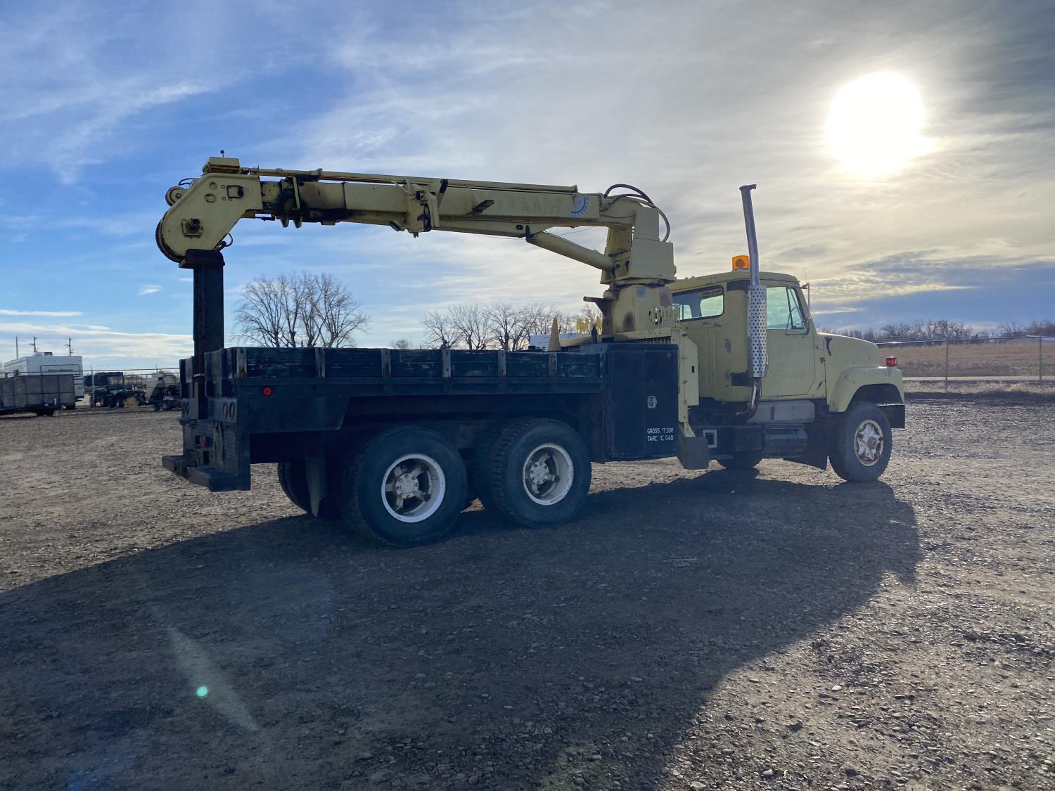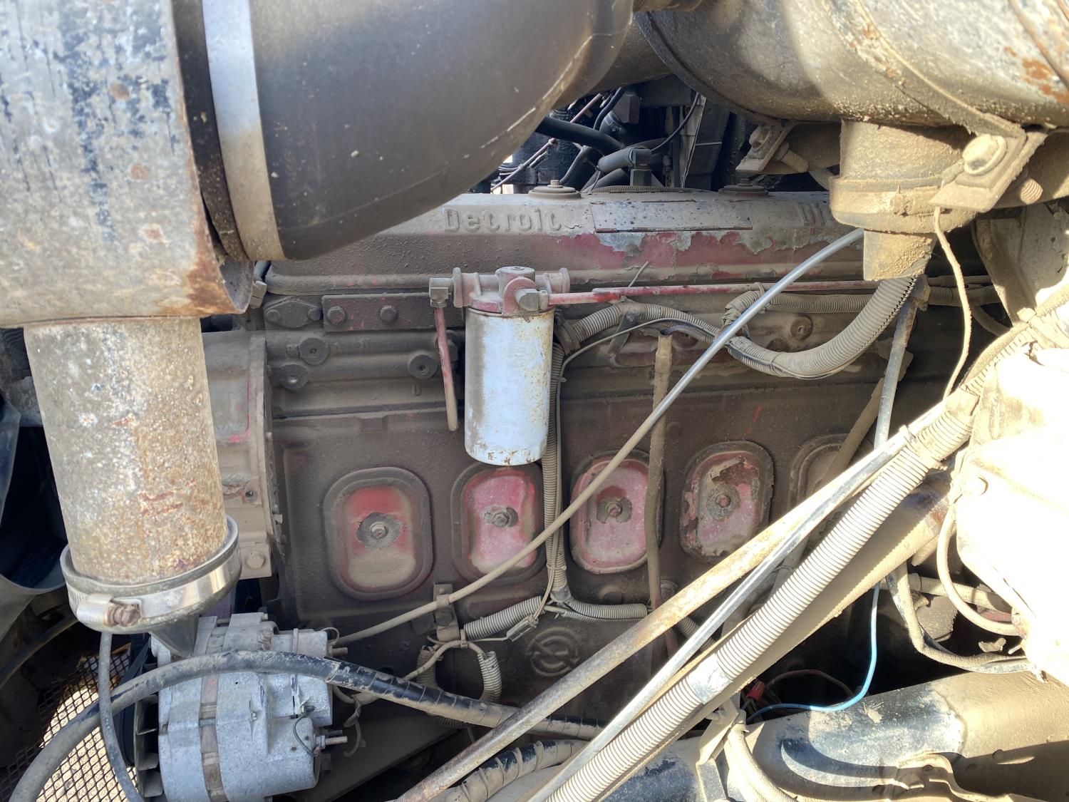 Detroit 6-71 6.9 L 6 cylinder engine, Eaton Fuller RTO-9513 13 speed manual transmission, 8 ft x 14 ft 3 inch deck, PTO pump, Pitman PC750 3 section 15 ft straight boom crane, outriggers, spring suspension, diff lock, 216 inch WB, 10-20 tires