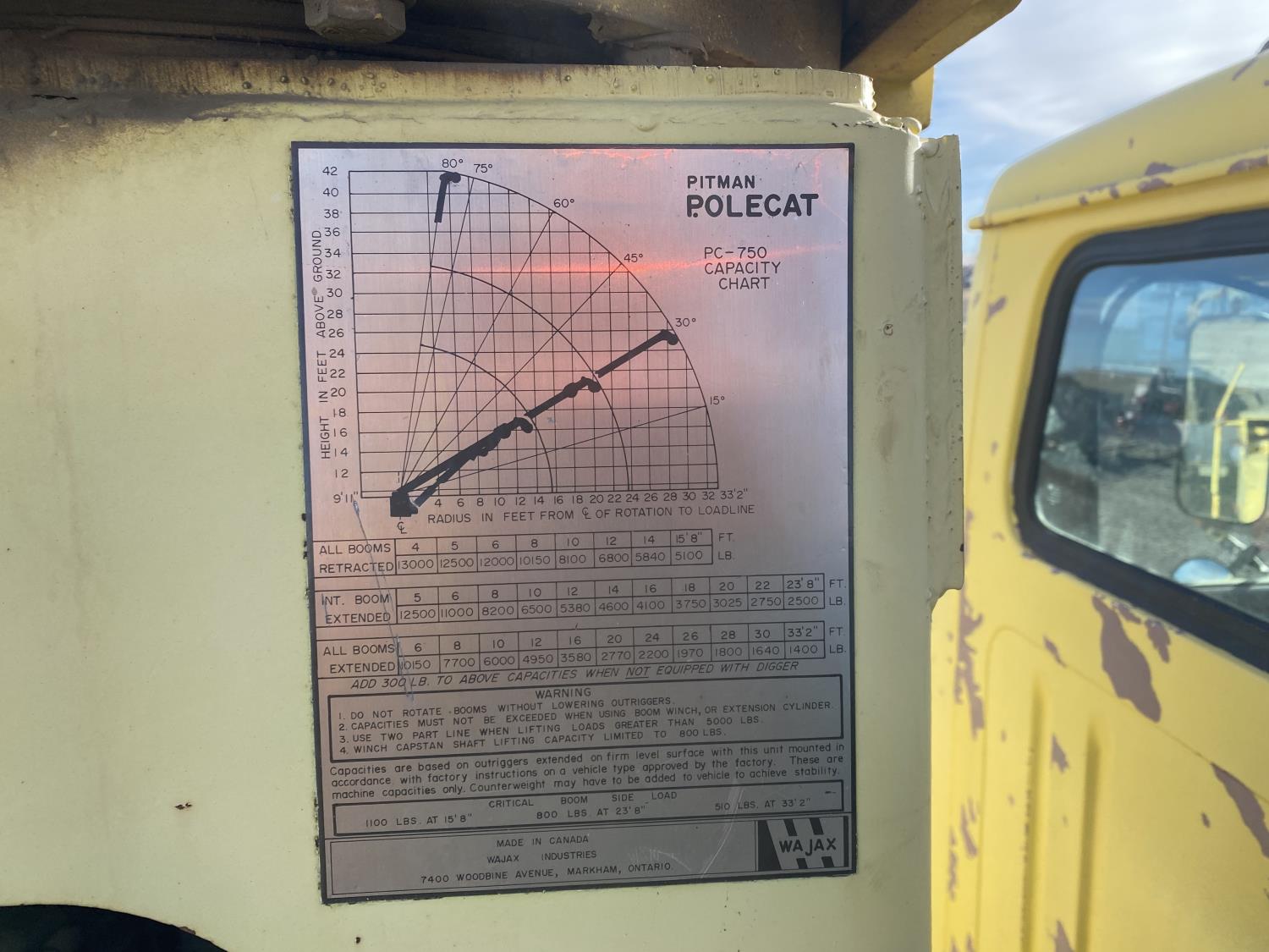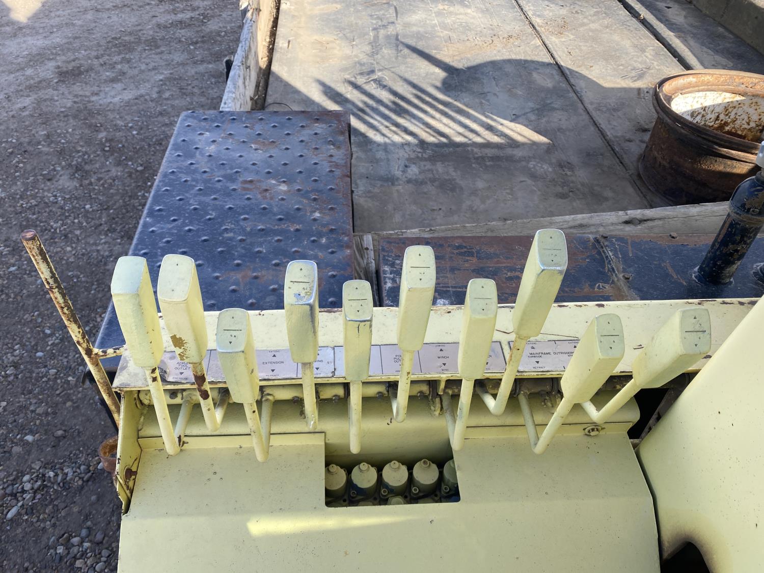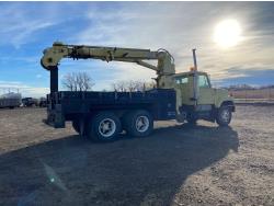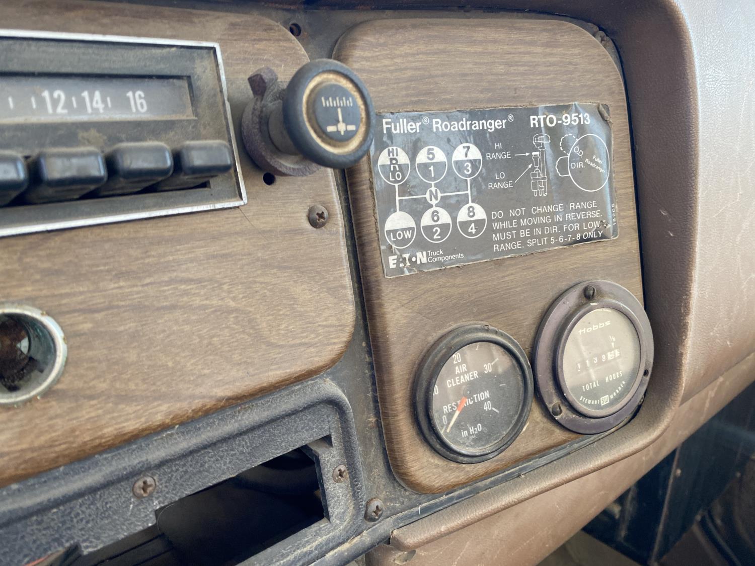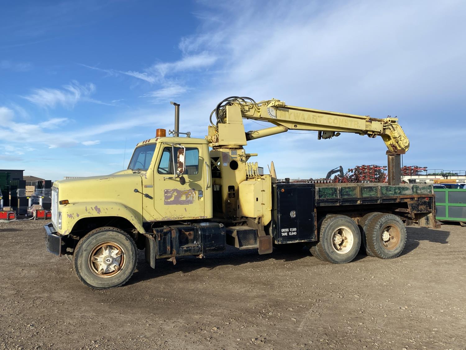 Detroit 6-71 6.9 L 6 cylinder engine, Eaton Fuller RTO-9513 13 speed manual transmission, 8 ft x 14 ft 3 inch deck, PTO pump, Pitman PC750 3 section 15 ft straight boom crane, outriggers, spring suspension, diff lock, 216 inch WB, 10-20 tires