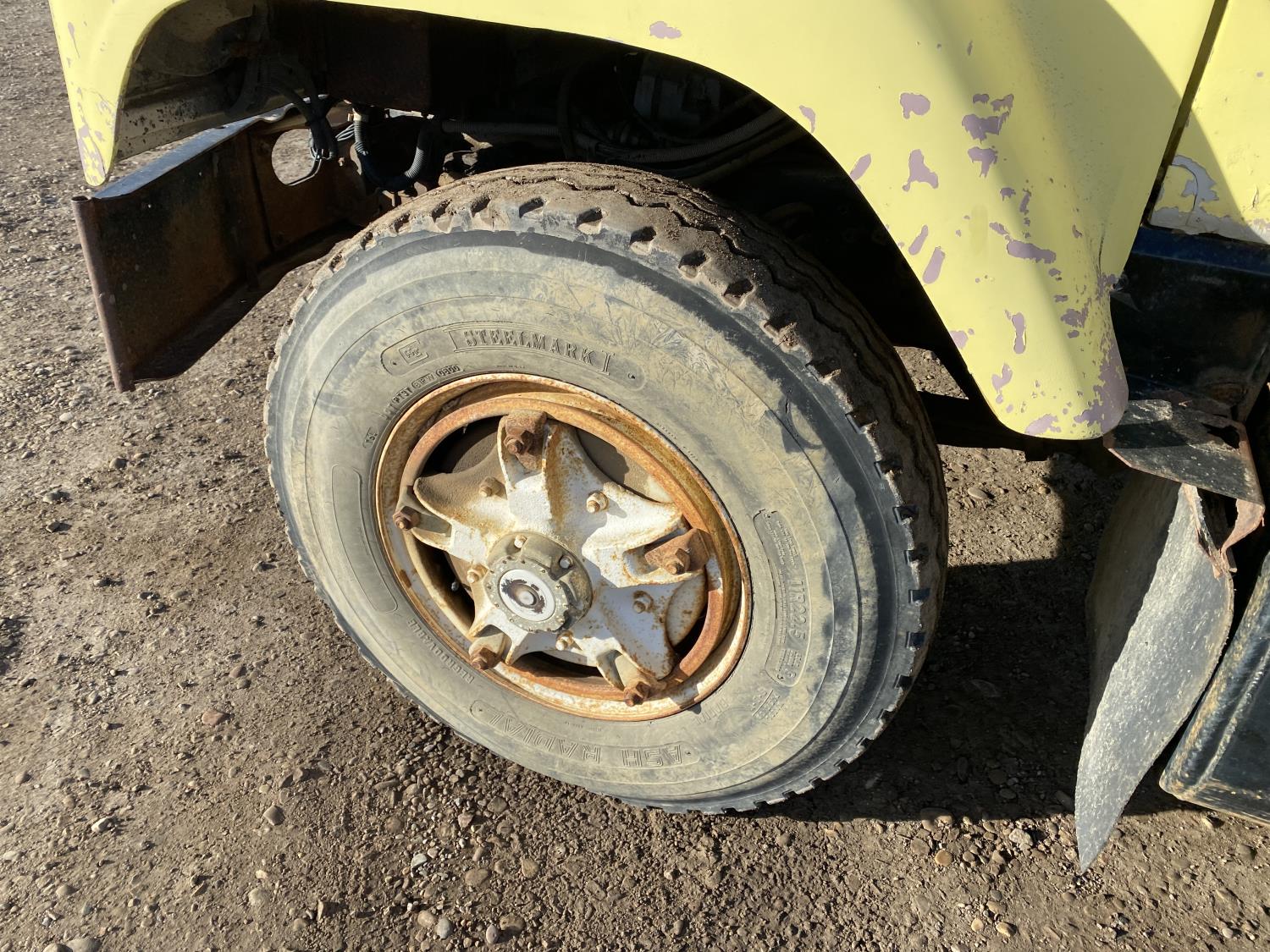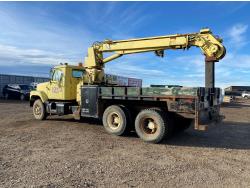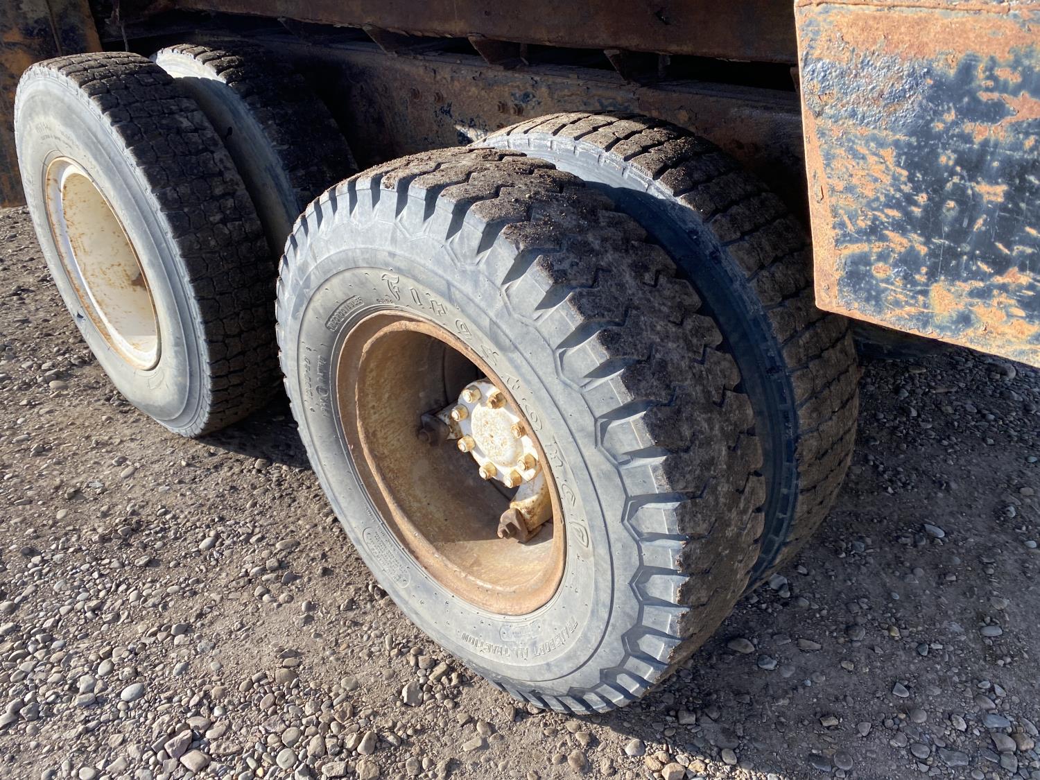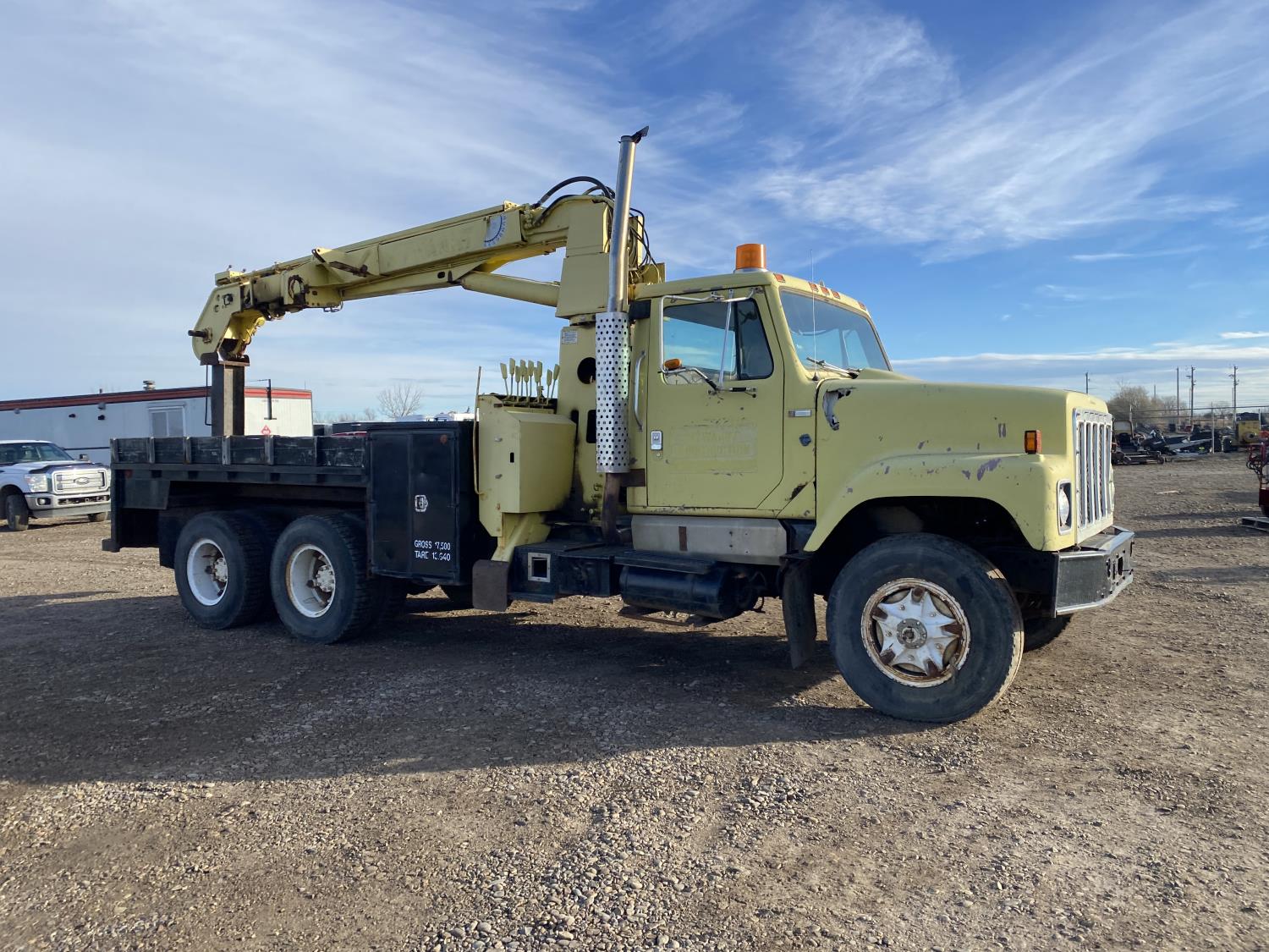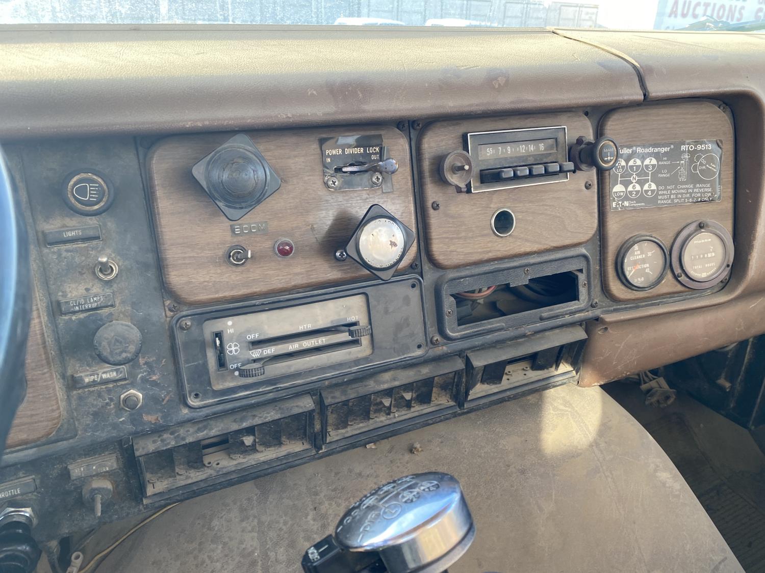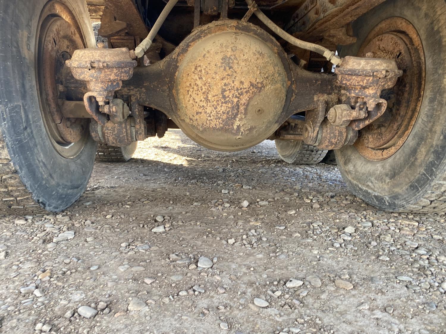 Detroit 6-71 6.9 L 6 cylinder engine, Eaton Fuller RTO-9513 13 speed manual transmission, 8 ft x 14 ft 3 inch deck, PTO pump, Pitman PC750 3 section 15 ft straight boom crane, outriggers, spring suspension, diff lock, 216 inch WB, 10-20 tires