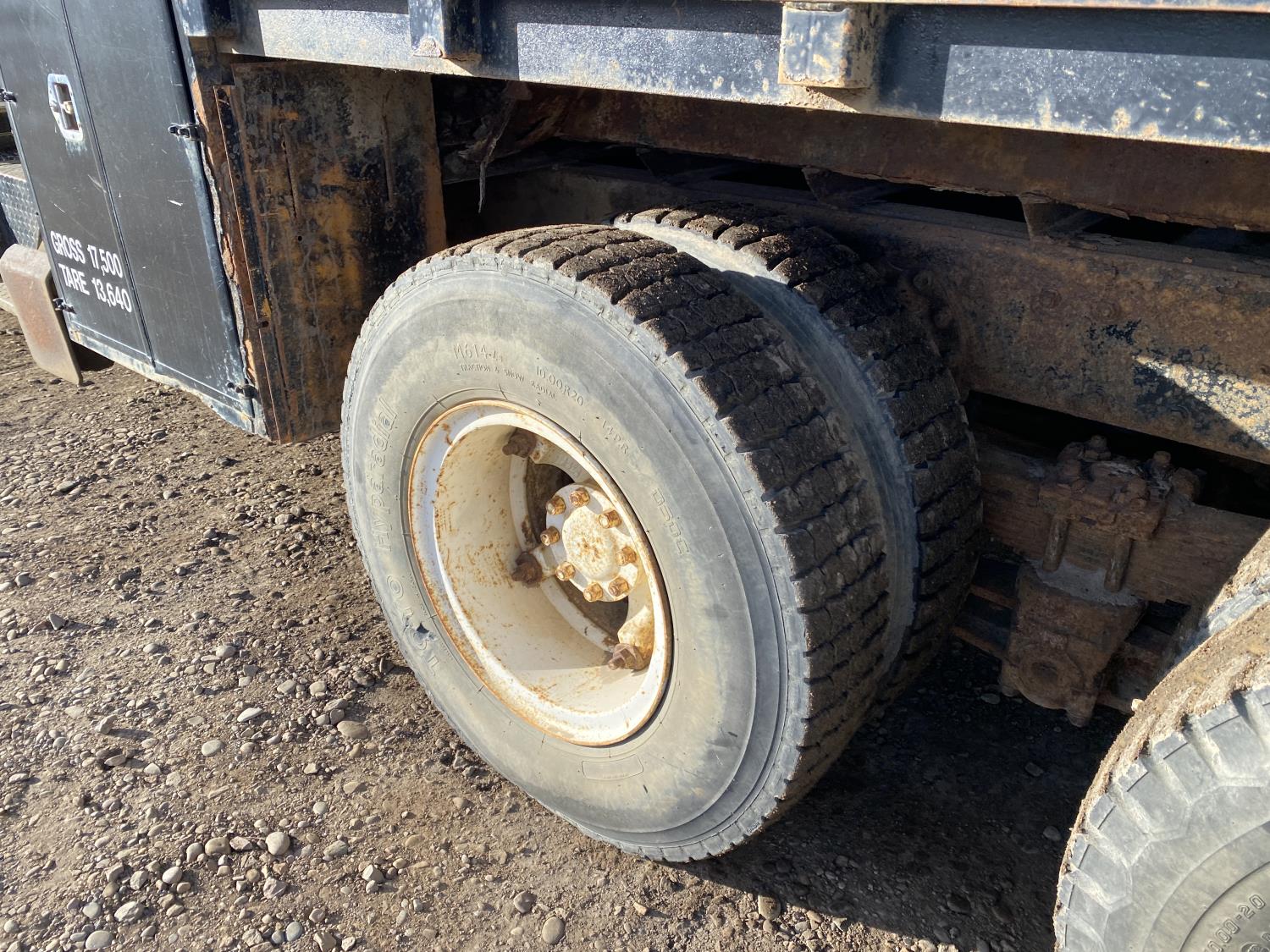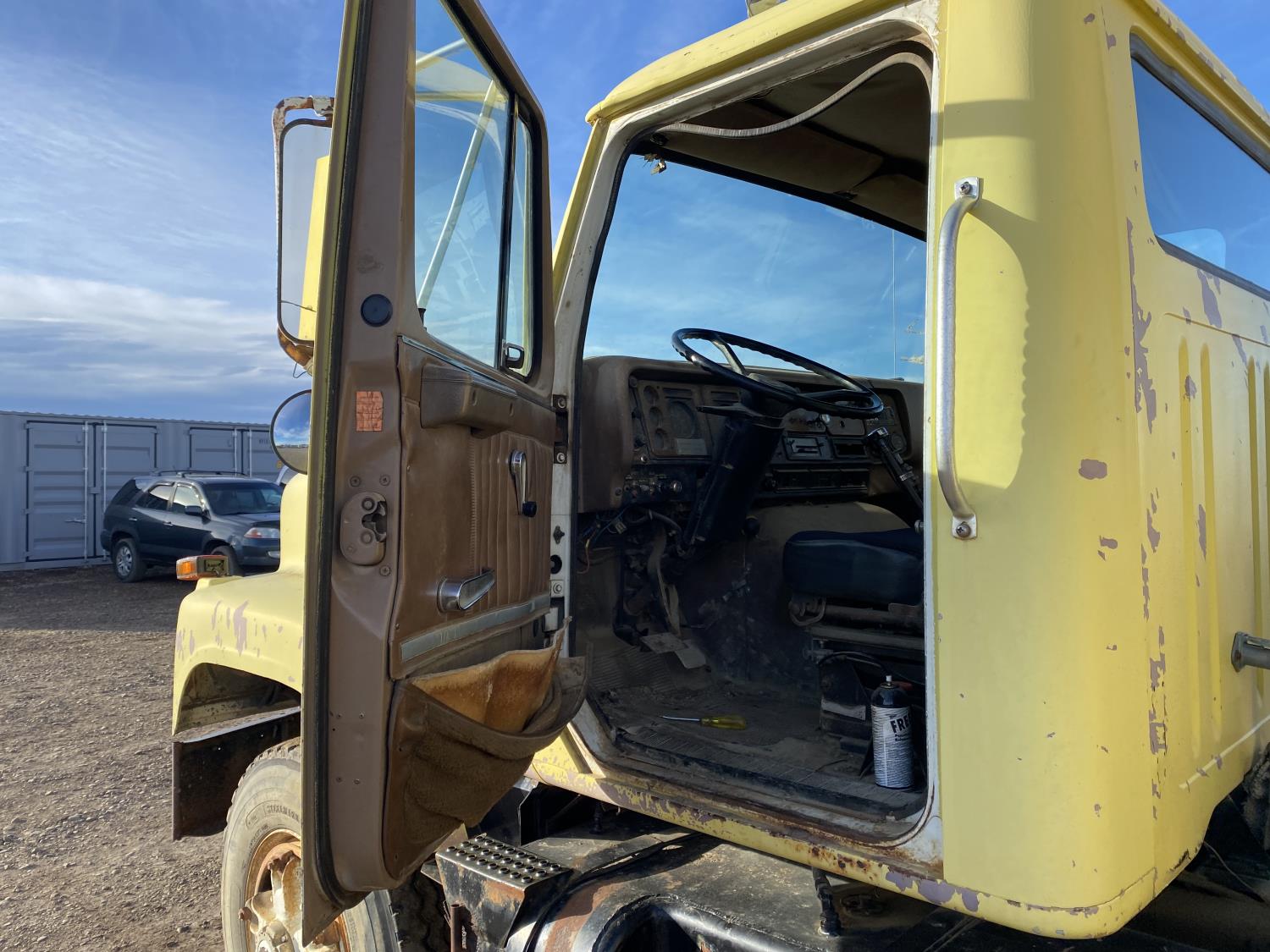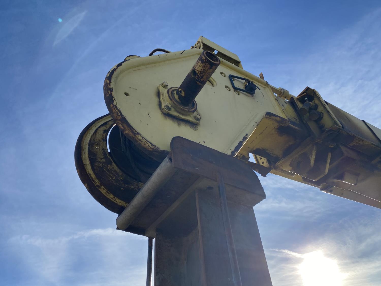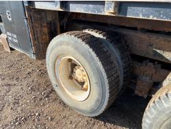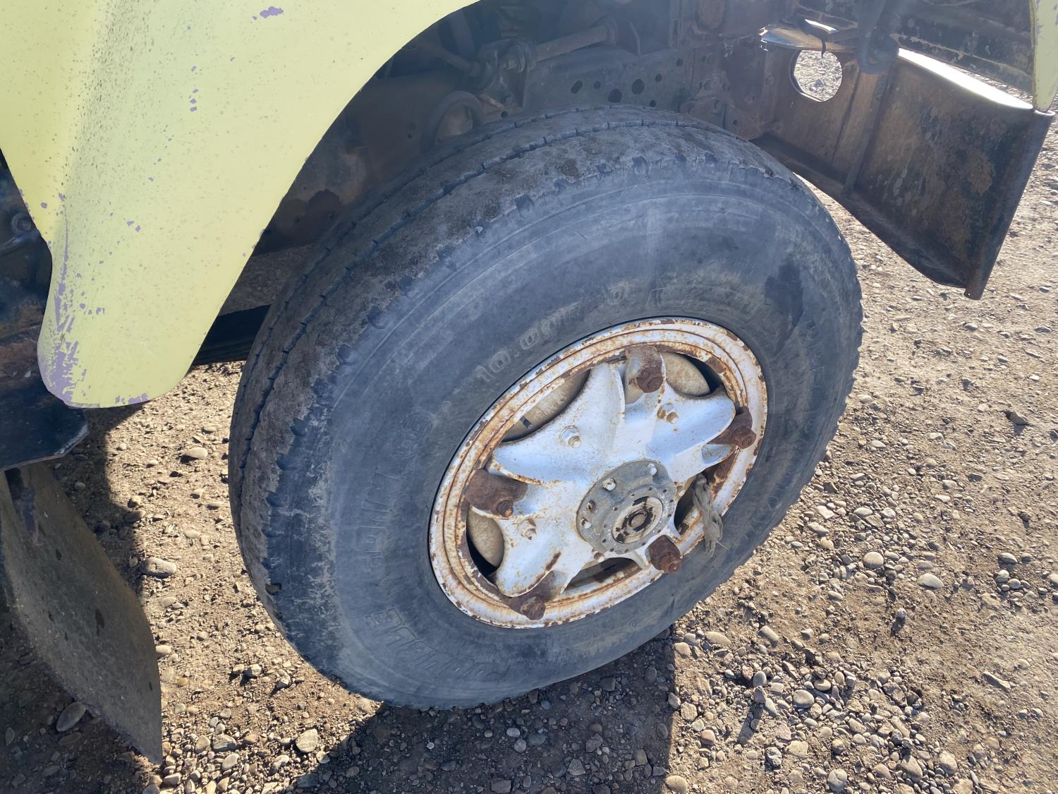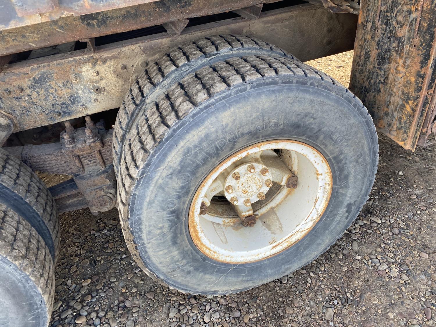 Detroit 6-71 6.9 L 6 cylinder engine, Eaton Fuller RTO-9513 13 speed manual transmission, 8 ft x 14 ft 3 inch deck, PTO pump, Pitman PC750 3 section 15 ft straight boom crane, outriggers, spring suspension, diff lock, 216 inch WB, 10-20 tires