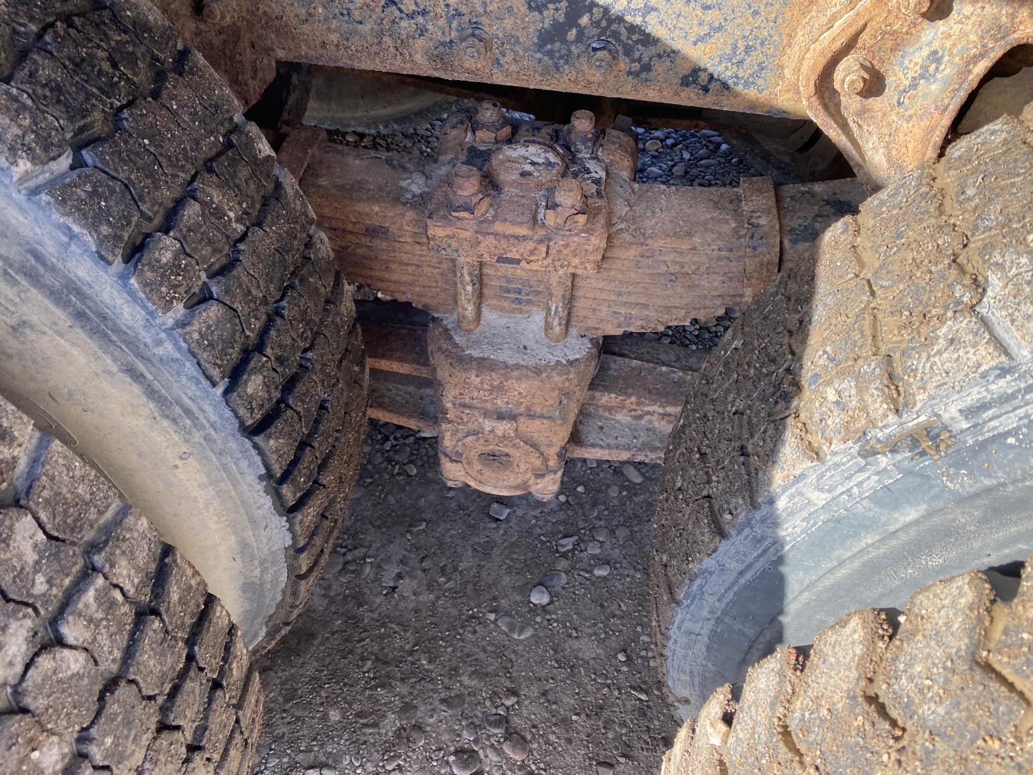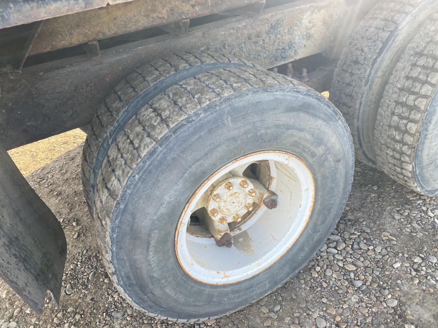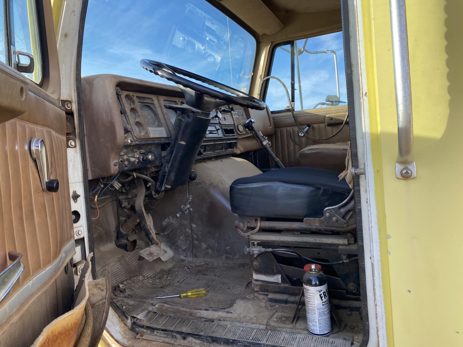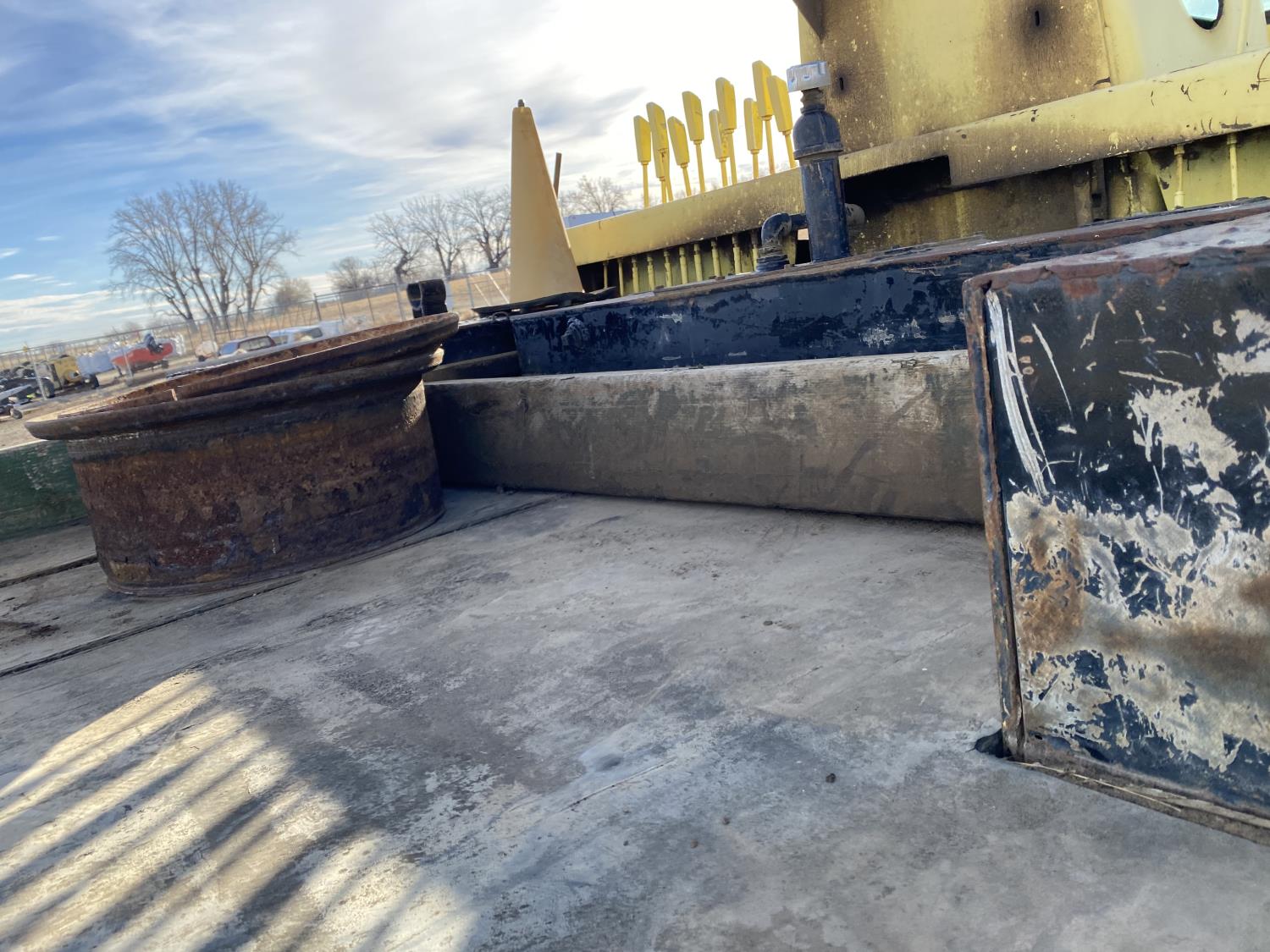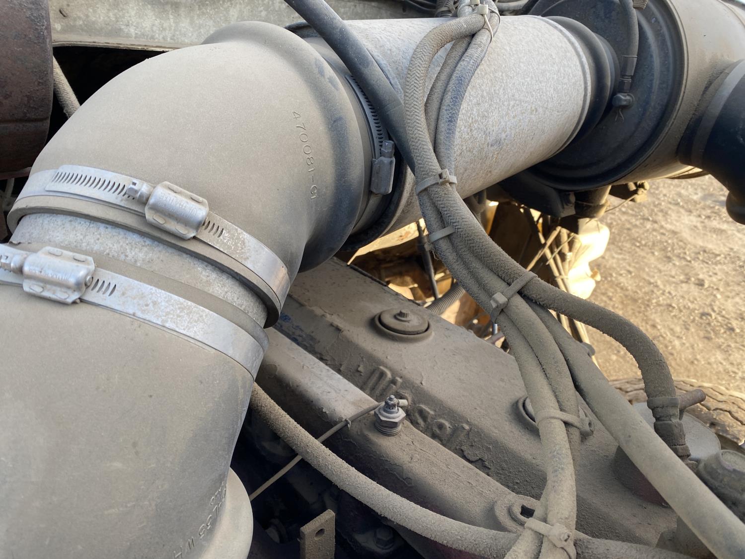 Detroit 6-71 6.9 L 6 cylinder engine, Eaton Fuller RTO-9513 13 speed manual transmission, 8 ft x 14 ft 3 inch deck, PTO pump, Pitman PC750 3 section 15 ft straight boom crane, outriggers, spring suspension, diff lock, 216 inch WB, 10-20 tires