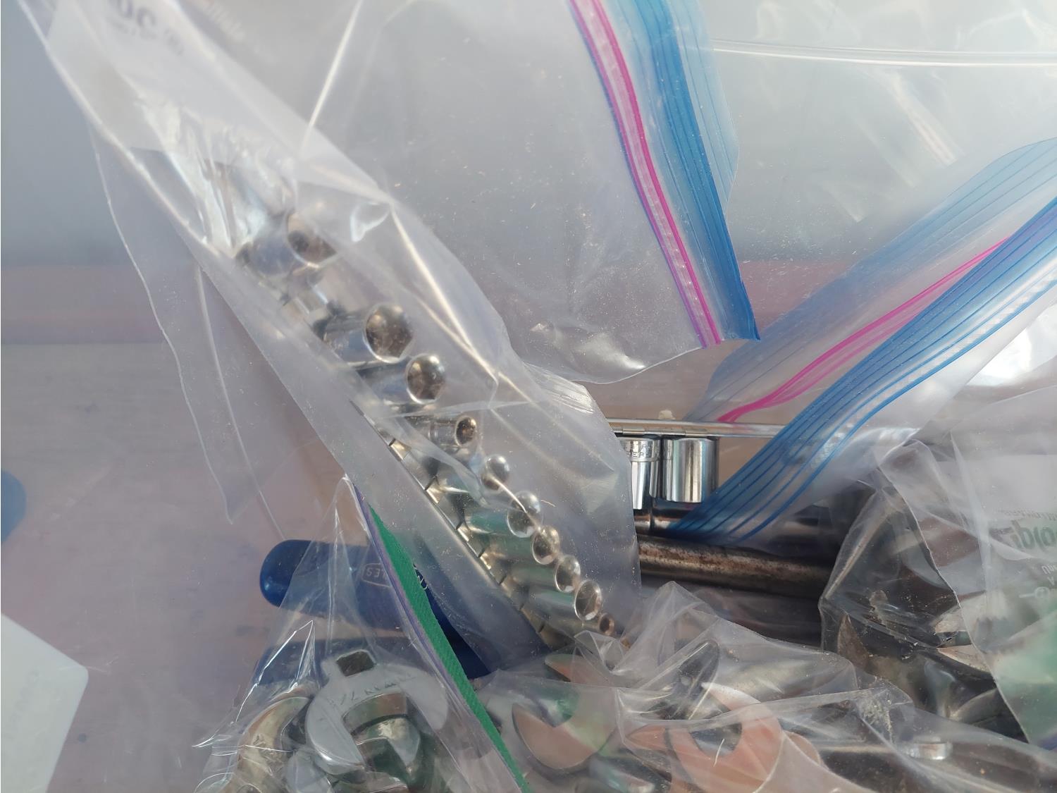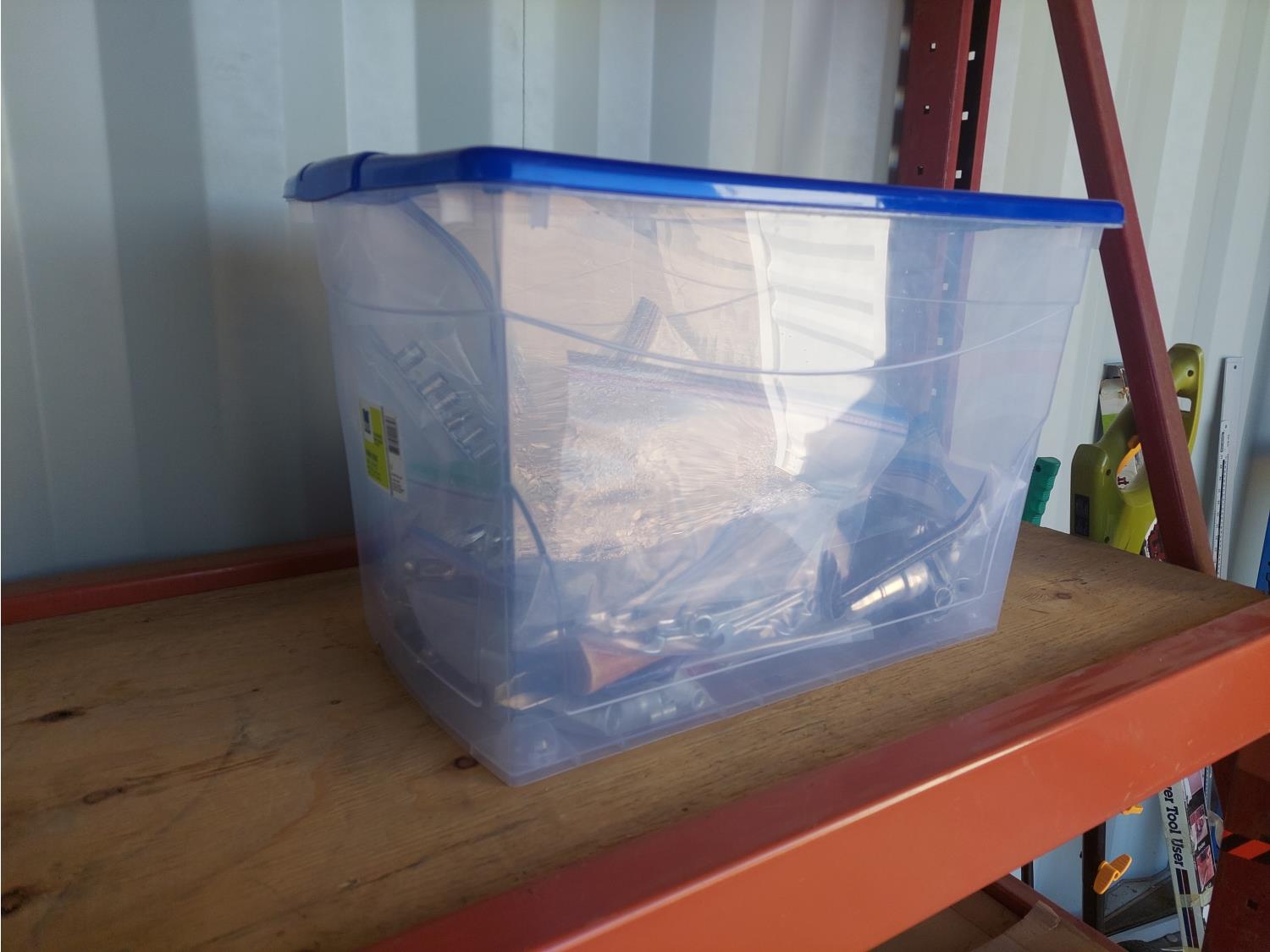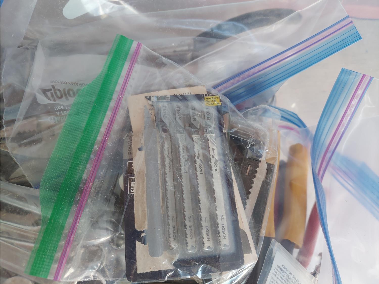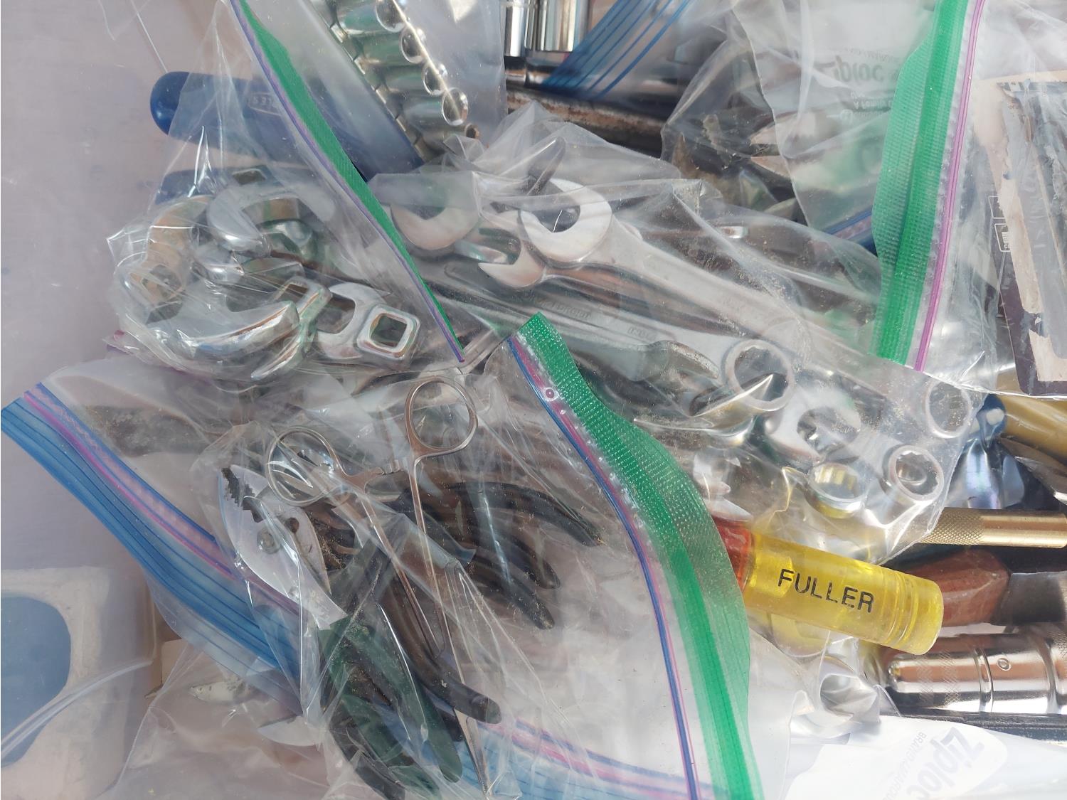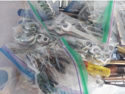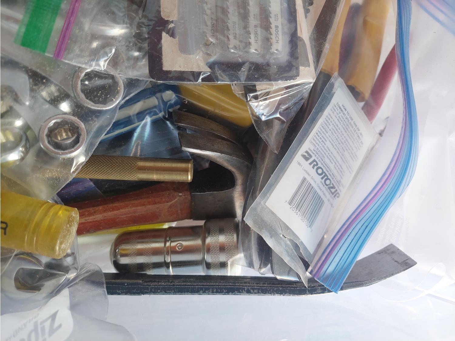 includes open end wrenches, sockets, claw hammer, battery post cleaner, and jig saw blades