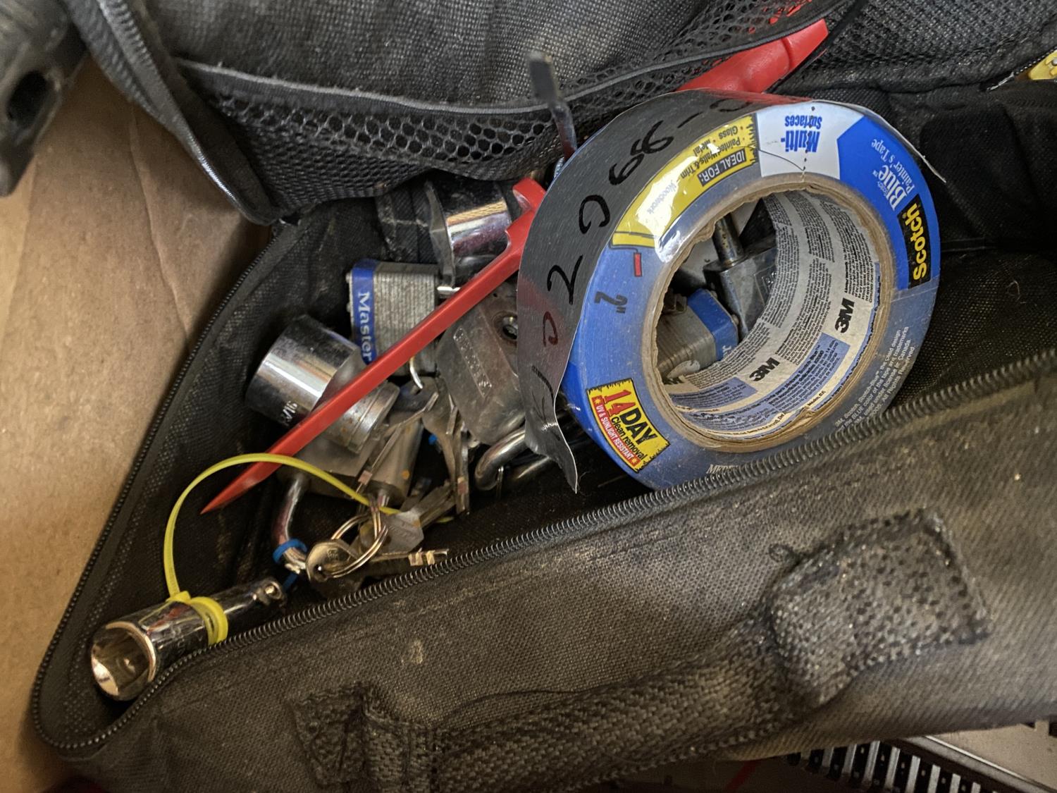 includes squeegee, tape, miscellaneous sockets, tape measure