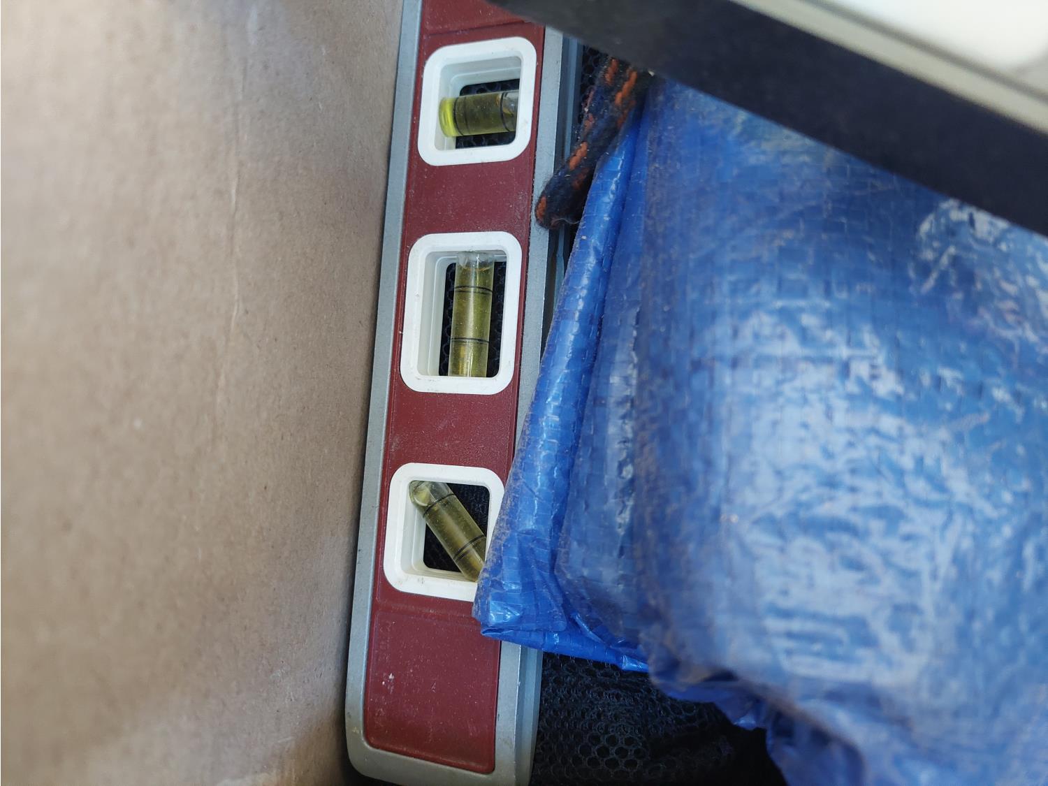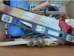 includes bubble levels, measuring tape, tarp, and ear muffs
