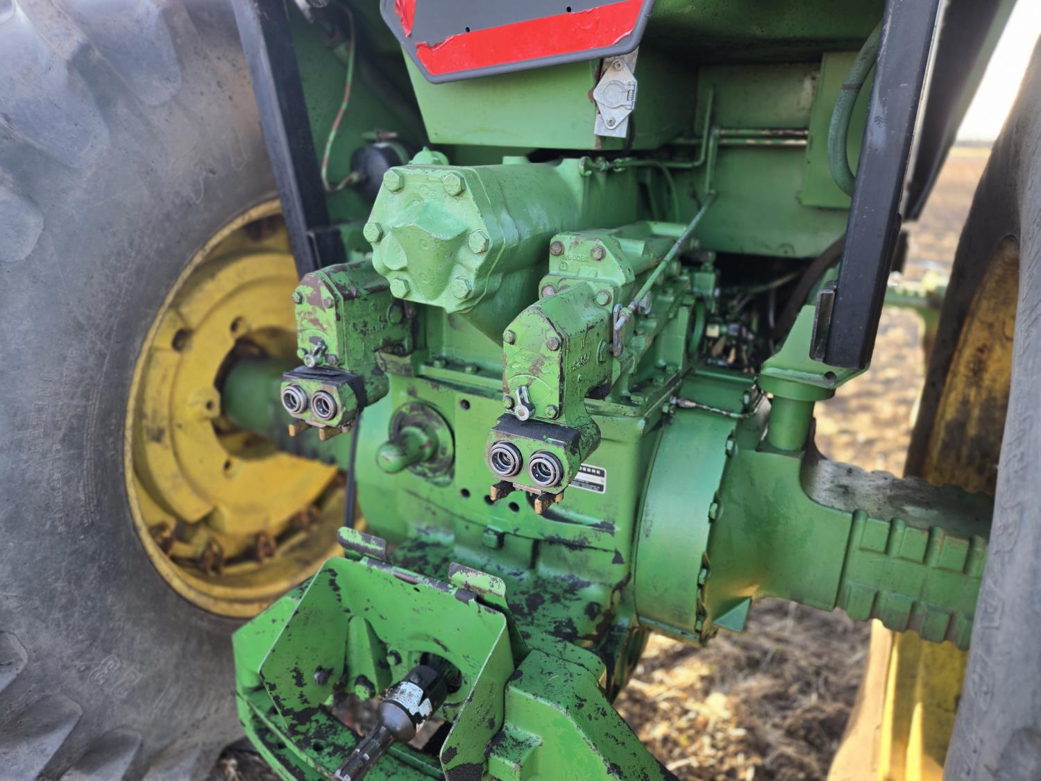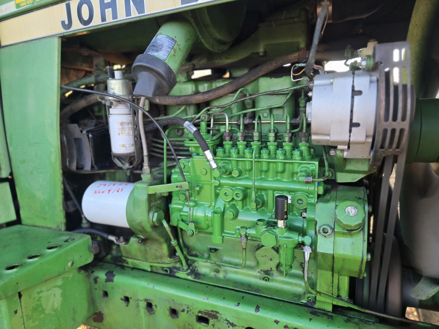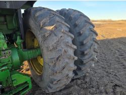 John Deere 7.6 L 6 cylinder engine, 180 PTO HP, 8 speed power shift transmission, cab, rear differential lock, A/C, radio, Big 1000 PTO, 2 rear hydraulic outlets, rear wheel weights, 11.00-16 front tires, 20.8-38 rear tires, factory duals