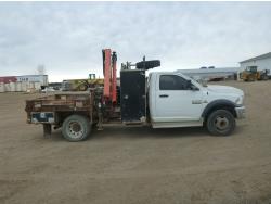 Cummins 6.7 L diesel engine, automatic transmission, A/C, P/W, P/L, cruise control, radio, stereo, running boards, 5th wheel pin hitch, aluminum tool boxes, 6 ft deck, beacons, saddle boxes, Palfinger PK6501 3 section knuckle front mount crane, outriggers, 225/70R19.5 tires