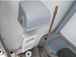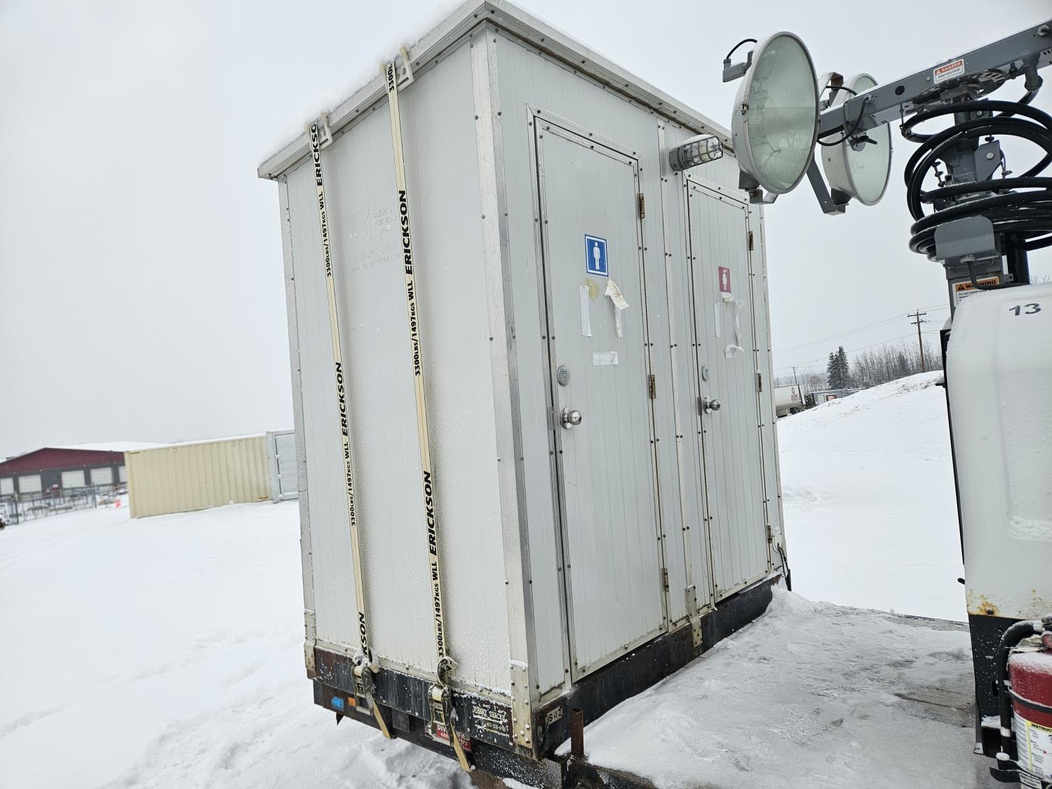 82 inch wide deck, wood deck, spring suspension, ball hitch, tool / storage box, stake pockets, Allmand Maxi-Lite II light tower, Isuzu 4 cyl diesel engine, insulated heated dual bathroom, slip tank w/electric pump, dumpster , 7000 lb axles, 235/80R16 tires