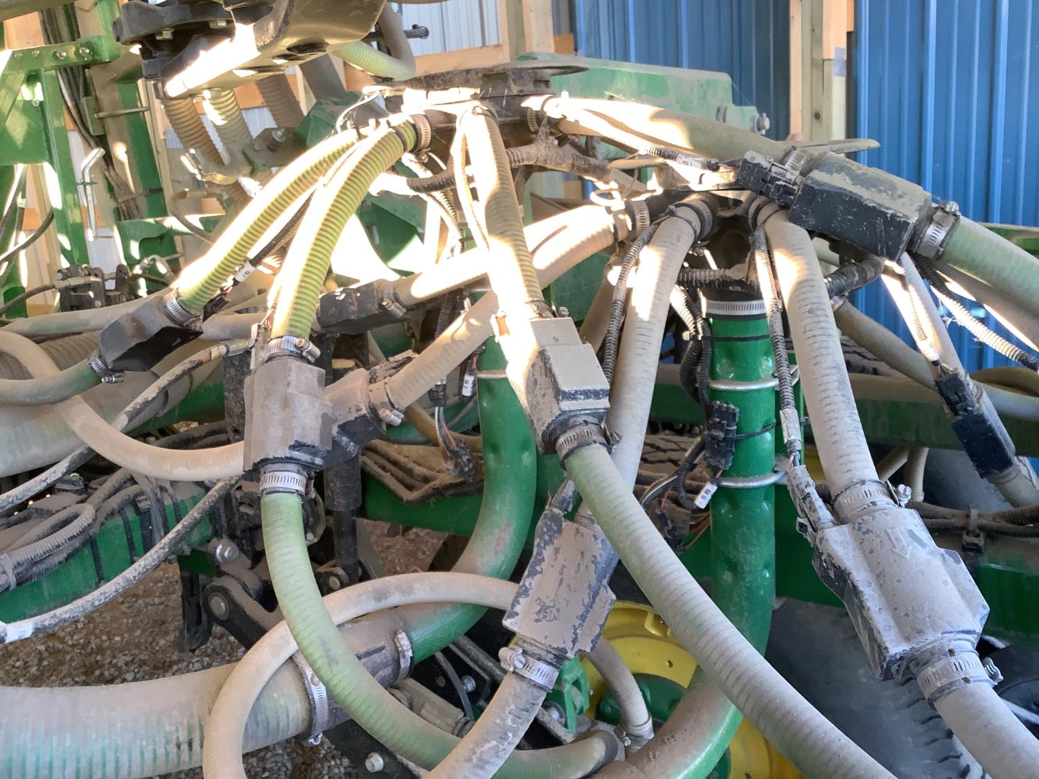 12- inch spacing mud proof side band fertilizer openers, double shoot, dual air fans, belt loading conveyor c/w 2 controllers one is wireless control stainless manifolds, seed/fertilizer all run blockage monitors, inside tank cameras, 4 metering rollers, hydraulic powered calibration, sectional command variable rate control, air powered primaries, dual 520/85R42 tires