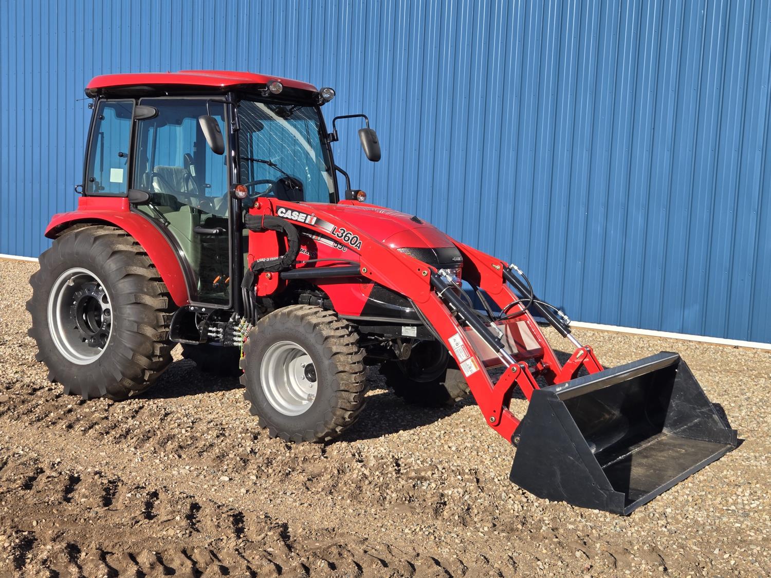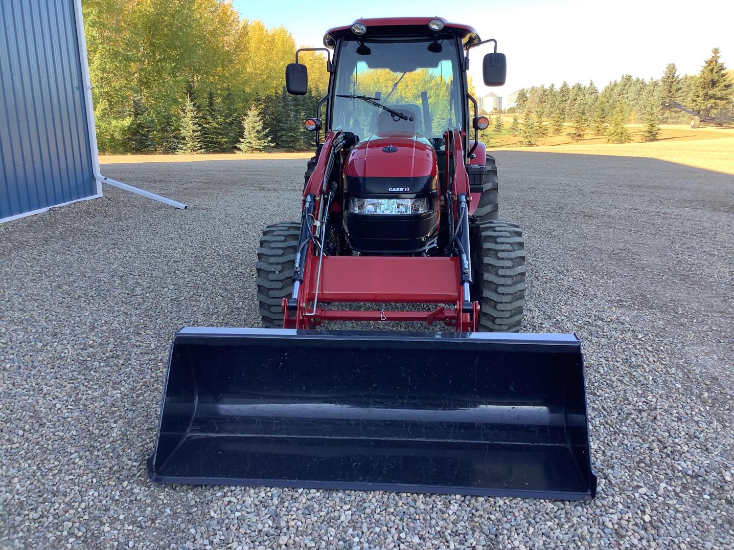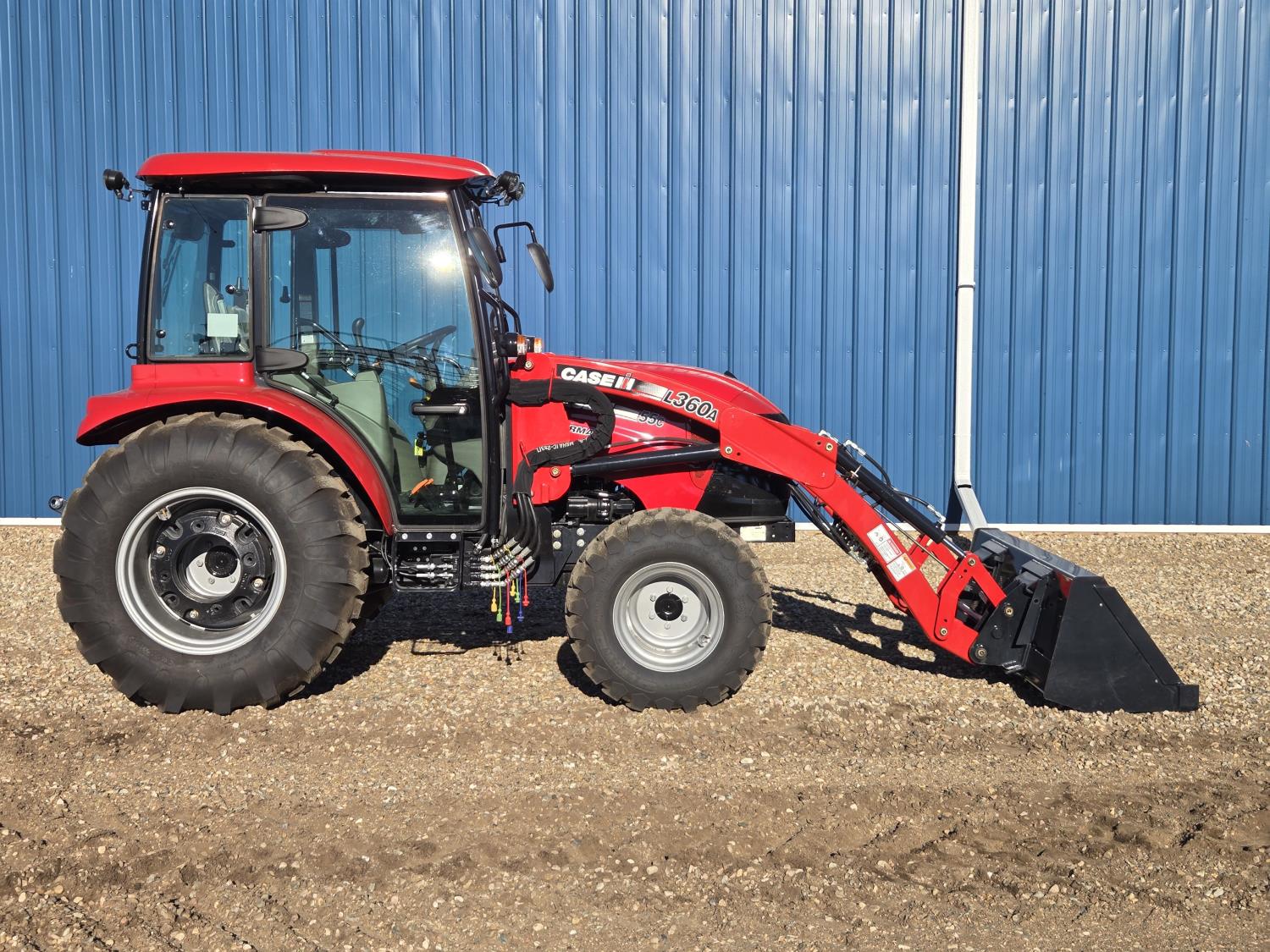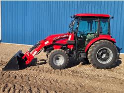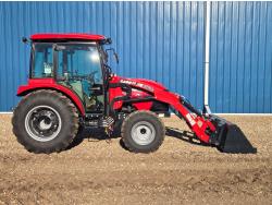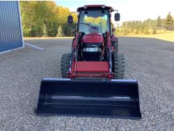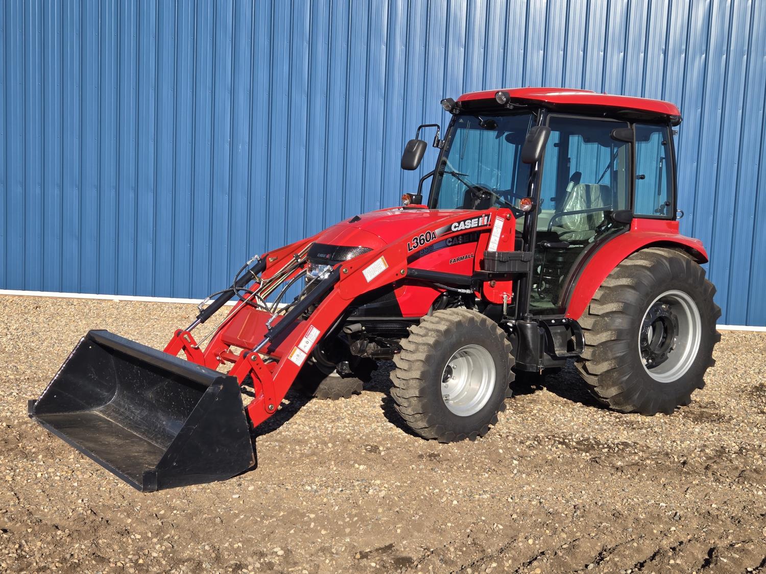 Case IH 360A loader, Q/A, 72 inch bucket, mid mount hydraulic connection, FPT 2.2 L 3 cylinder 54 HP, diesel engine, 43 PTO HP, hydro 3 range transmission, cab, rear differential lock, A/C, radio, heater, 3 point hitch, 2 rear hydraulic outlets, rear wheel weights, 12-16.5 front tires, 17.5L-24 rear tires