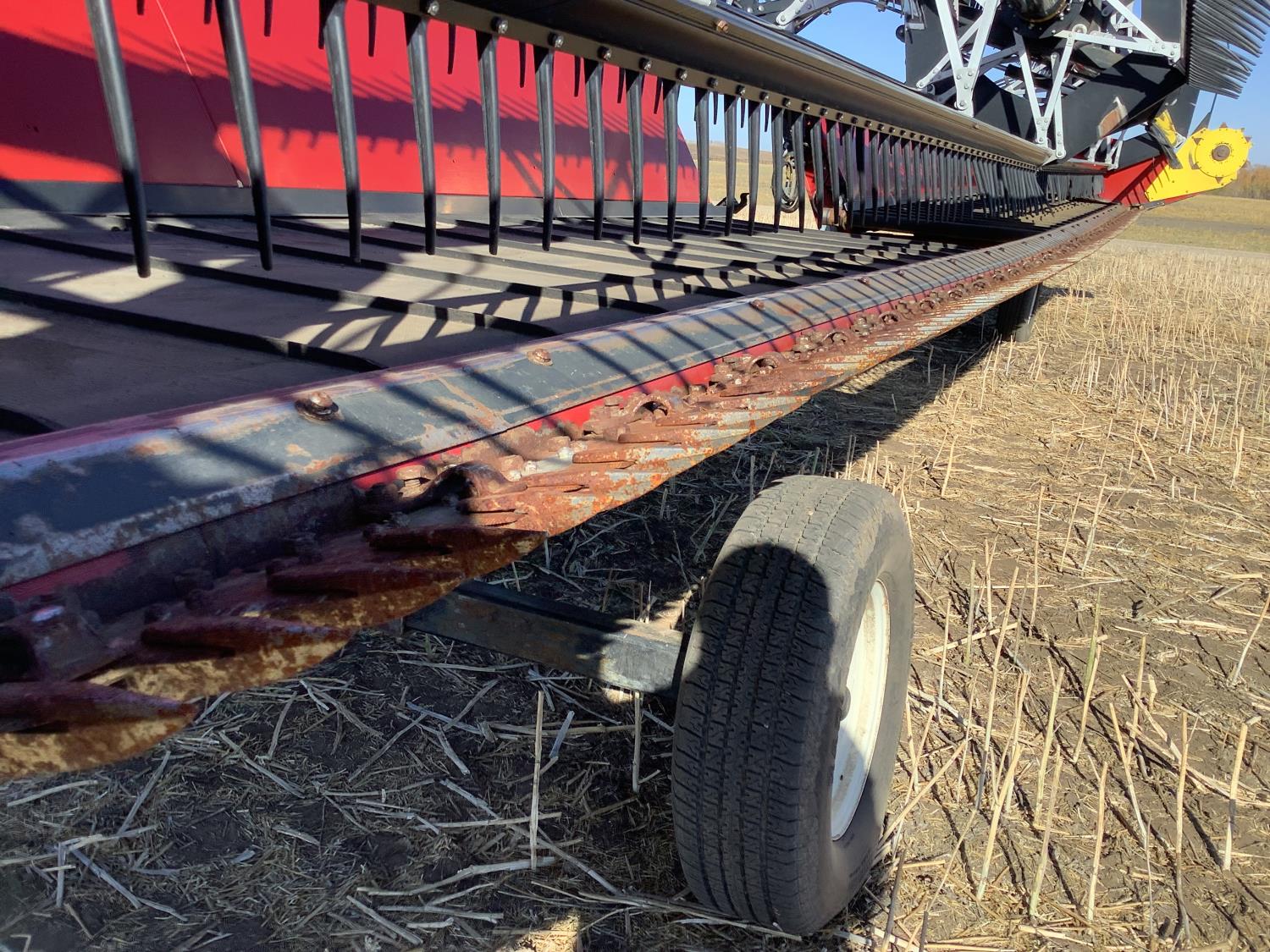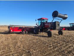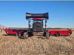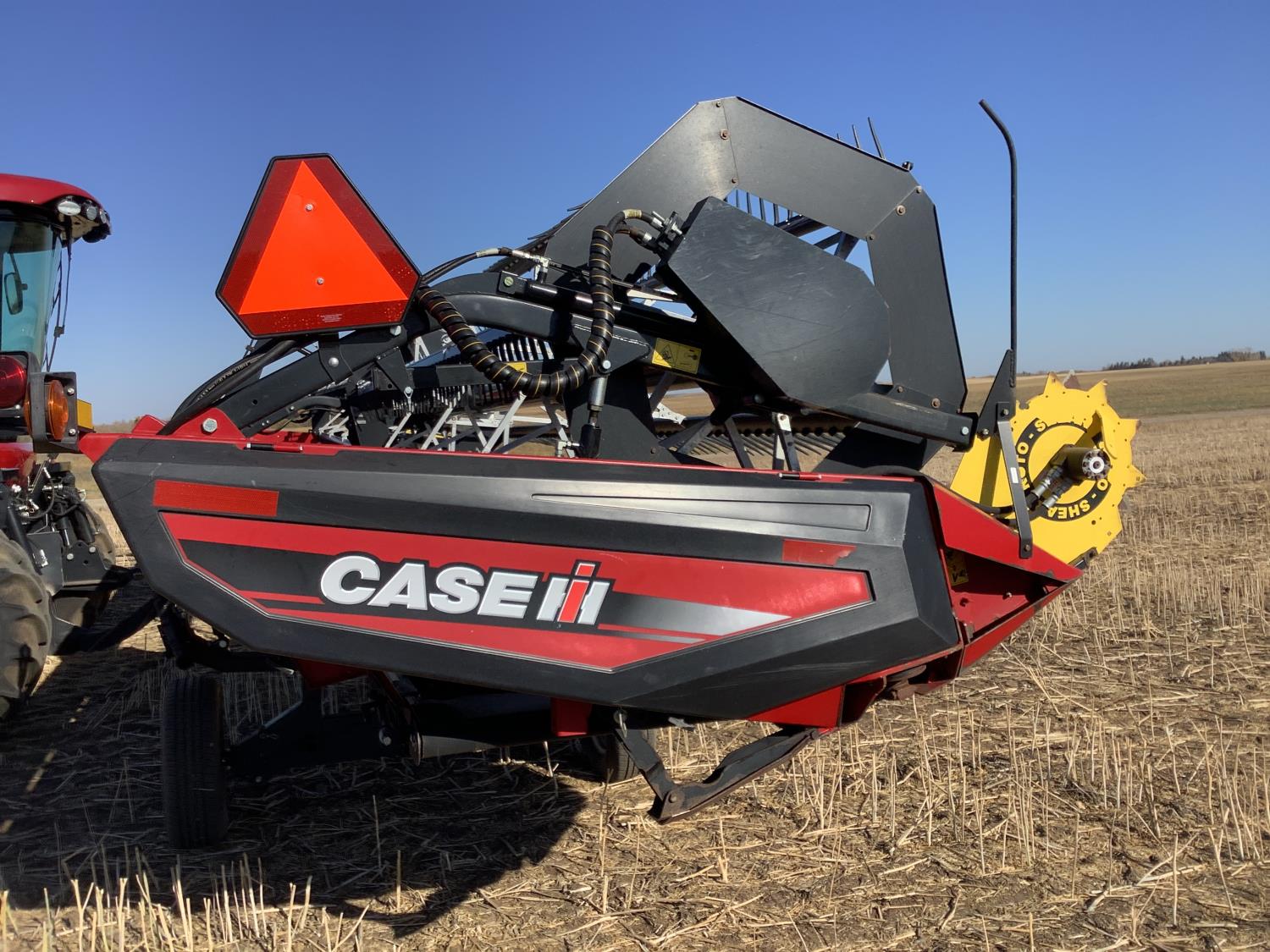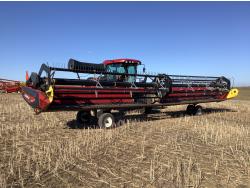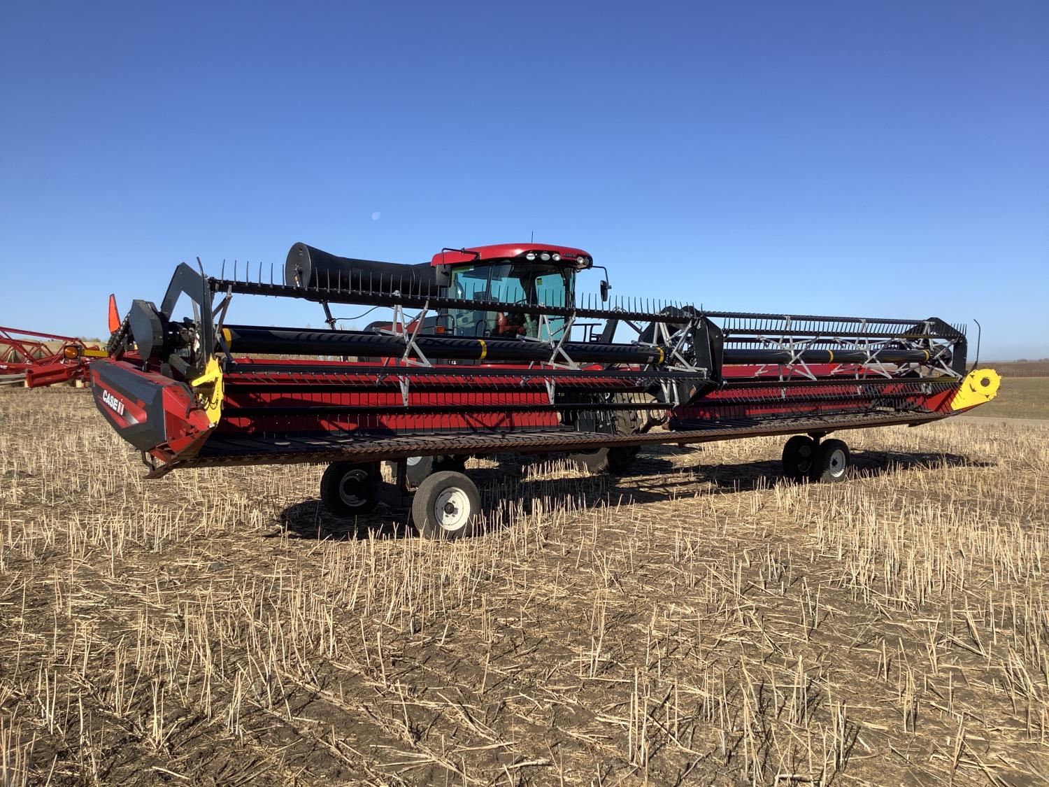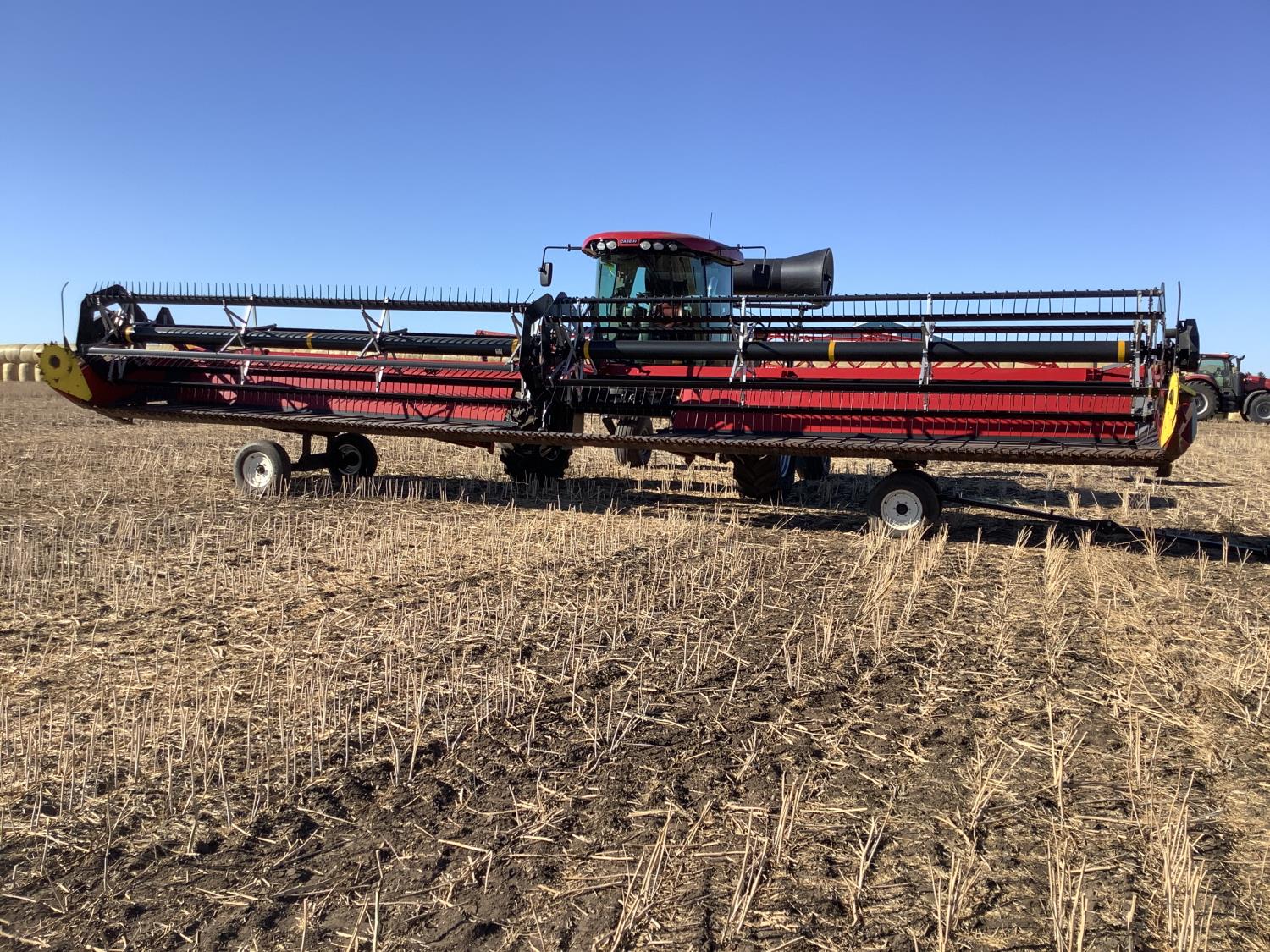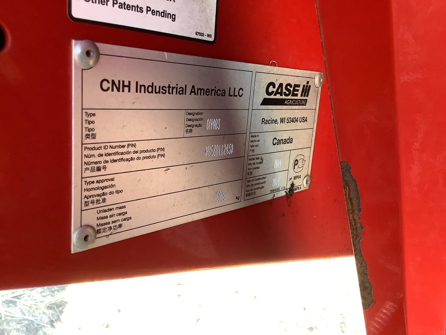 2014 Case IH 403 center delivery rigid draper header, split pickup reel, fore & aft, gauge wheels, Roto Shear crop dividers, swath roller, header transport, A/C, radio, buddy seat, air ride suspension, 600/65R28 front tires