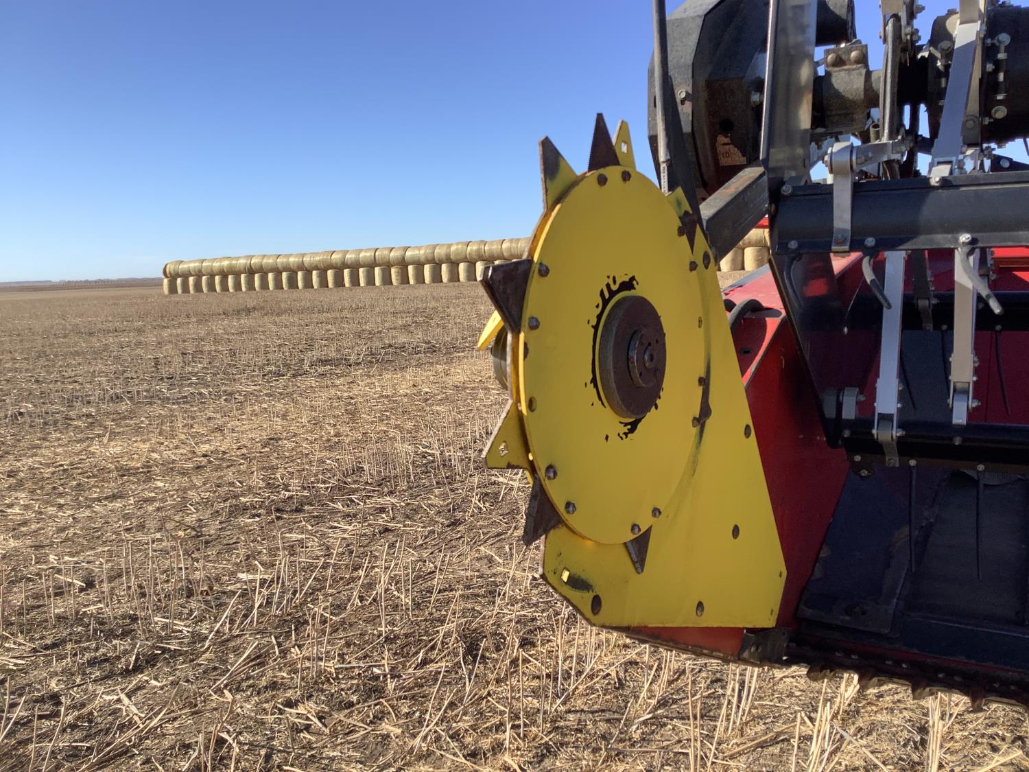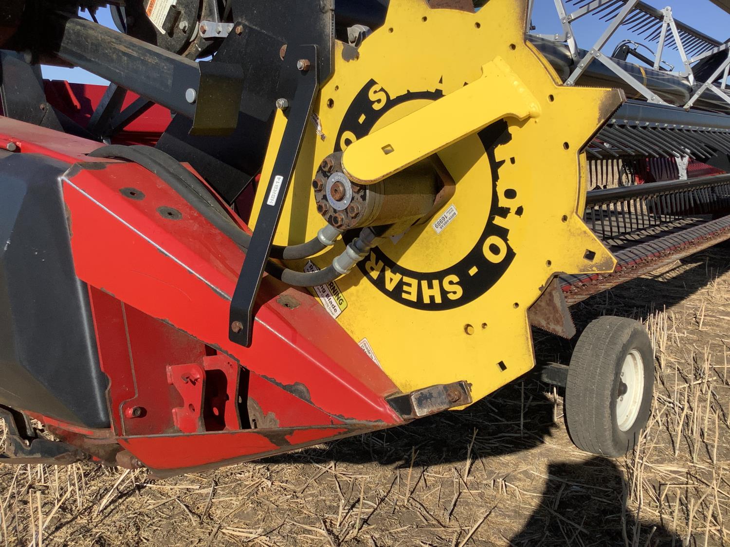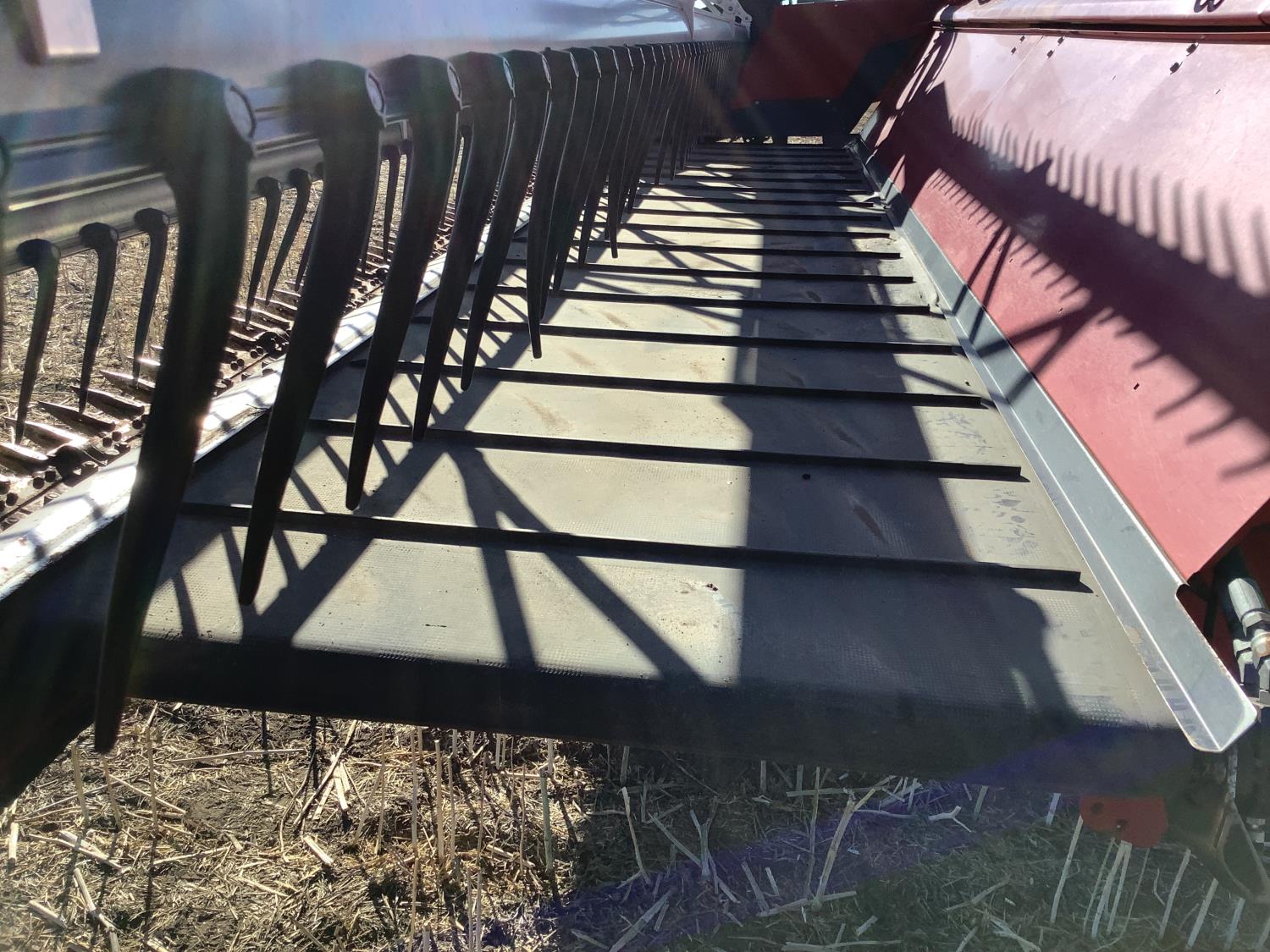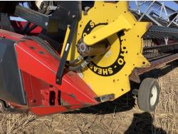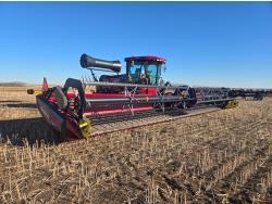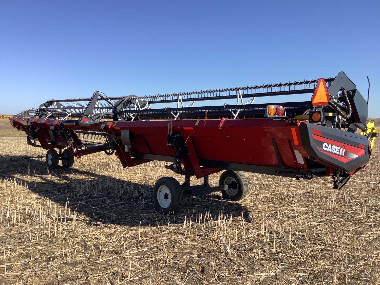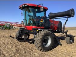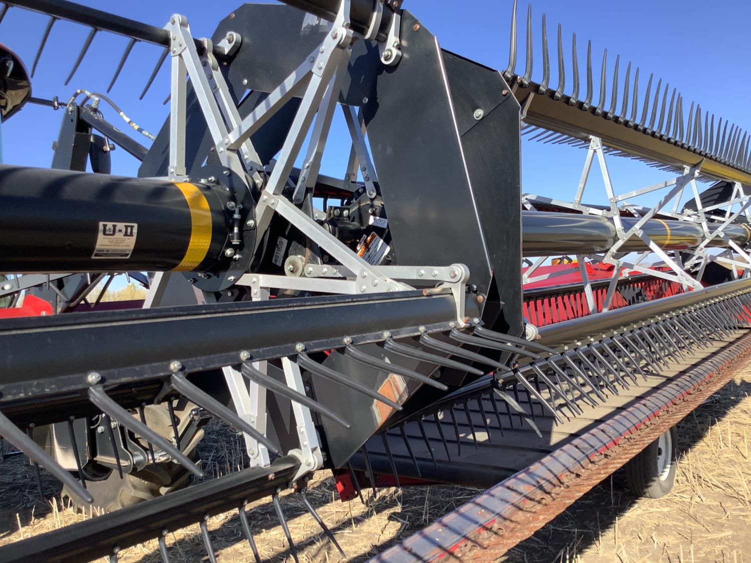 2014 Case IH 403 center delivery rigid draper header, split pickup reel, fore & aft, gauge wheels, Roto Shear crop dividers, swath roller, header transport, A/C, radio, buddy seat, air ride suspension, 600/65R28 front tires
