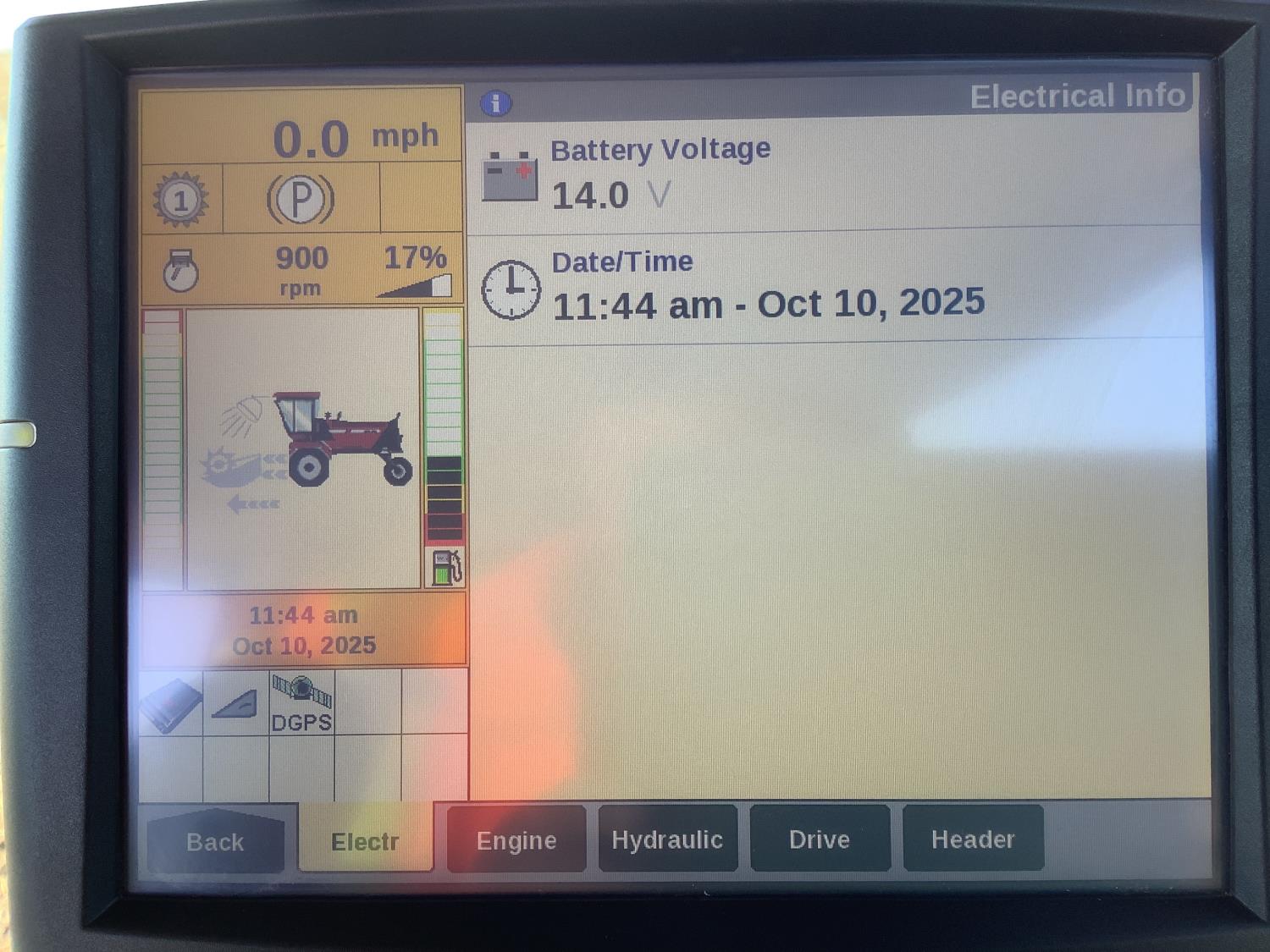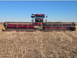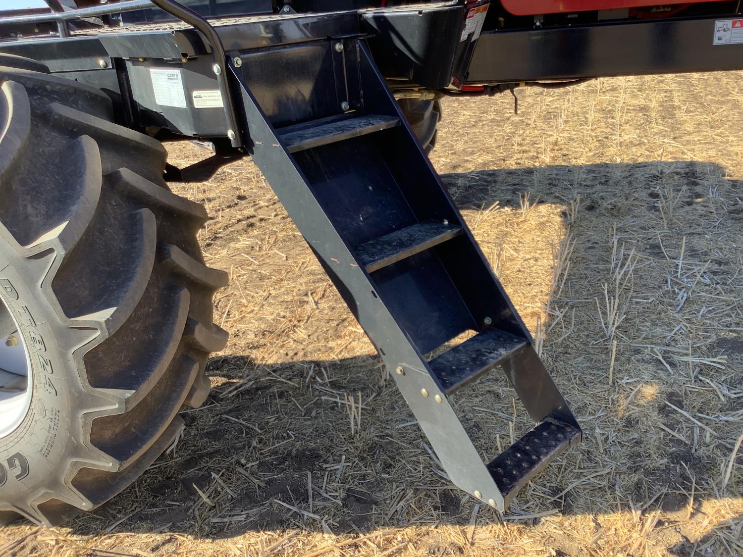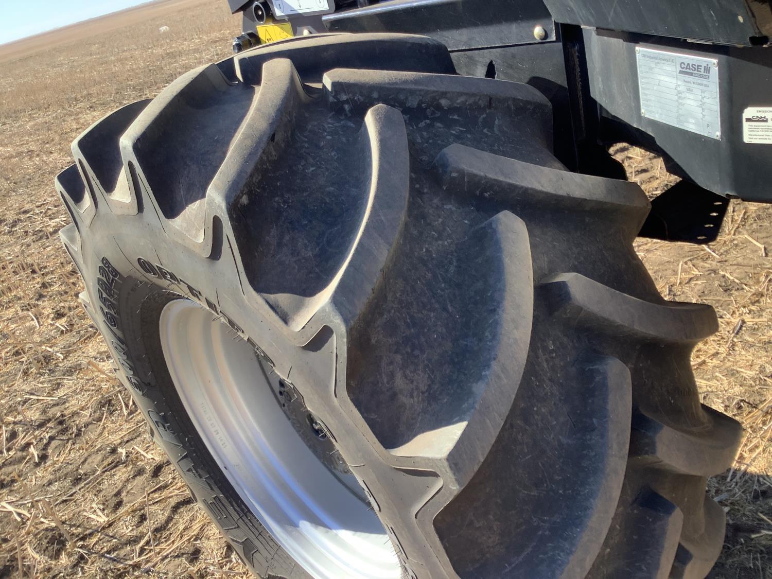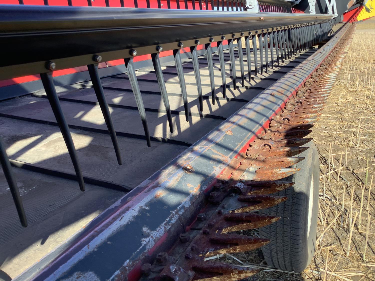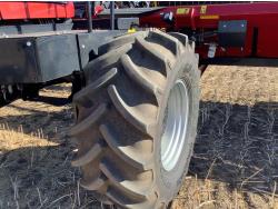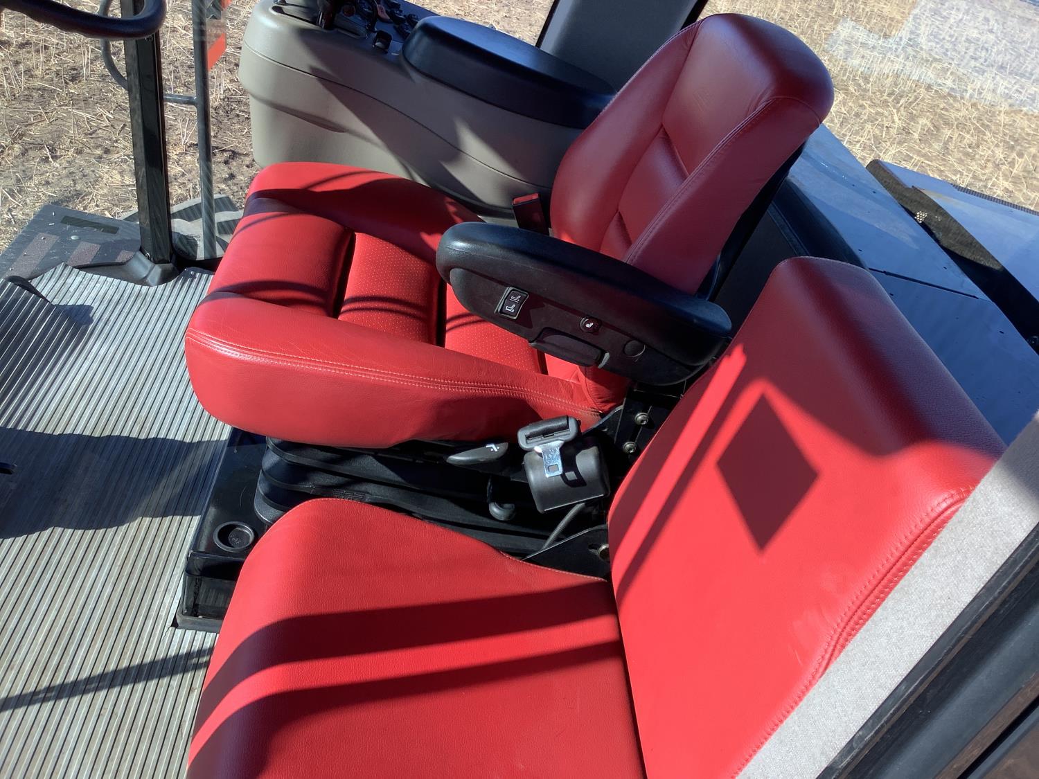 2014 Case IH 403 center delivery rigid draper header, split pickup reel, fore & aft, gauge wheels, Roto Shear crop dividers, swath roller, header transport, A/C, radio, buddy seat, air ride suspension, 600/65R28 front tires