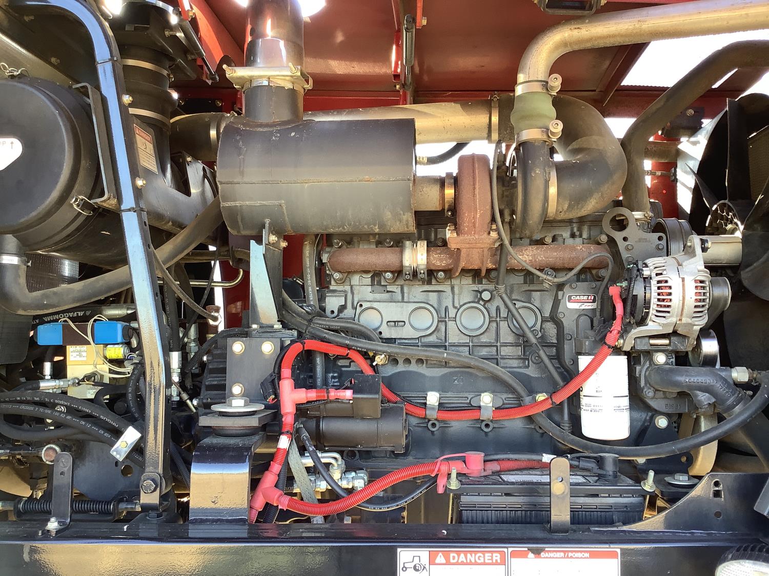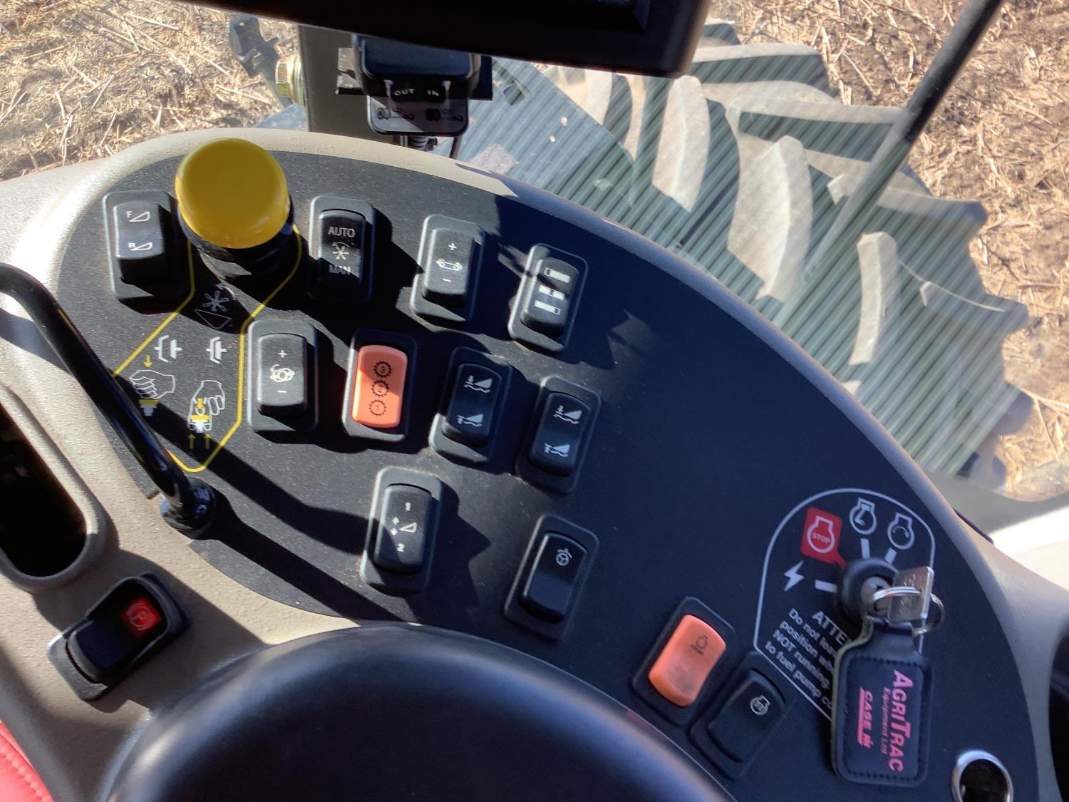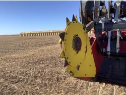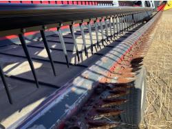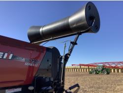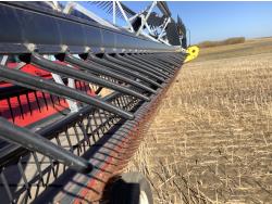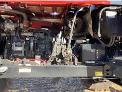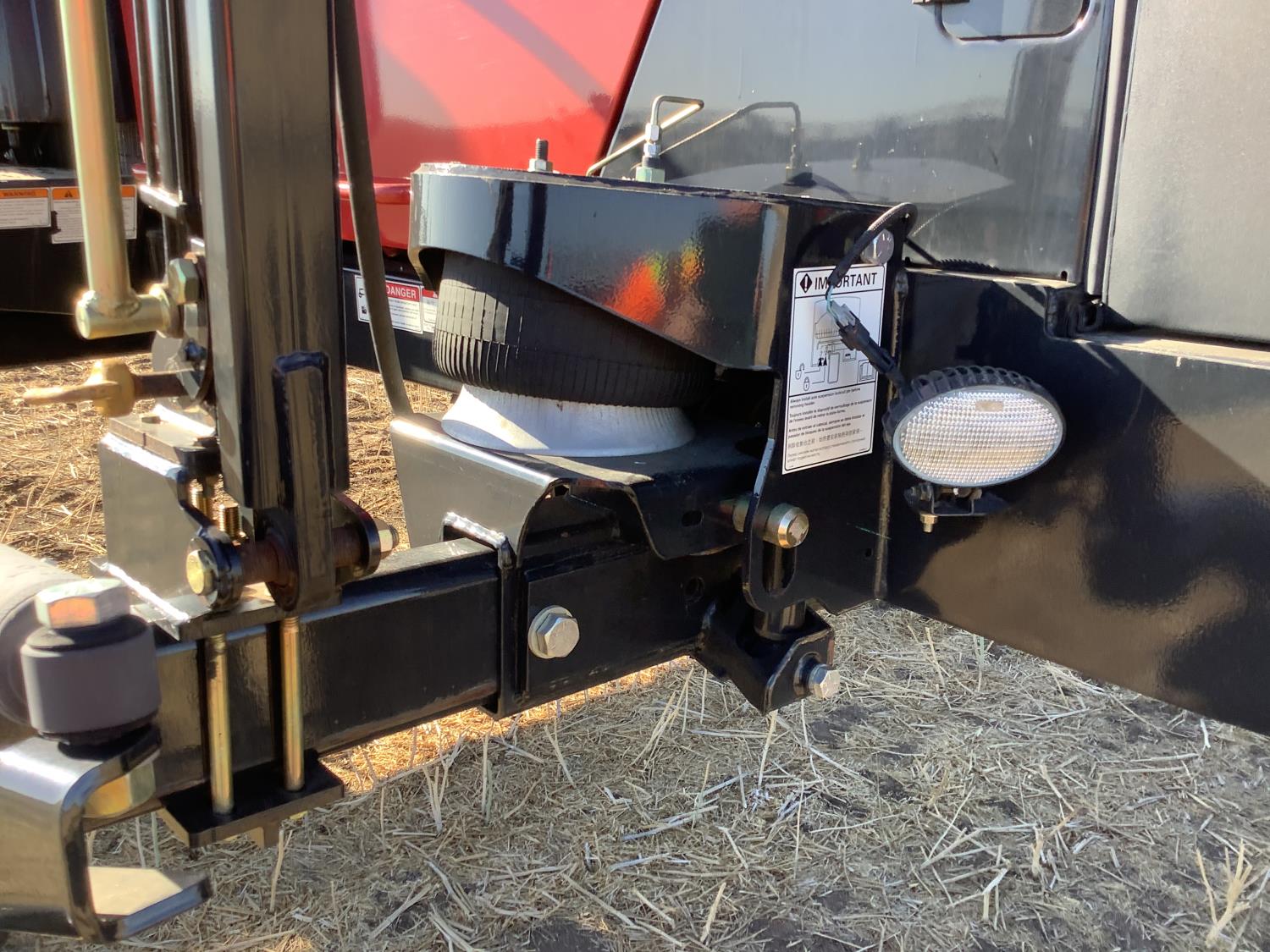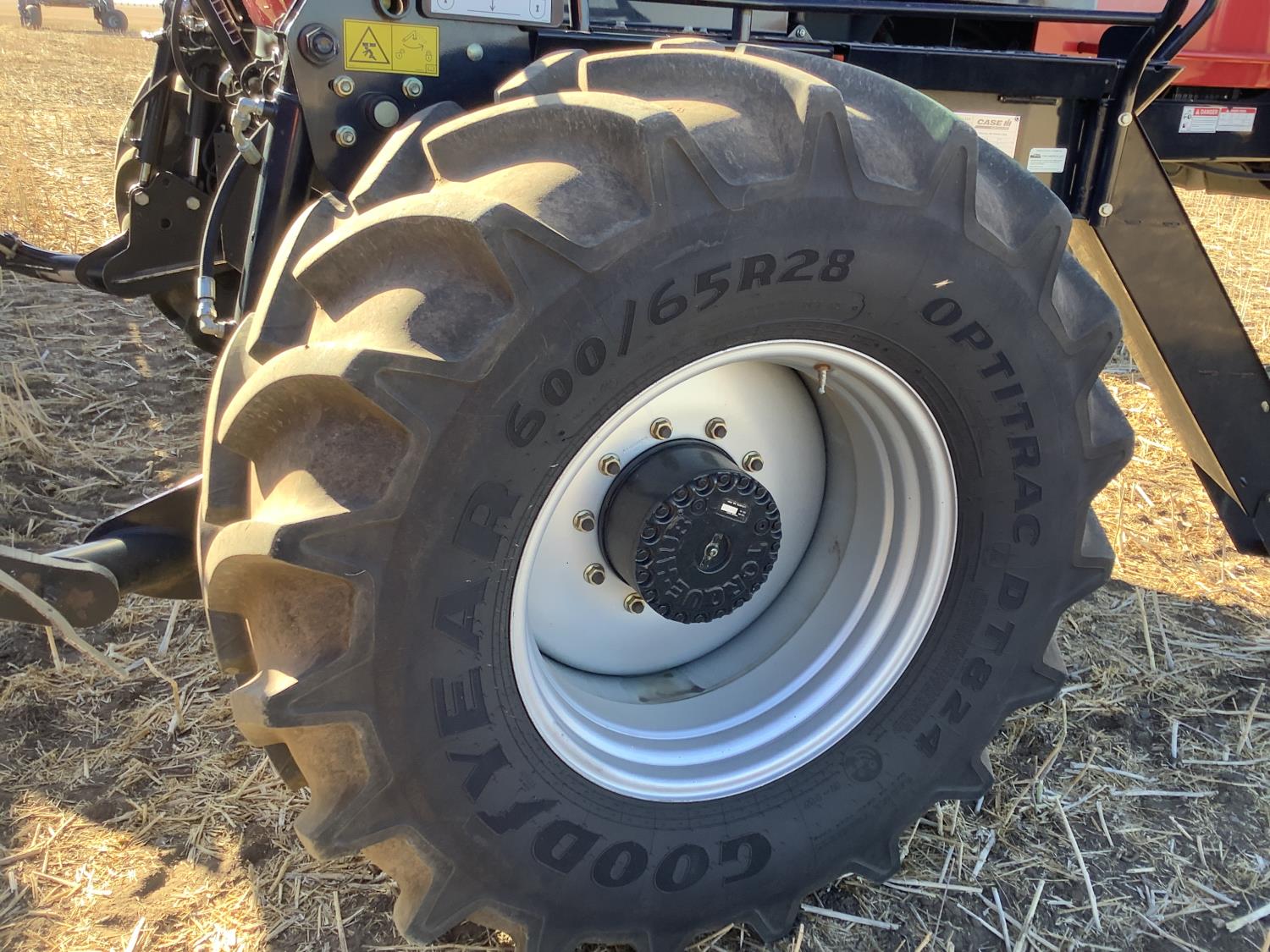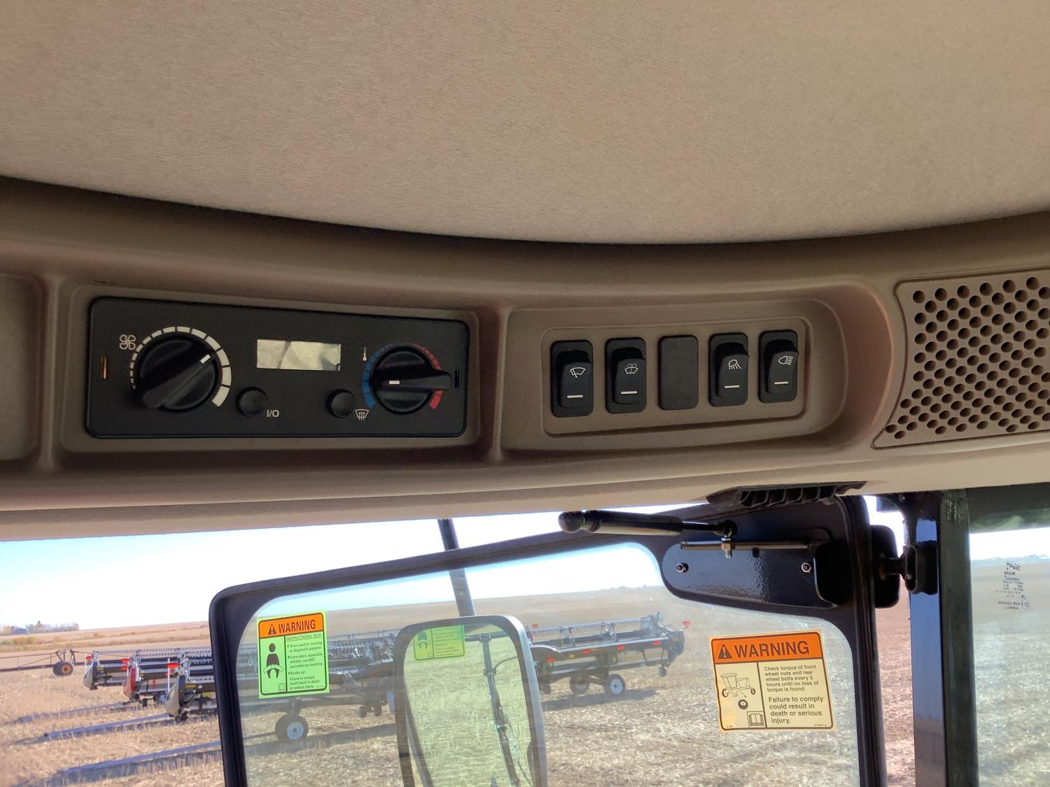 2014 Case IH 403 center delivery rigid draper header, split pickup reel, fore & aft, gauge wheels, Roto Shear crop dividers, swath roller, header transport, A/C, radio, buddy seat, air ride suspension, 600/65R28 front tires