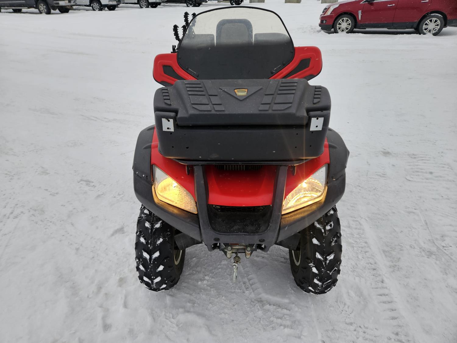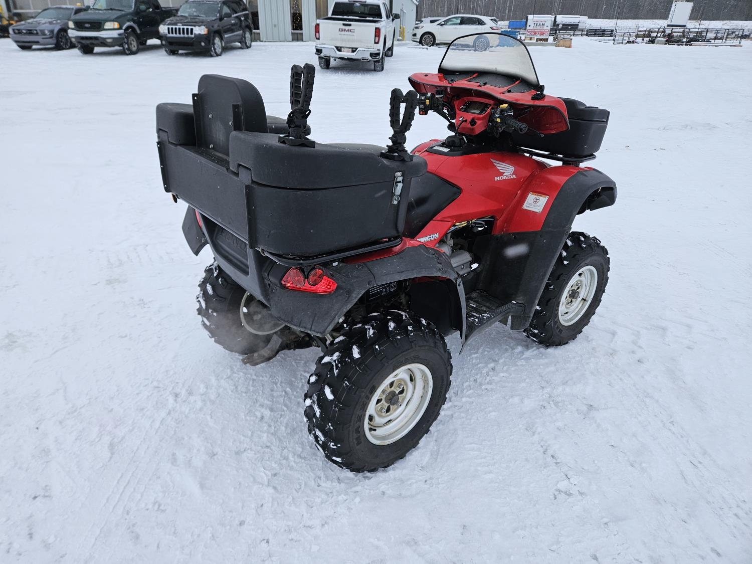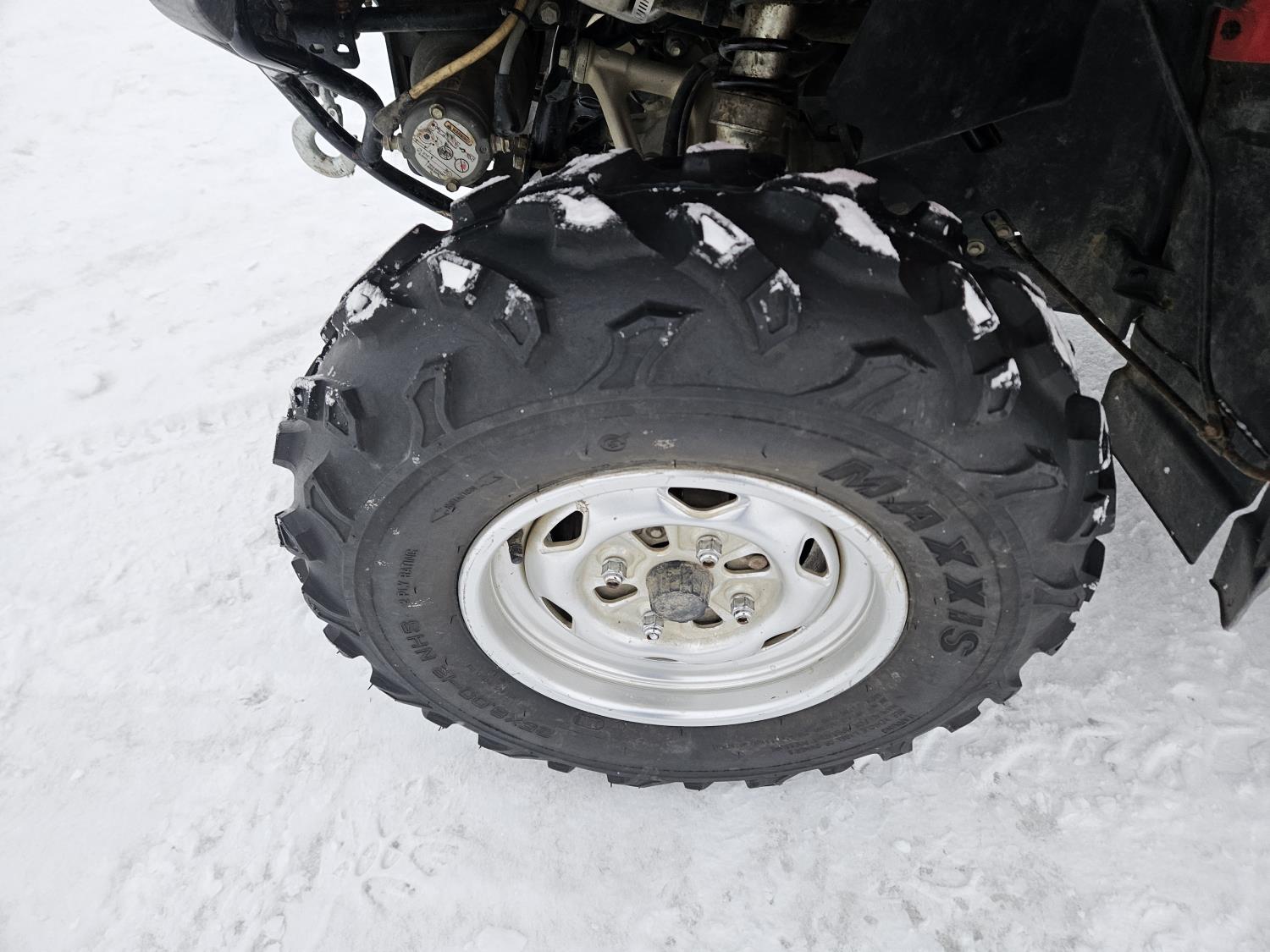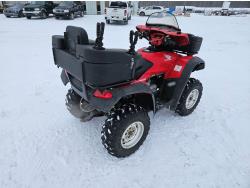 650 cc fuel injected engine, manual transmission, electric shift, reverse, hitch, front and rear racks, buddy seat, front winch, windshield, cargo box, gun rack, 25X8.00-12 front tires, 25X10.00-12 rear tires