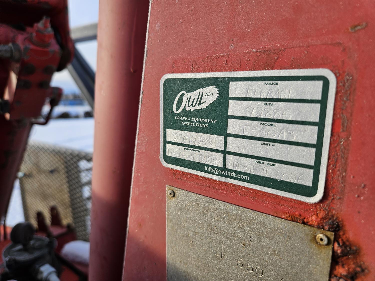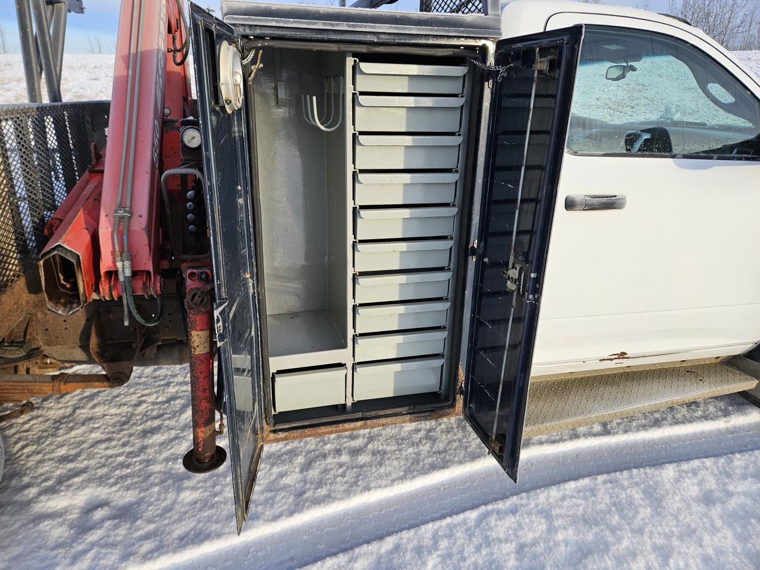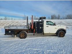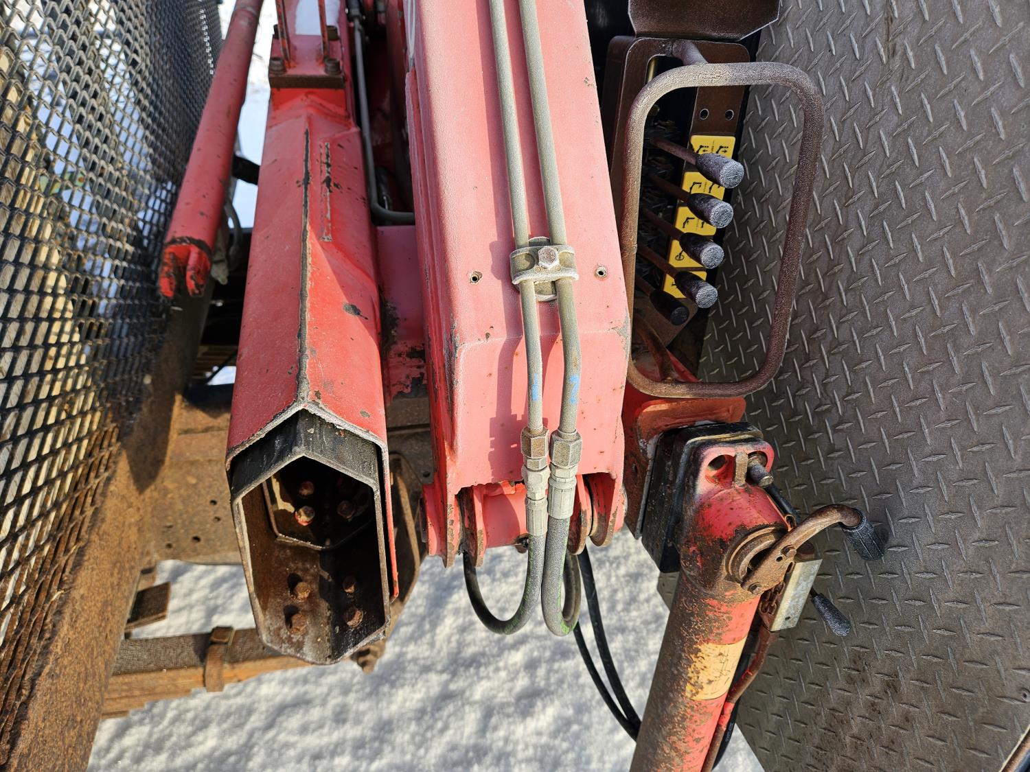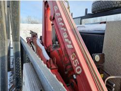 Cummins 6.7 L 6 cylinder diesel engine, engine brake, electric engine block heater, positive air shutoff, automatic transmission, A/C, P/W, P/L, cruise control, stereo, running boards, 94 inch x 7 ft deck, Ferrari 550 4 section 35 ft knuckle crane, outriggers, current inspection good until March 2026, spring suspension, 7,000 lb front axle, 13,500 lb rear axles, work orders provided for reman transmission installed at appx 241,085 km , 225/70R19.5 tires