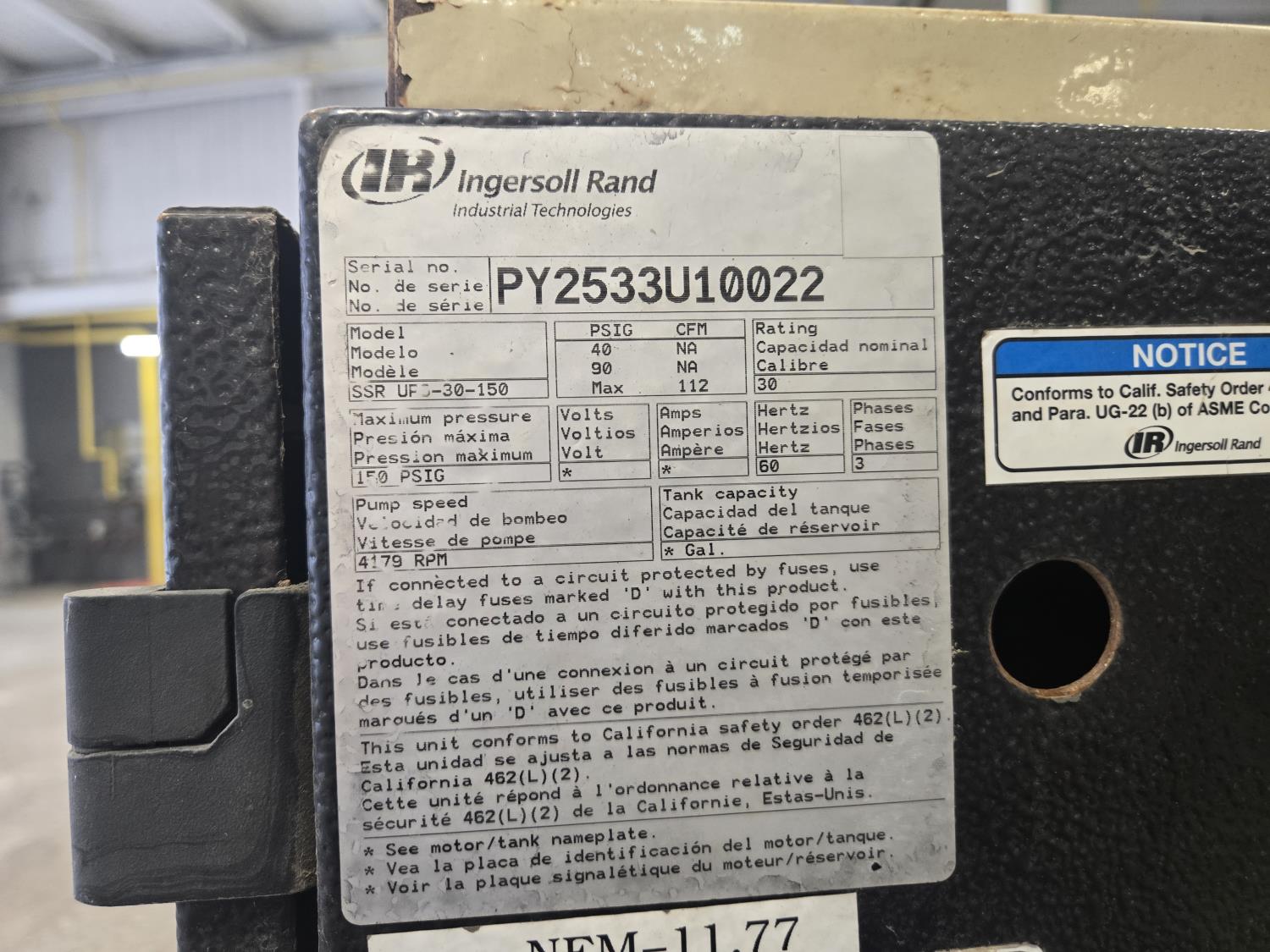 30 HP, m150 max PSI, 3 phase