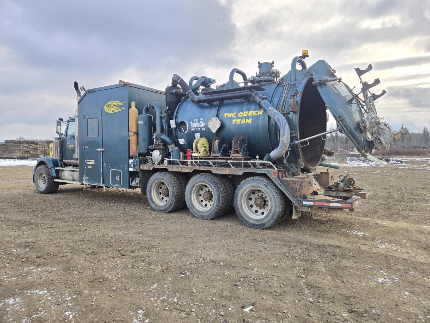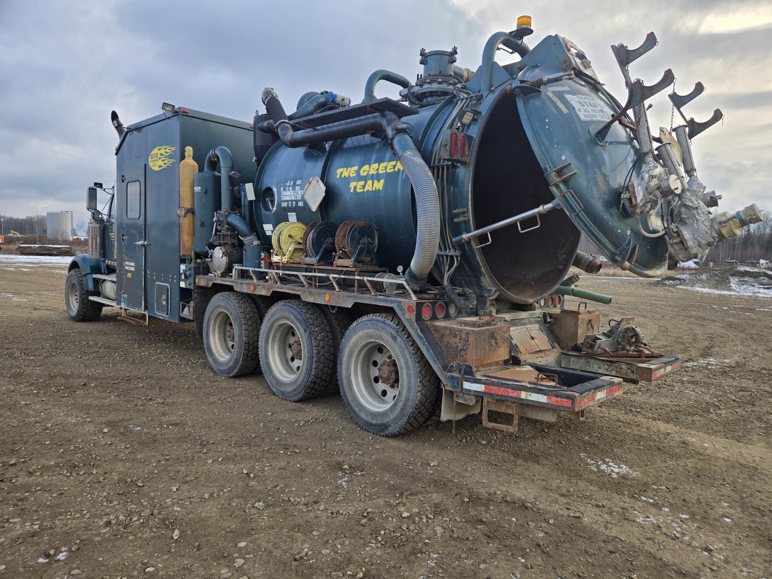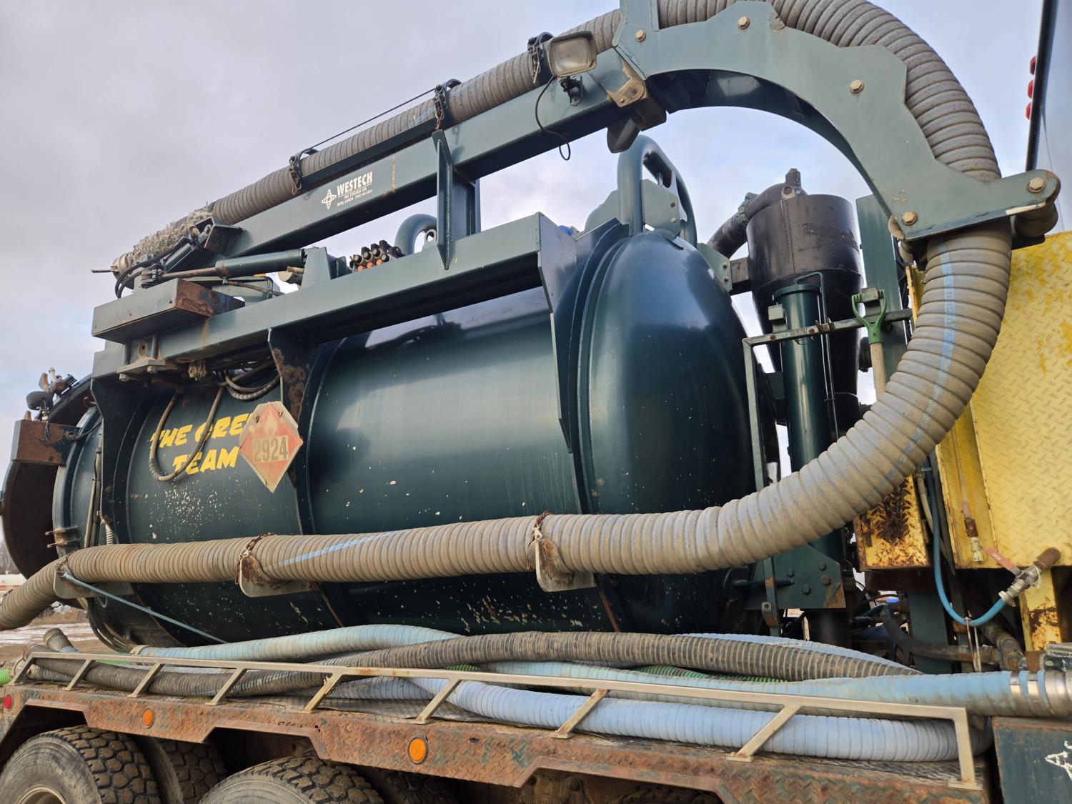 Mercedes Benz 460 HP diesel engine, 18 speed transmission, air ride suspension, full lockers, 308 inch WB, 20,000 lb front axle, 69000 lb rears, all aluminum rims, Westec Vacuum System hydro vac, Hotsy boiler, VTB820 blower, 445/65R22.5 front, 11R24.5 rear tires