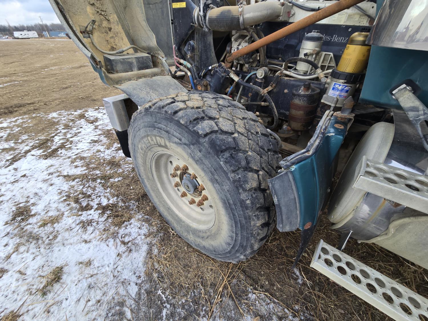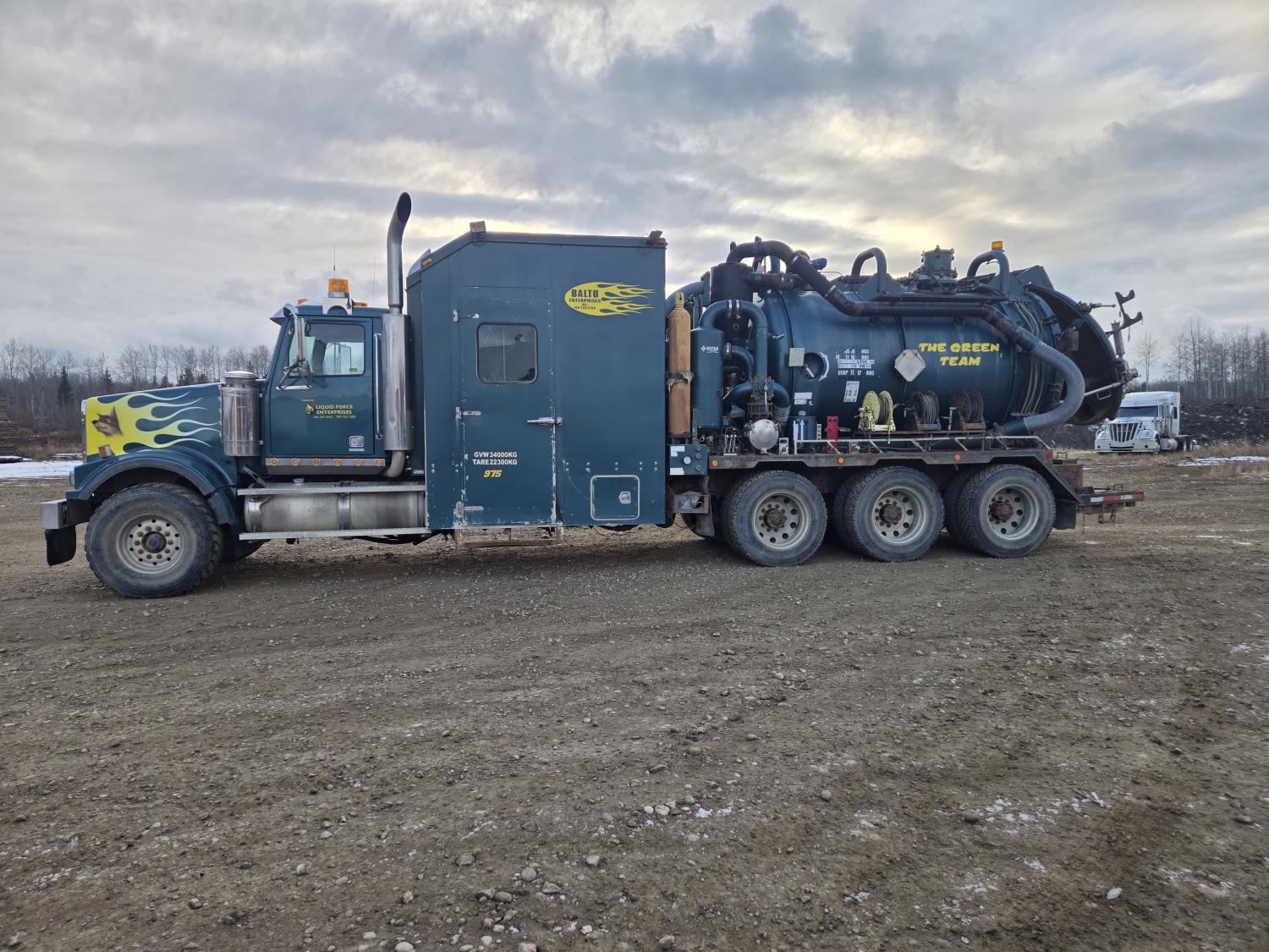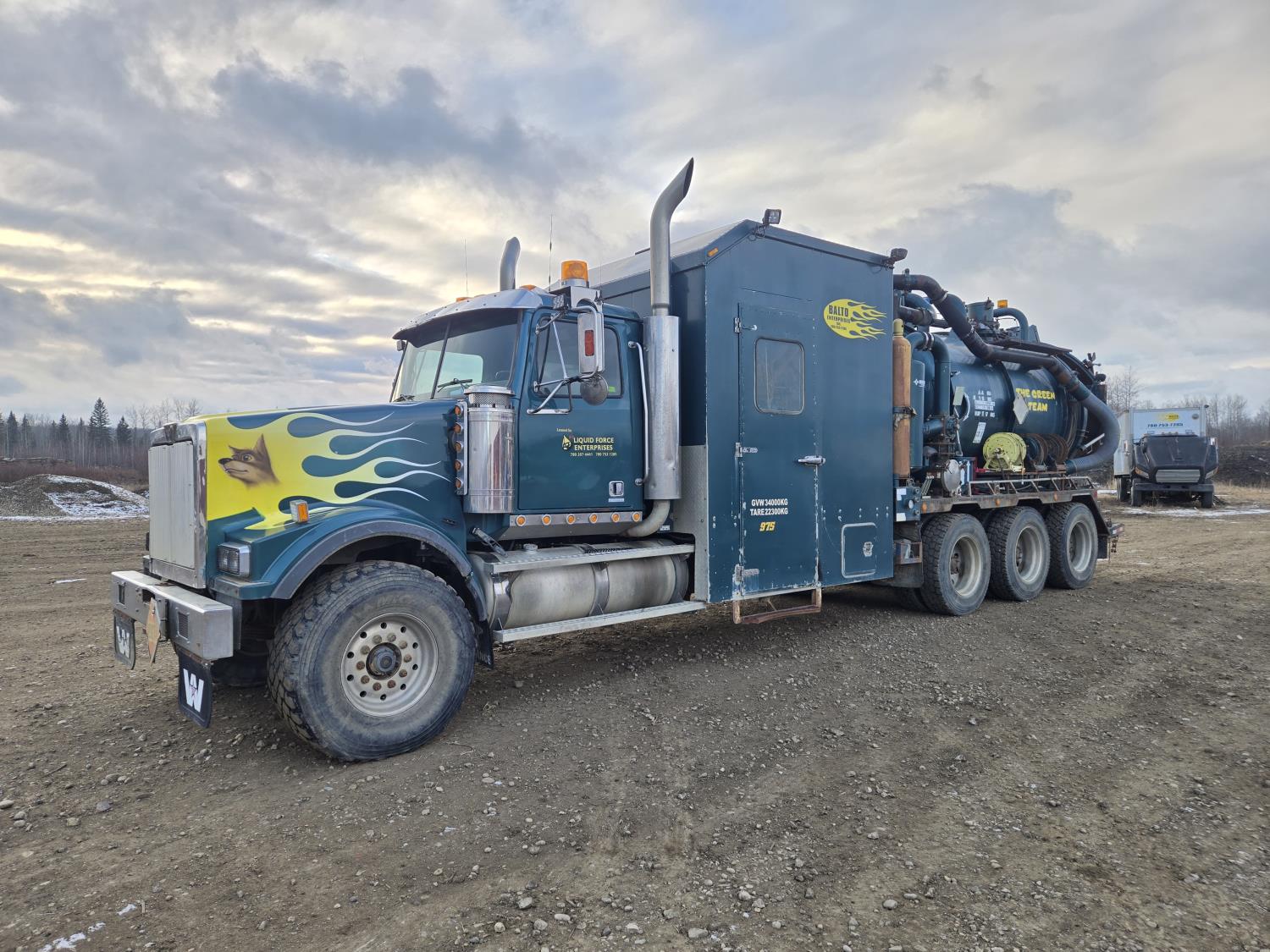 Mercedes Benz 460 HP diesel engine, 18 speed transmission, air ride suspension, full lockers, 308 inch WB, 20,000 lb front axle, 69000 lb rears, all aluminum rims, Westec Vacuum System hydro vac, Hotsy boiler, VTB820 blower, 445/65R22.5 front, 11R24.5 rear tires