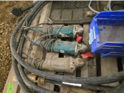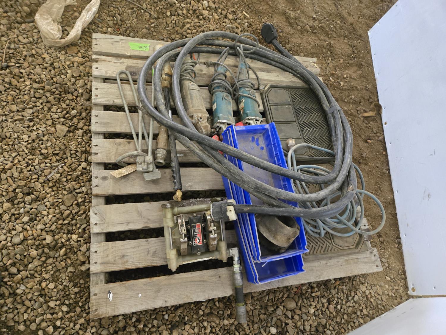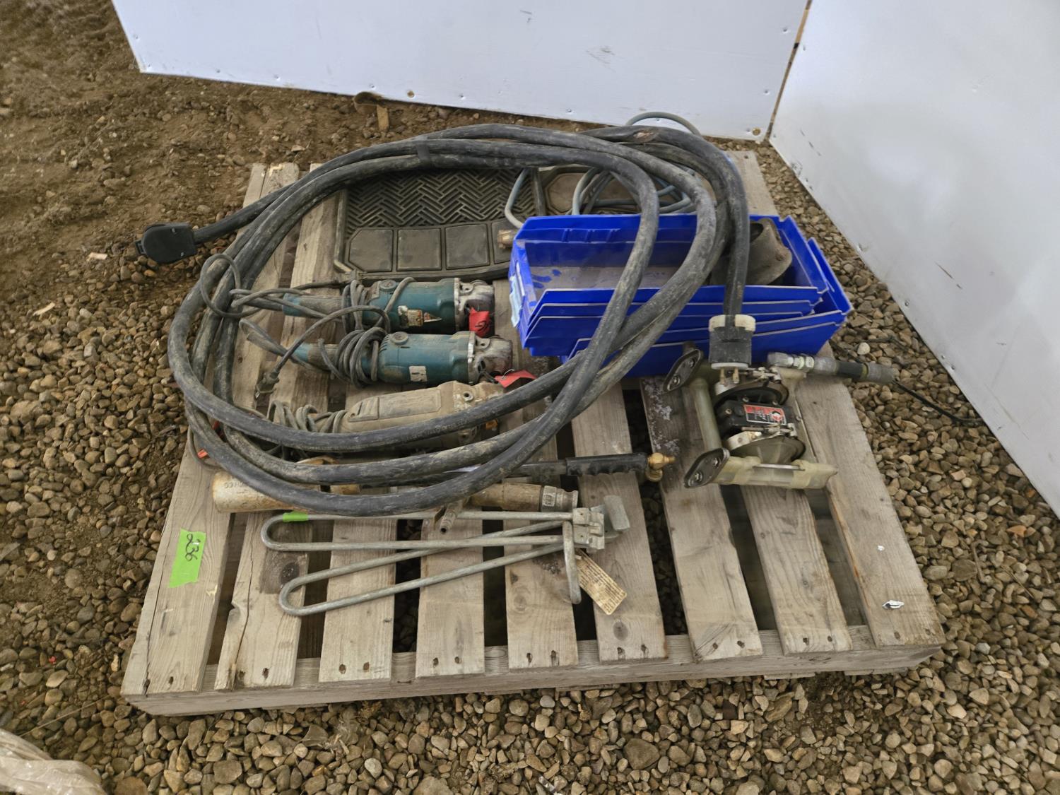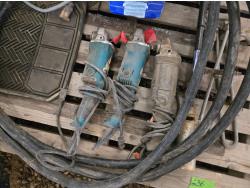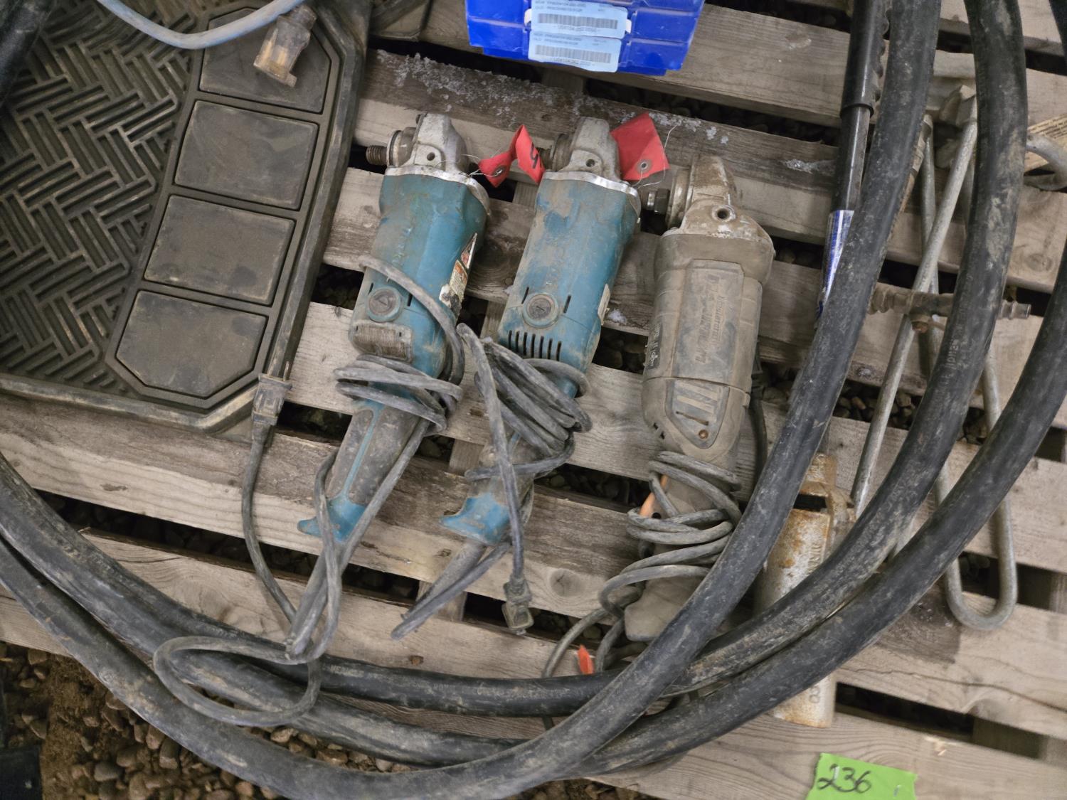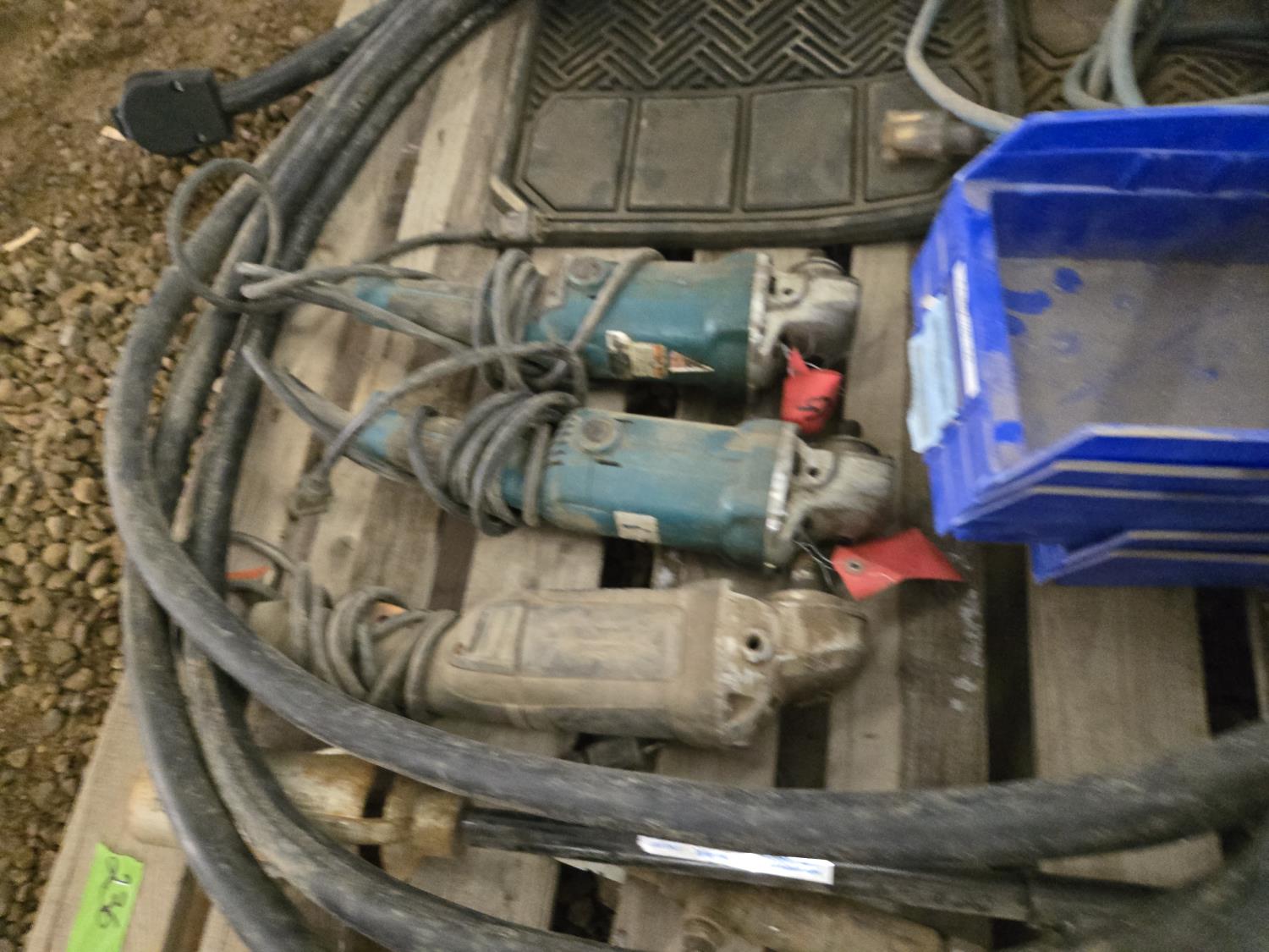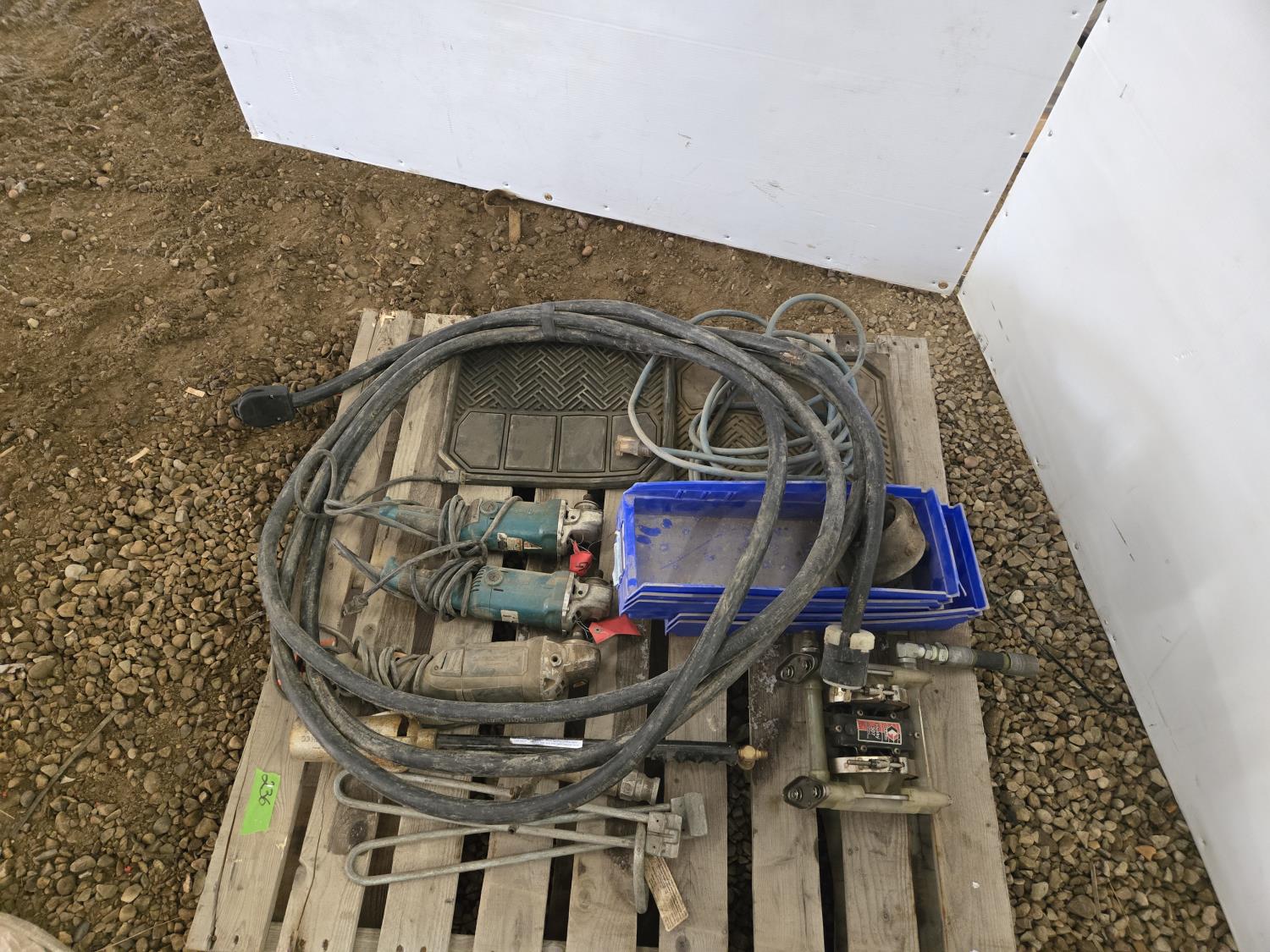 (3) Corded Angle Grinders, (2) Car Mats, (5) Poly Parts Bins