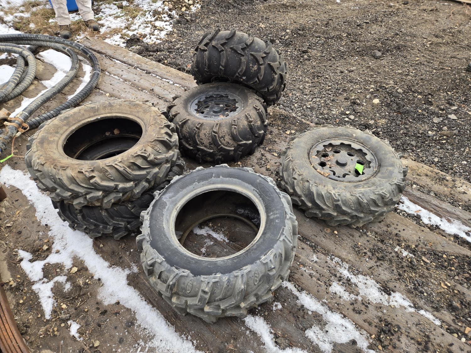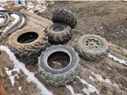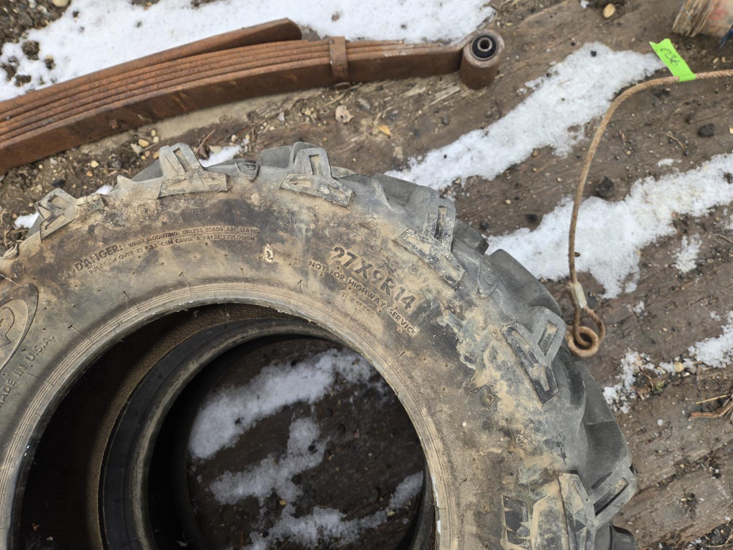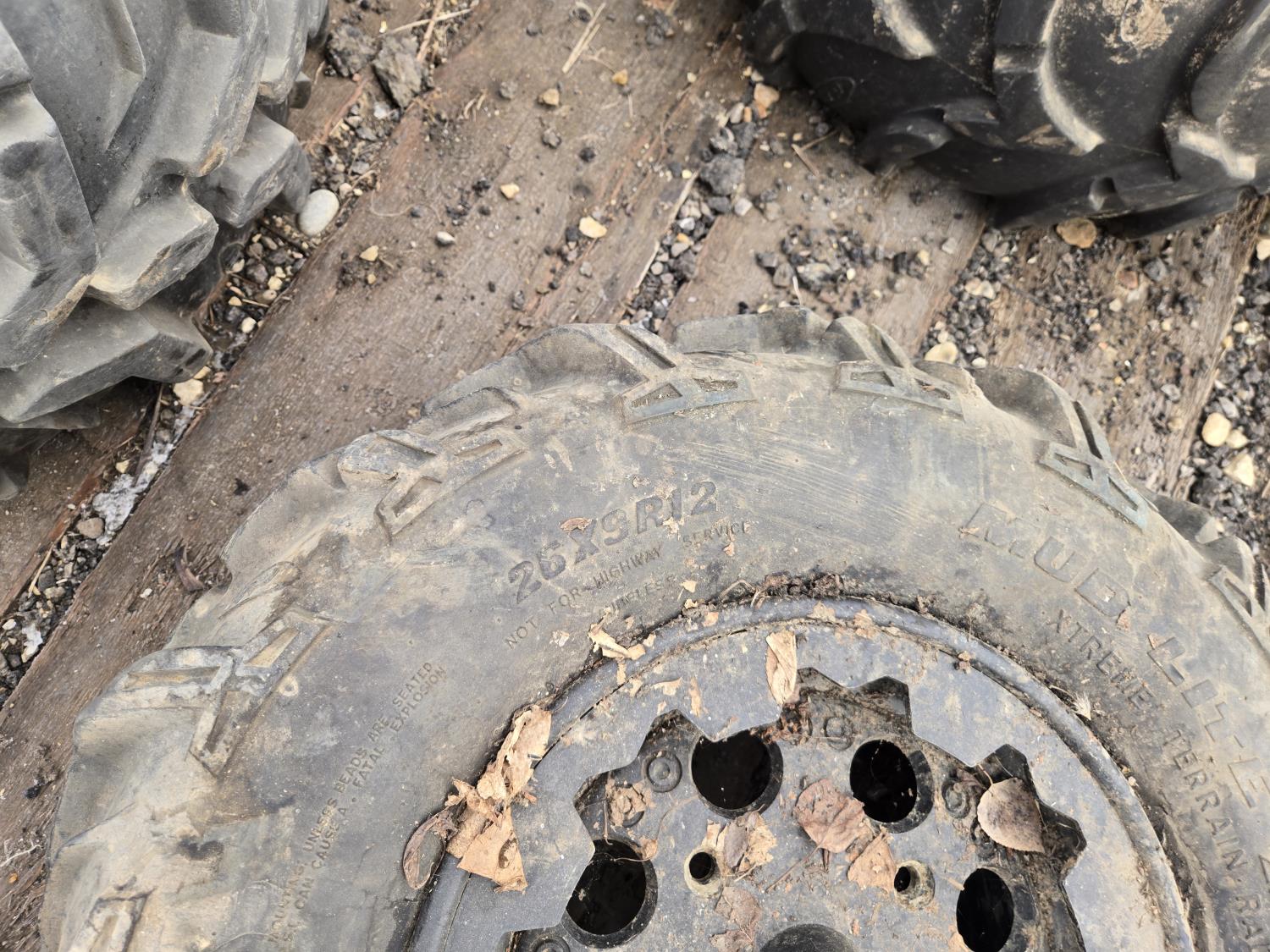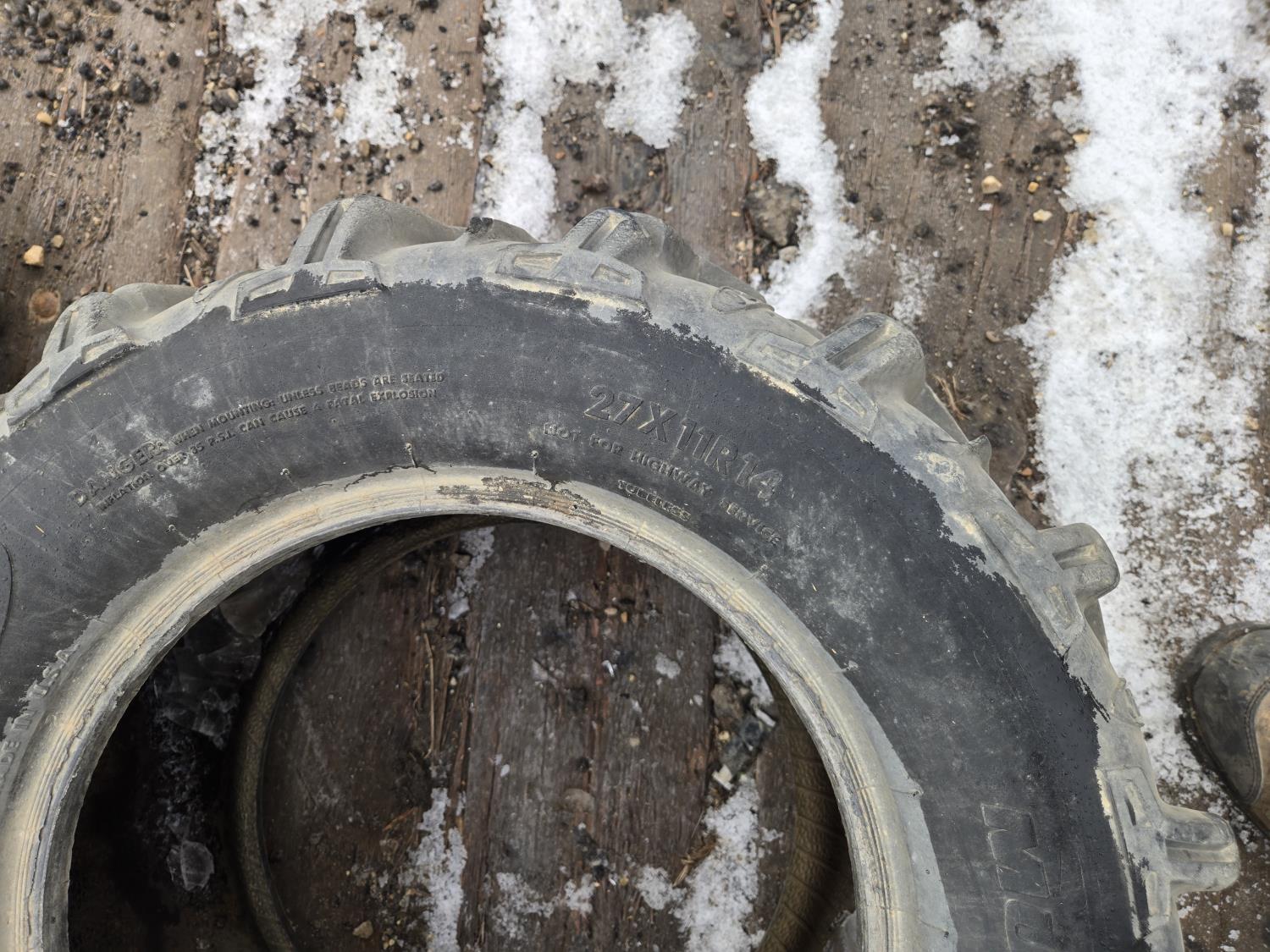 (2) 27X9R14, (1) 27X11R14, (2) 26X12.00-12 on rims, (1) 26X9R12 on rim