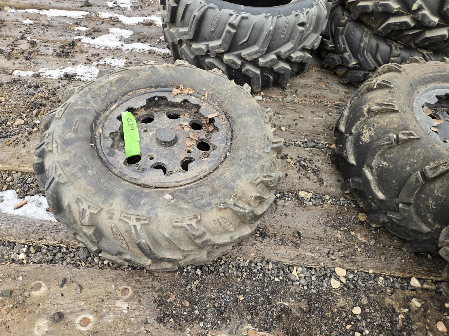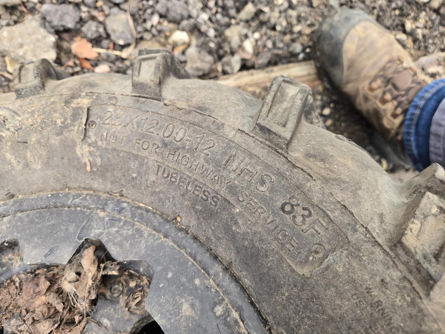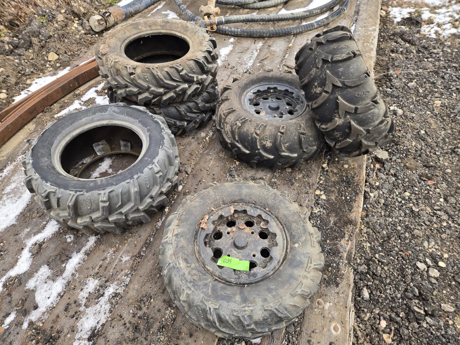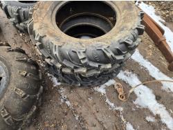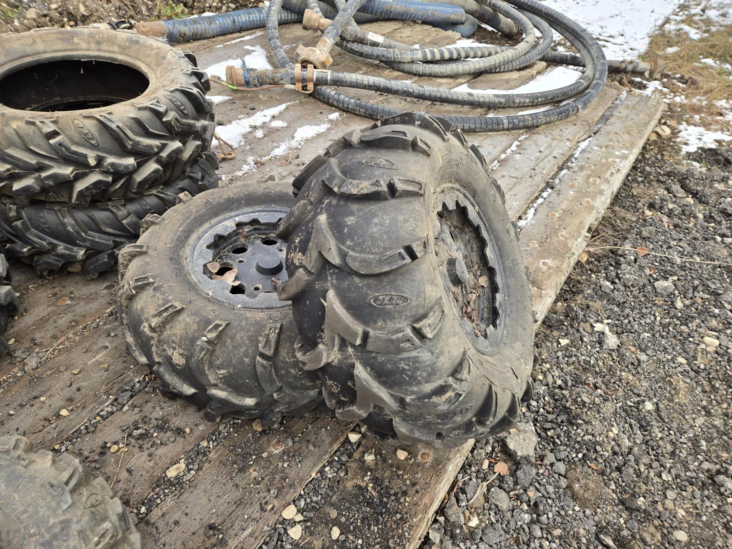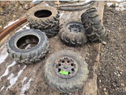 (2) 27X9R14, (1) 27X11R14, (2) 26X12.00-12 on rims, (1) 26X9R12 on rim