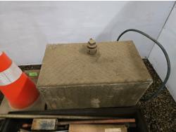 (2) oil pans, 24 inch X 13.5 inch X 16 inch aluminum fuel tank, high pressure warning sign, threaded rod, miscellaneous parts