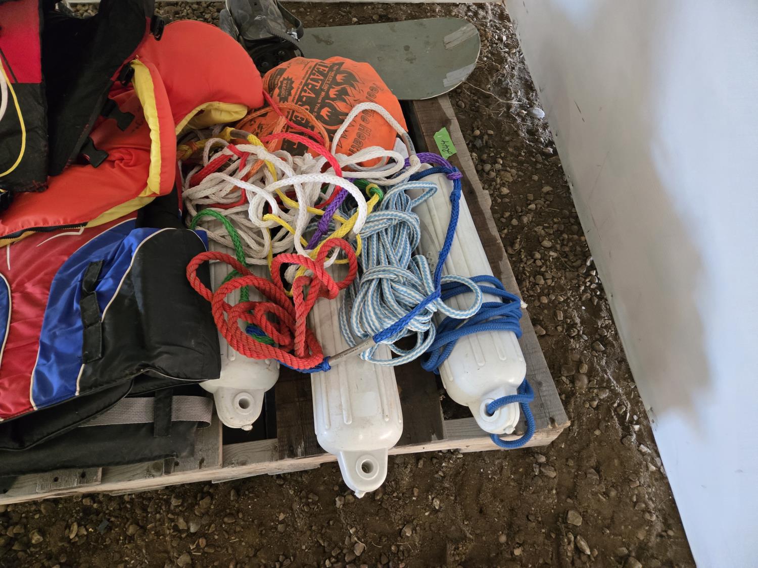 life jackets, snow board, boat buffers, miscellaneous rope, Heat-a-Seat Cushion, (4) throwing horse shoes