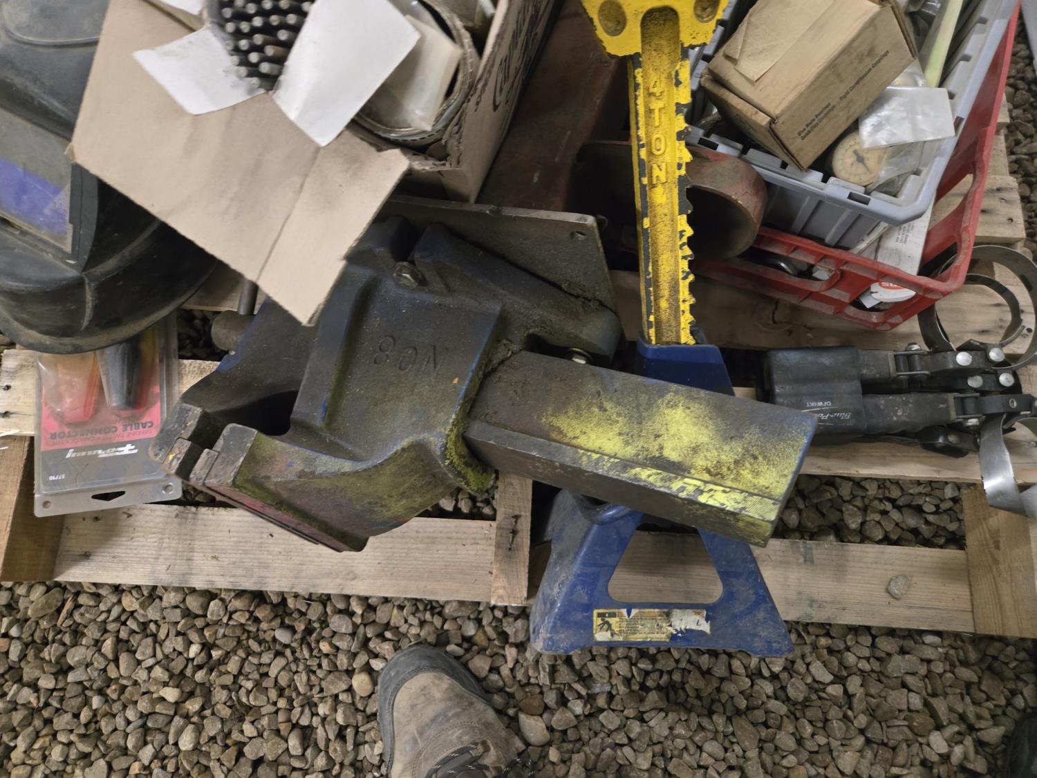 5 inch vise, 4 ton jack stand, gloves, cable connectors, welders helmet, miscellaneous parts and tools
