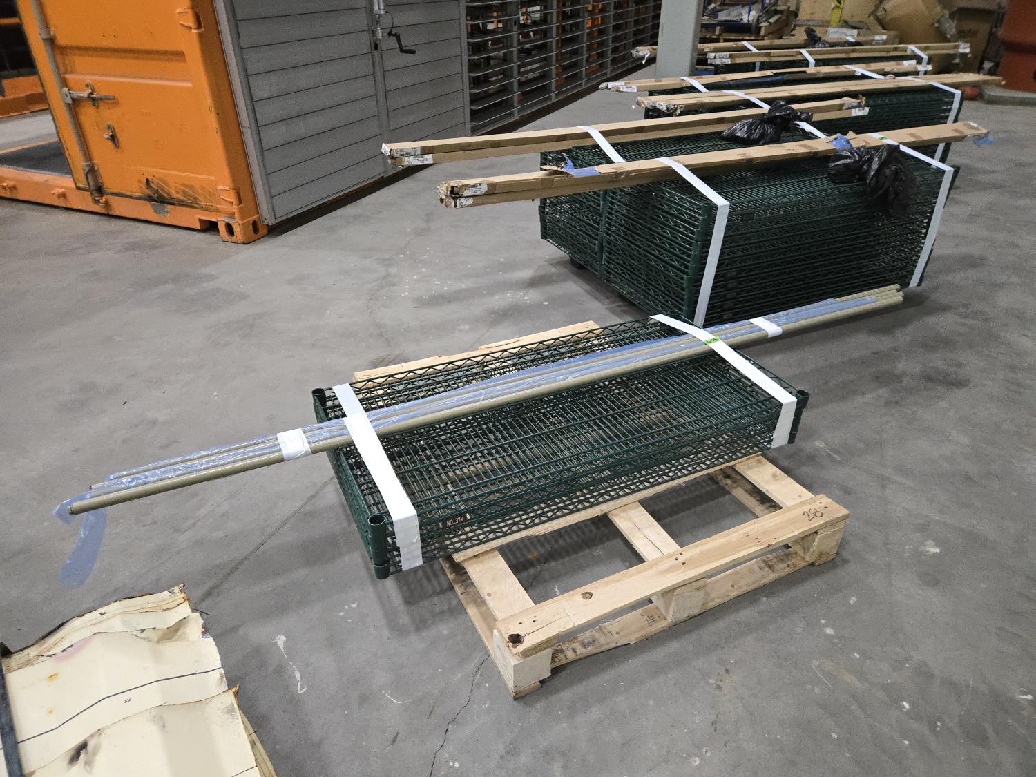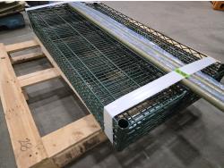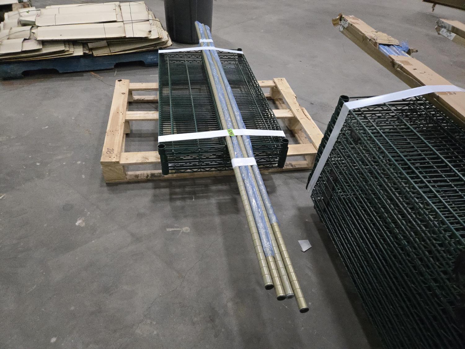 4 shelves, no tools required to assemble, gold posts, green shelves
