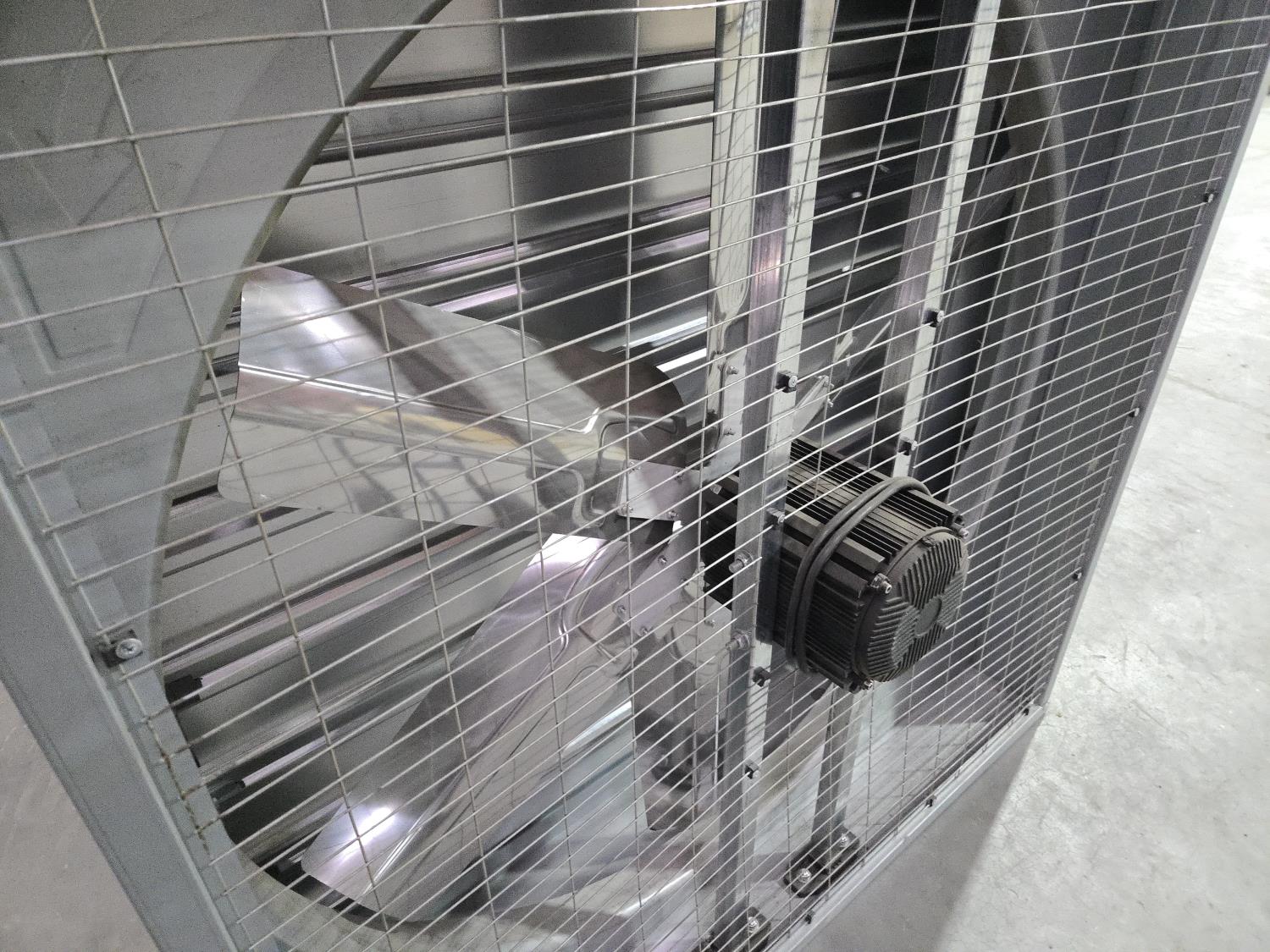 227 (2) Complete 48 Inch Fans with Housings, Wire Mesh Screens, Louvers & Motors (Unused)