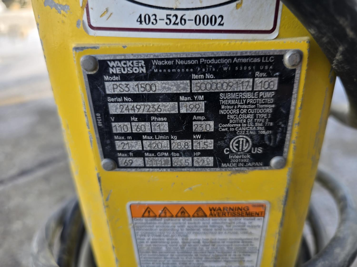 1381 Wacker Neuson PS3 1500 3 Inch Submersible Pump