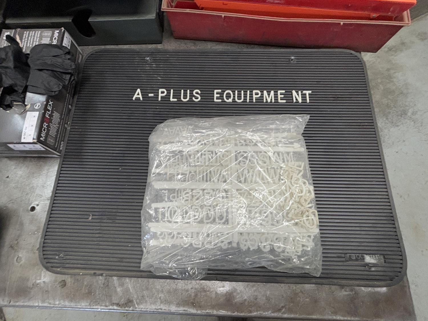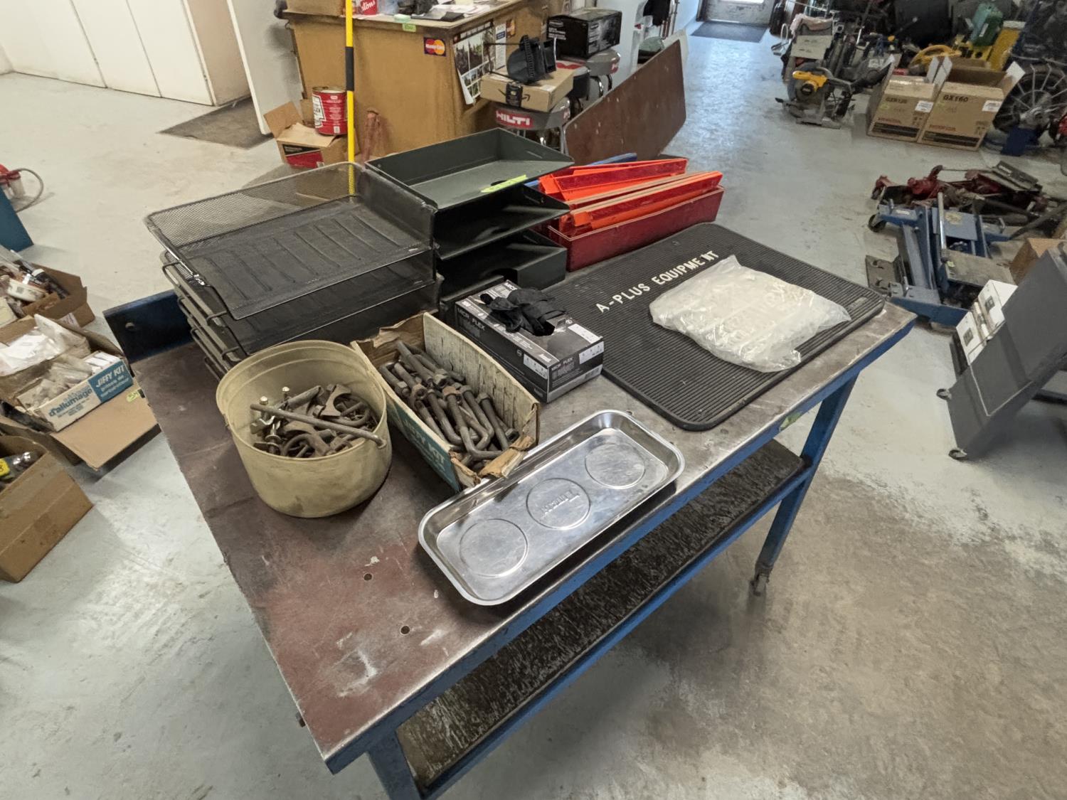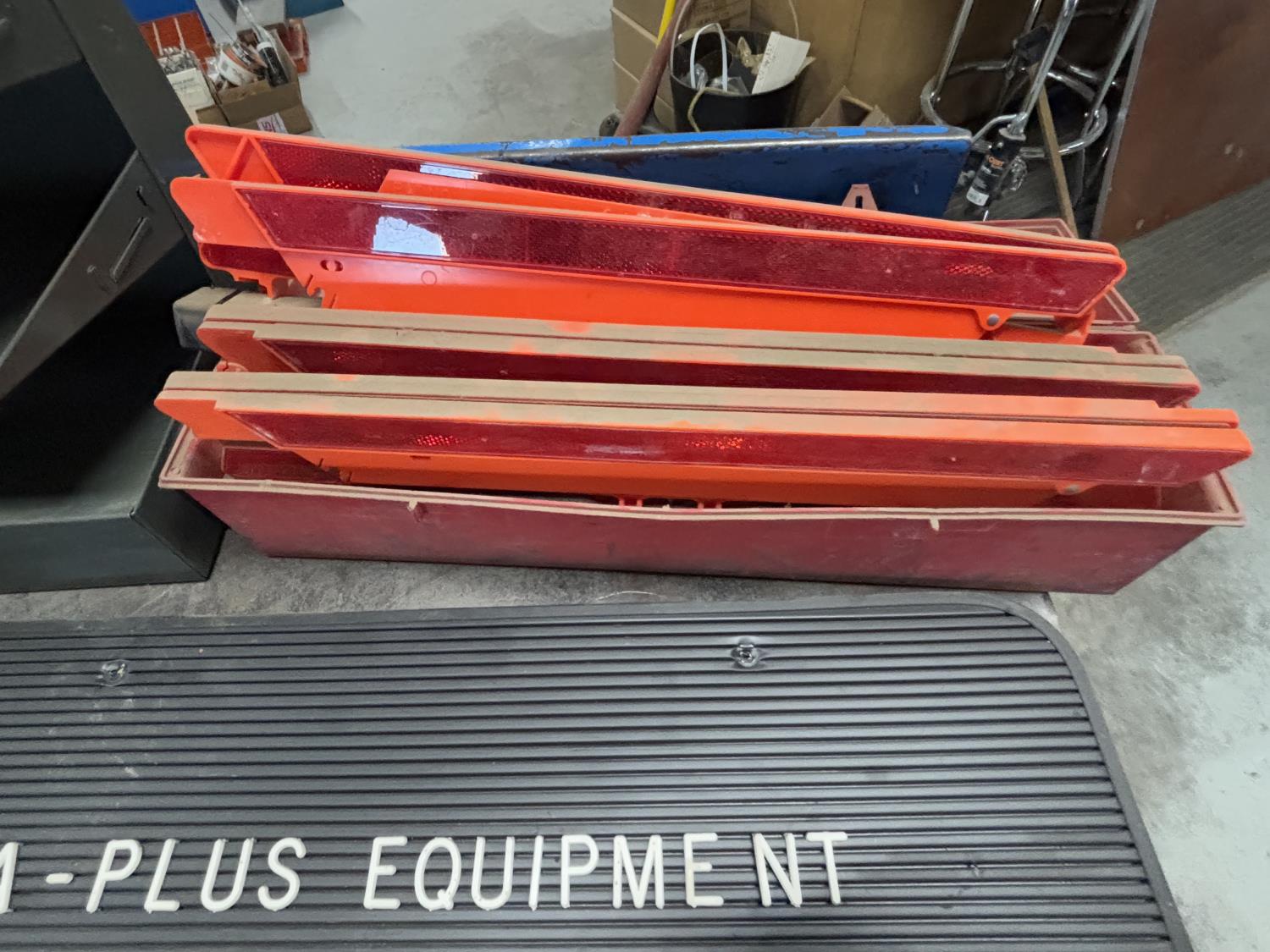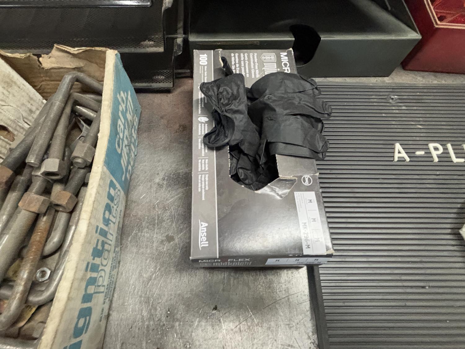 muffler clamps, u bolts, rubber gloves, magnetic tray, document trays, sign with letters and numbers, safety triangles