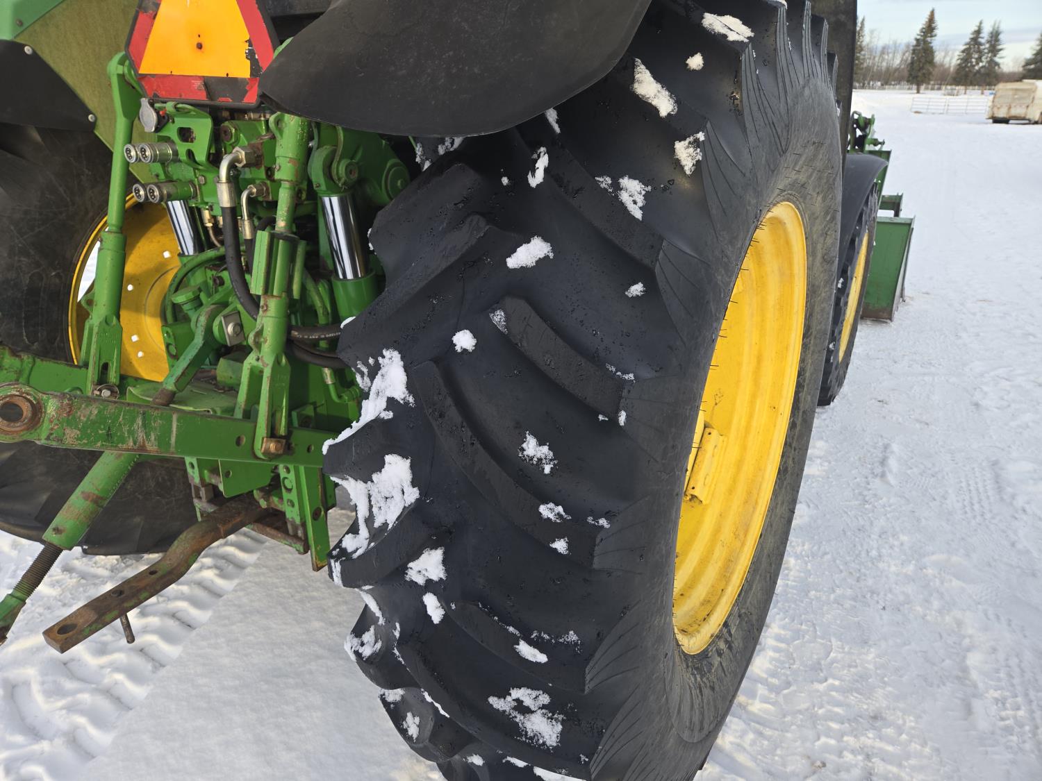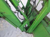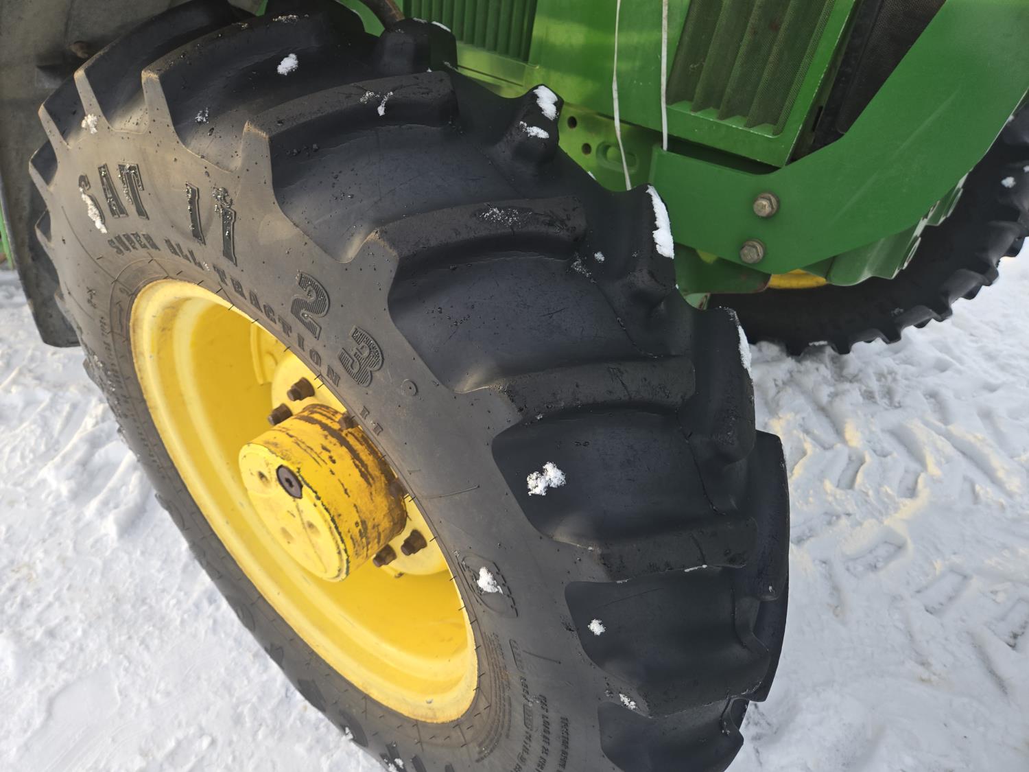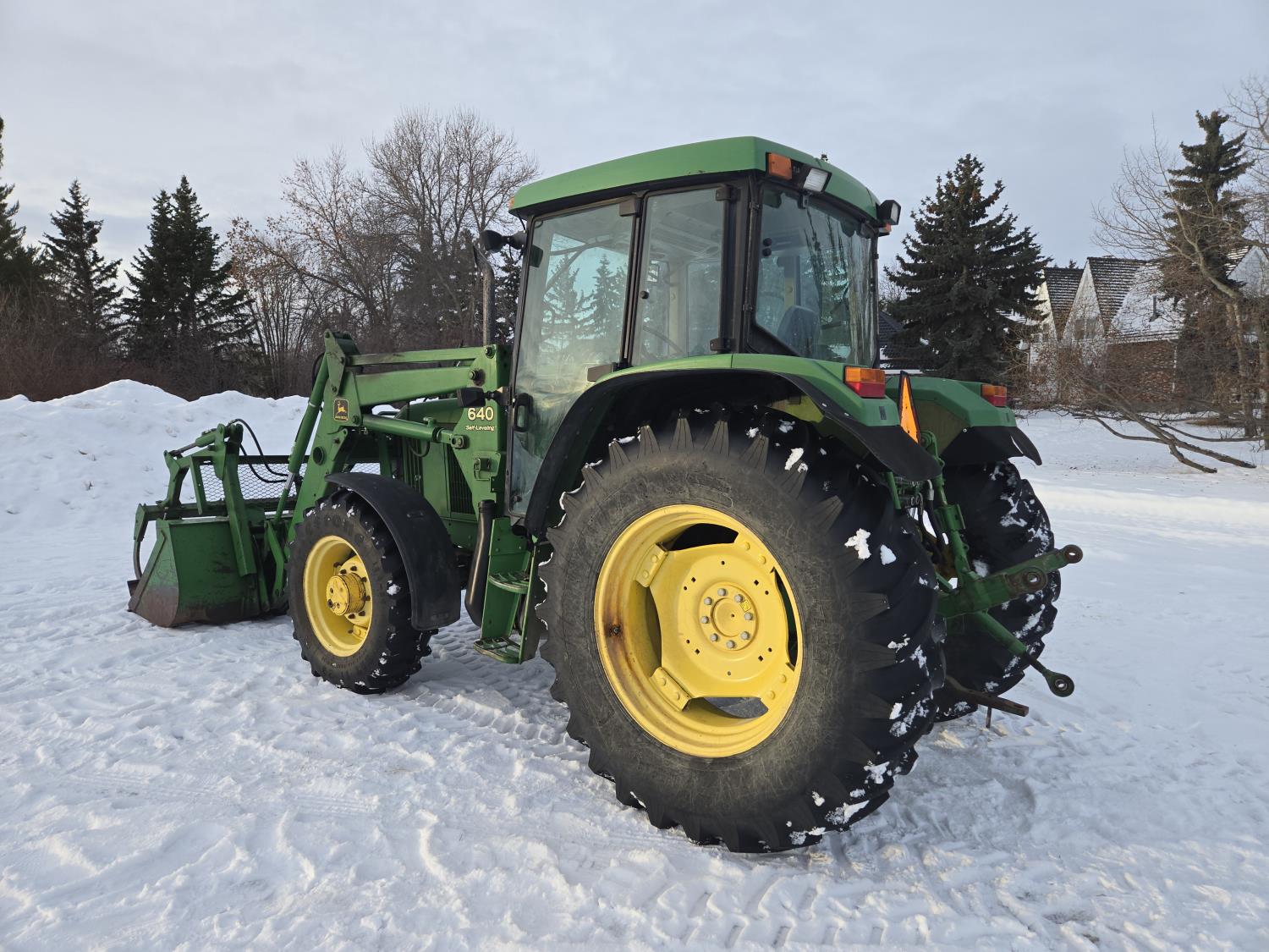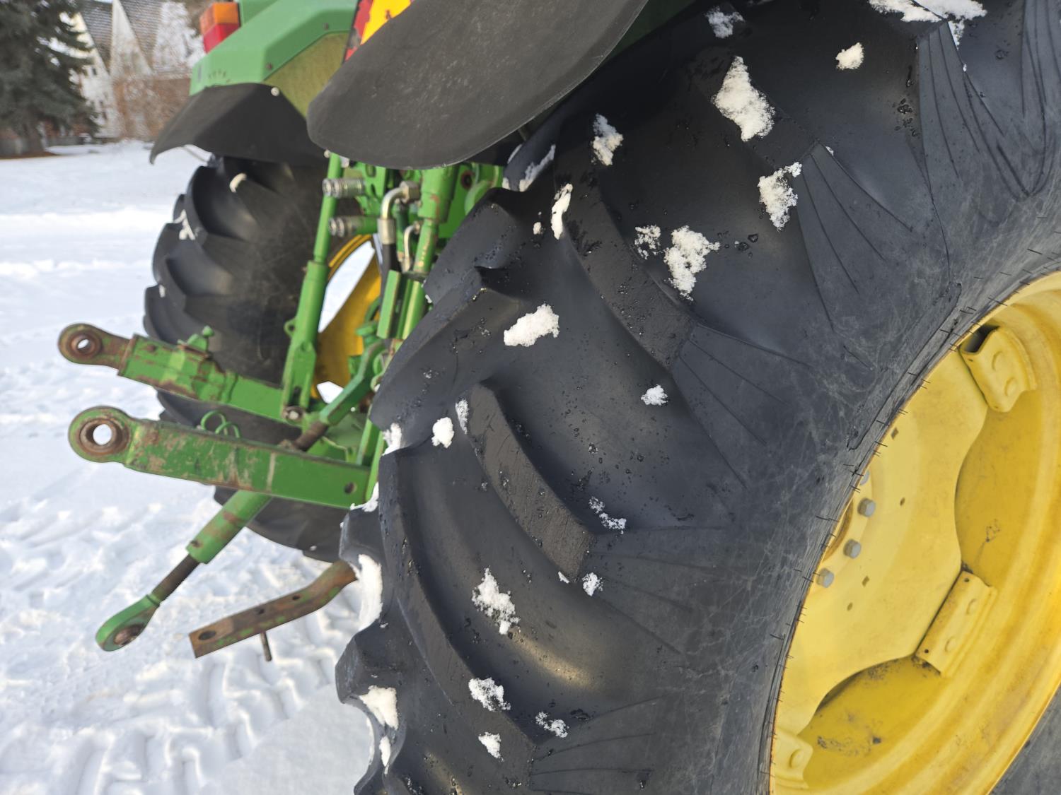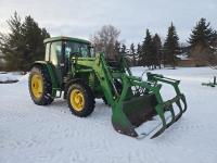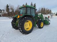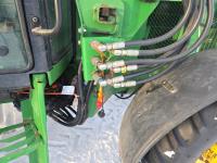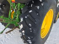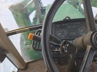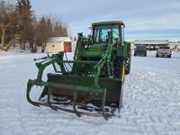 John Deere 640 loader, Q/A, 84 inch bucket, grapple, mid mount hydraulic connection, John Deere 4.5 L 4 cylinder 106 HP, diesel engine, 90 PTO HP, 16 speed partial power shift transmission, cab, left hand reverser, rear differential lock, joystick, A/C, buddy seat, 540/1000 PTO, 3 point hitch, 2 rear hydraulic outlets, 12.4-24 front tires, 18.4-34 rear tires
