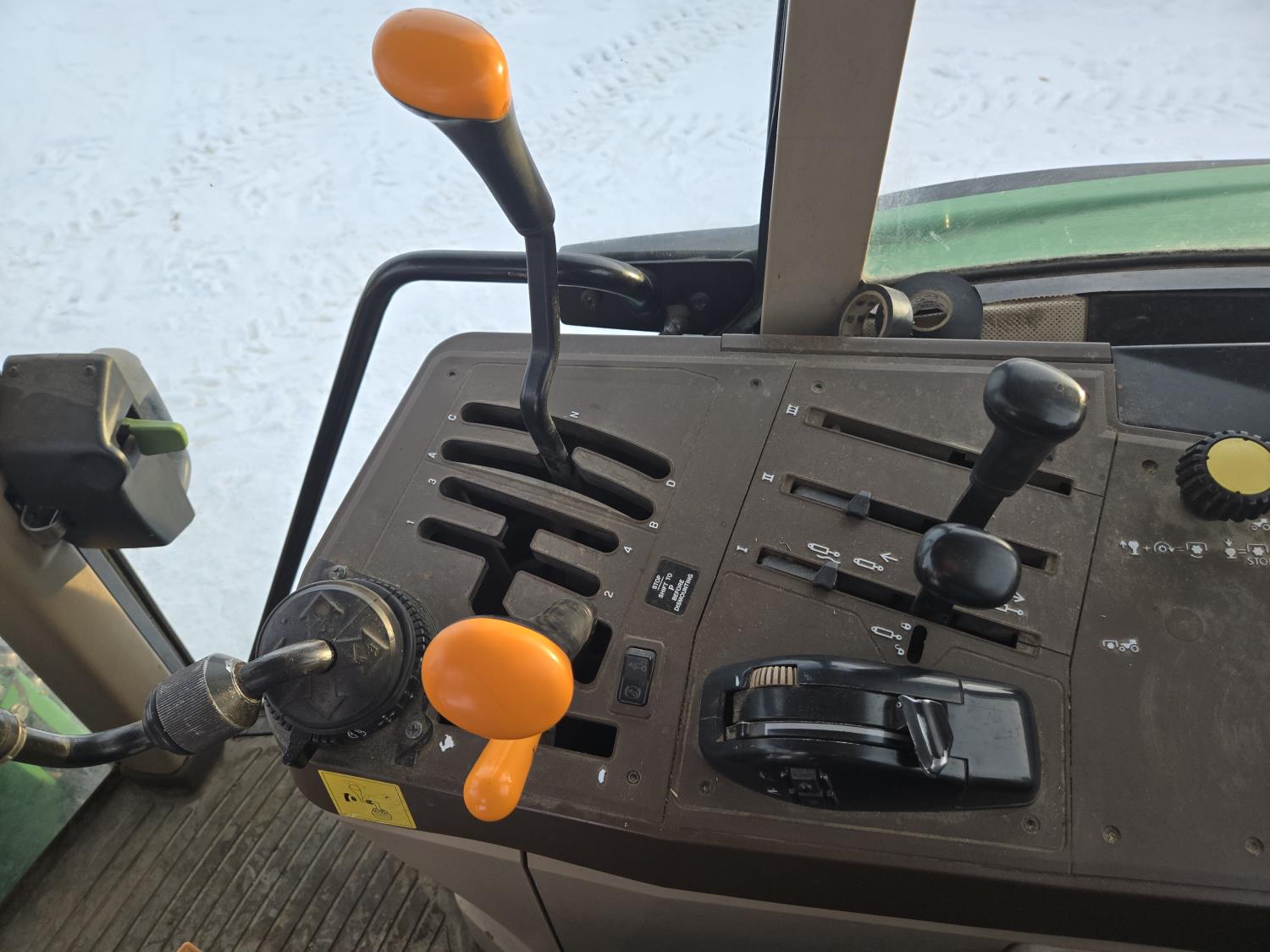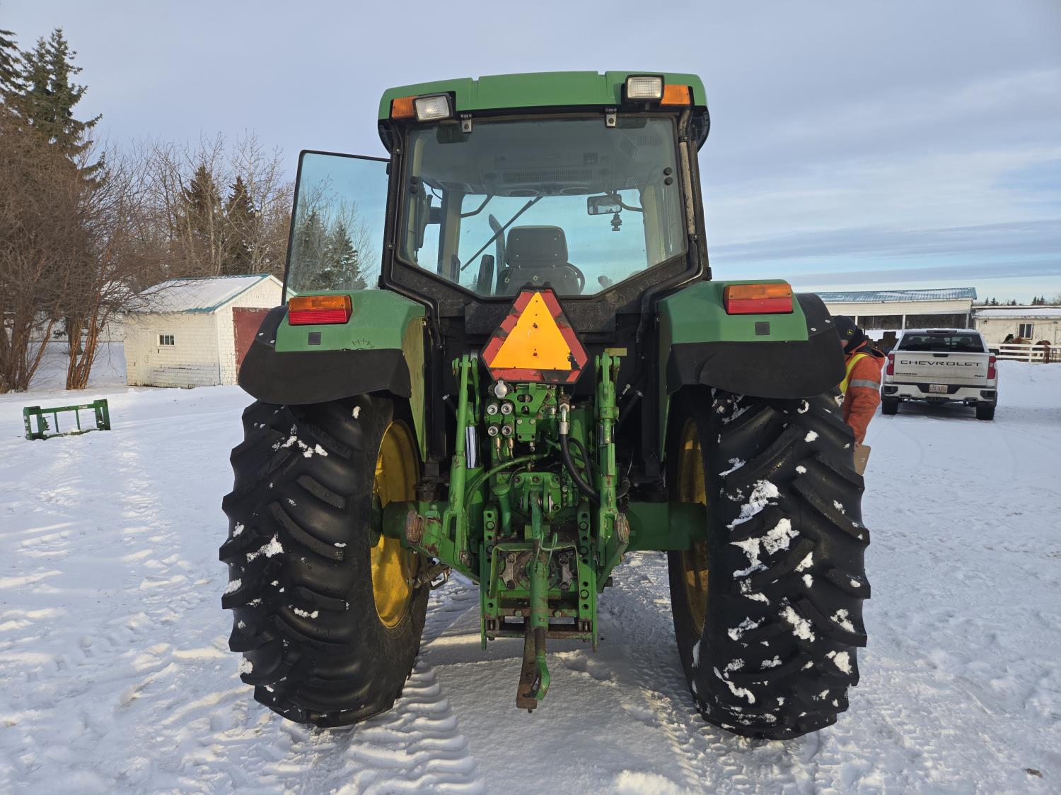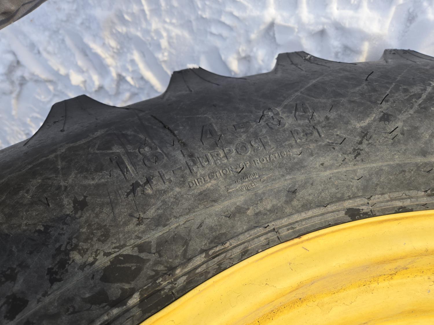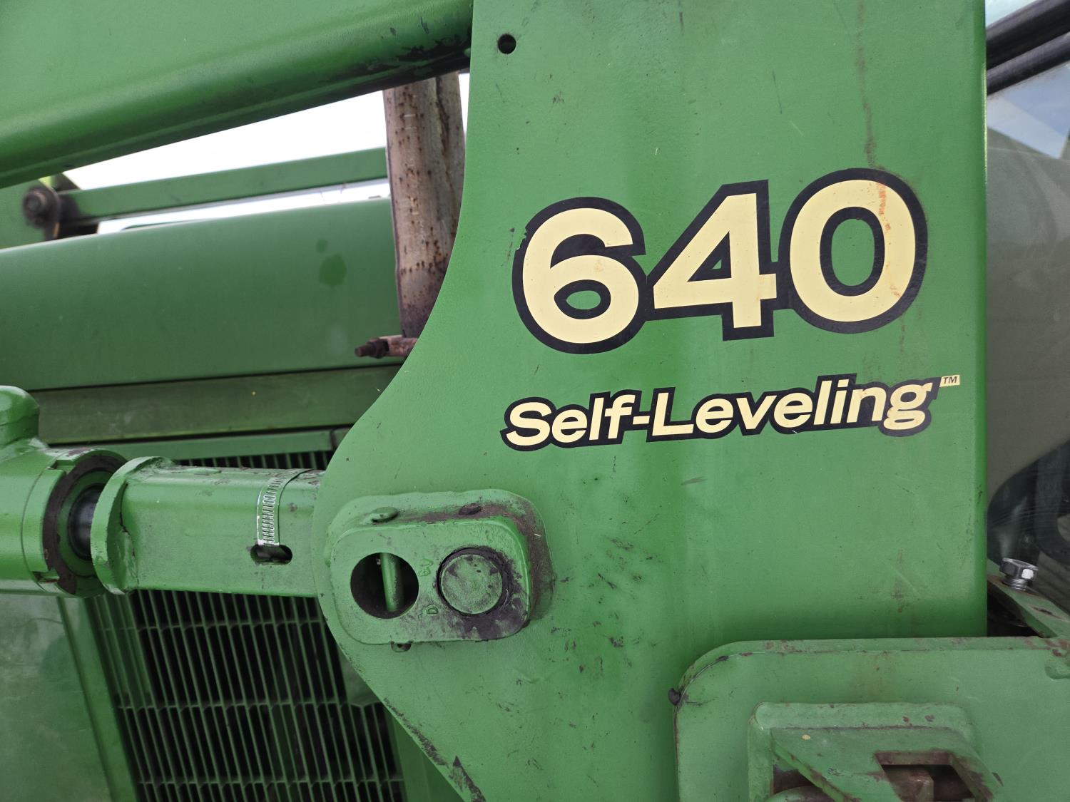 John Deere 640 loader, Q/A, 84 inch bucket, grapple, mid mount hydraulic connection, John Deere 4.5 L 4 cylinder 106 HP, diesel engine, 90 PTO HP, 16 speed partial power shift transmission, cab, left hand reverser, rear differential lock, joystick, A/C, buddy seat, 540/1000 PTO, 3 point hitch, 2 rear hydraulic outlets, 12.4-24 front tires, 18.4-34 rear tires