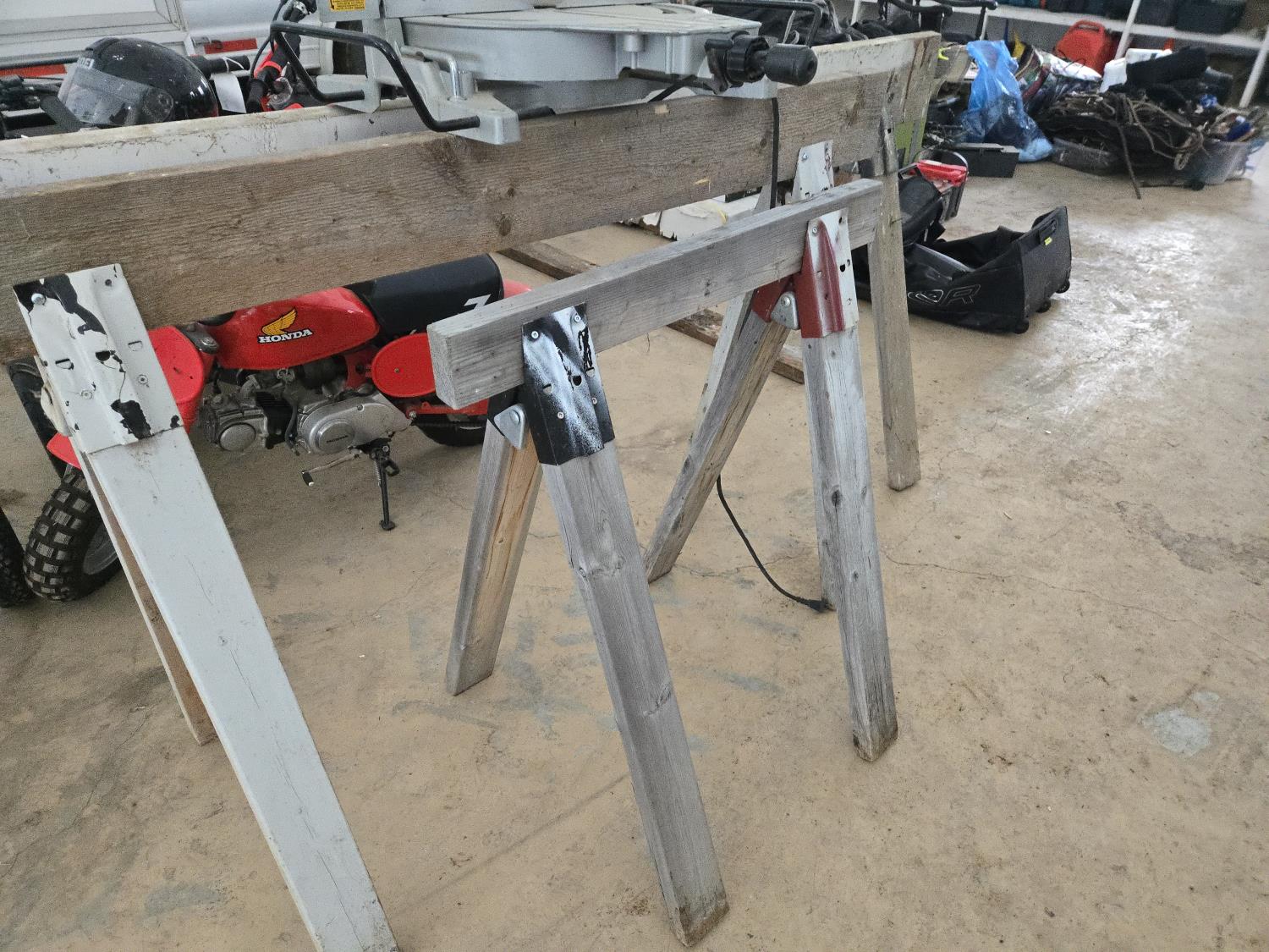 832 (3) Wooden Saw Horses & Makita 10 Inch Compound Miter Saw