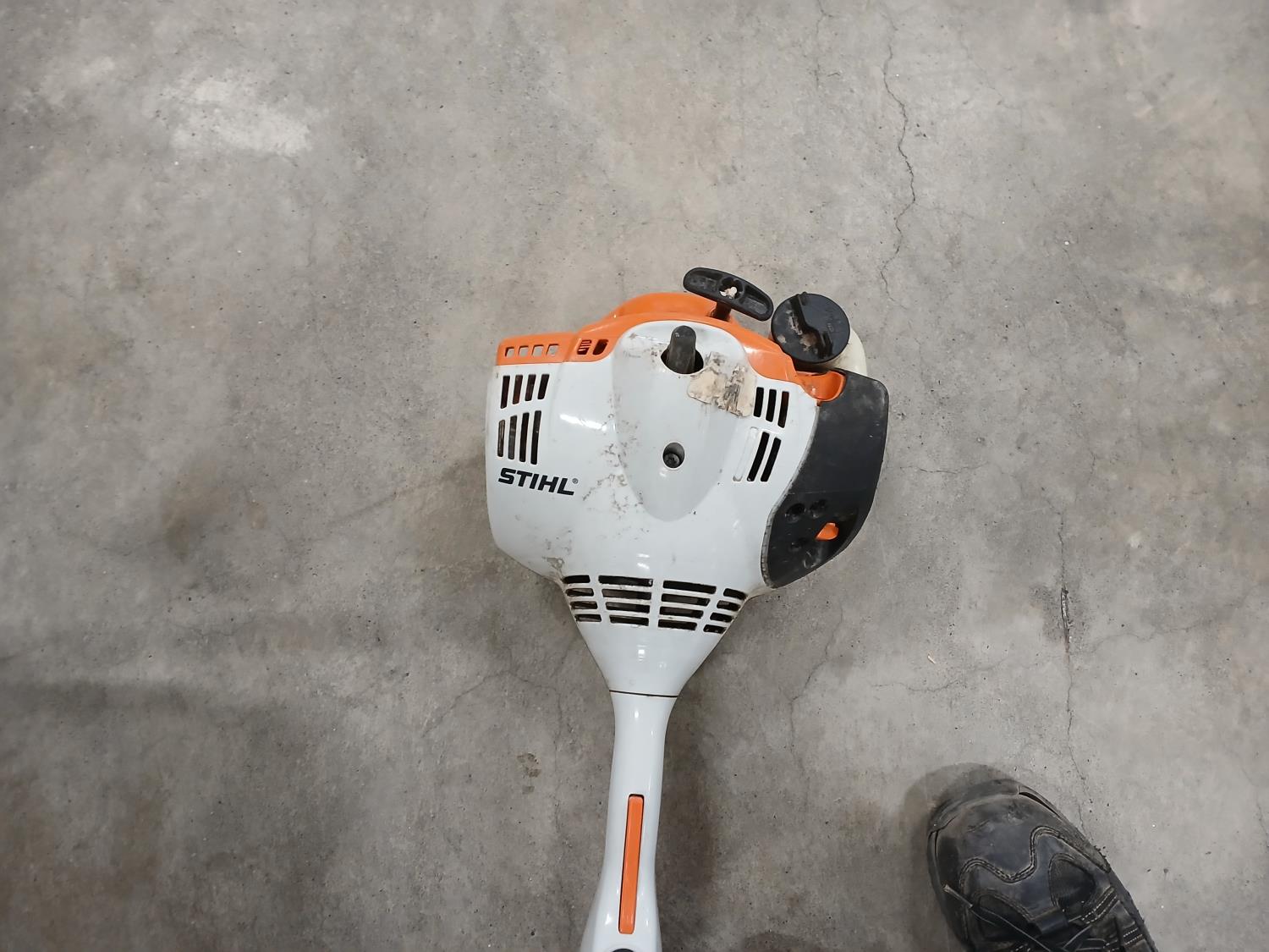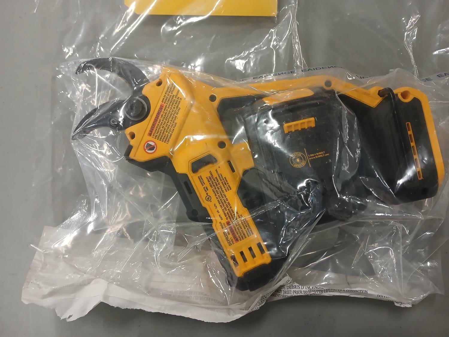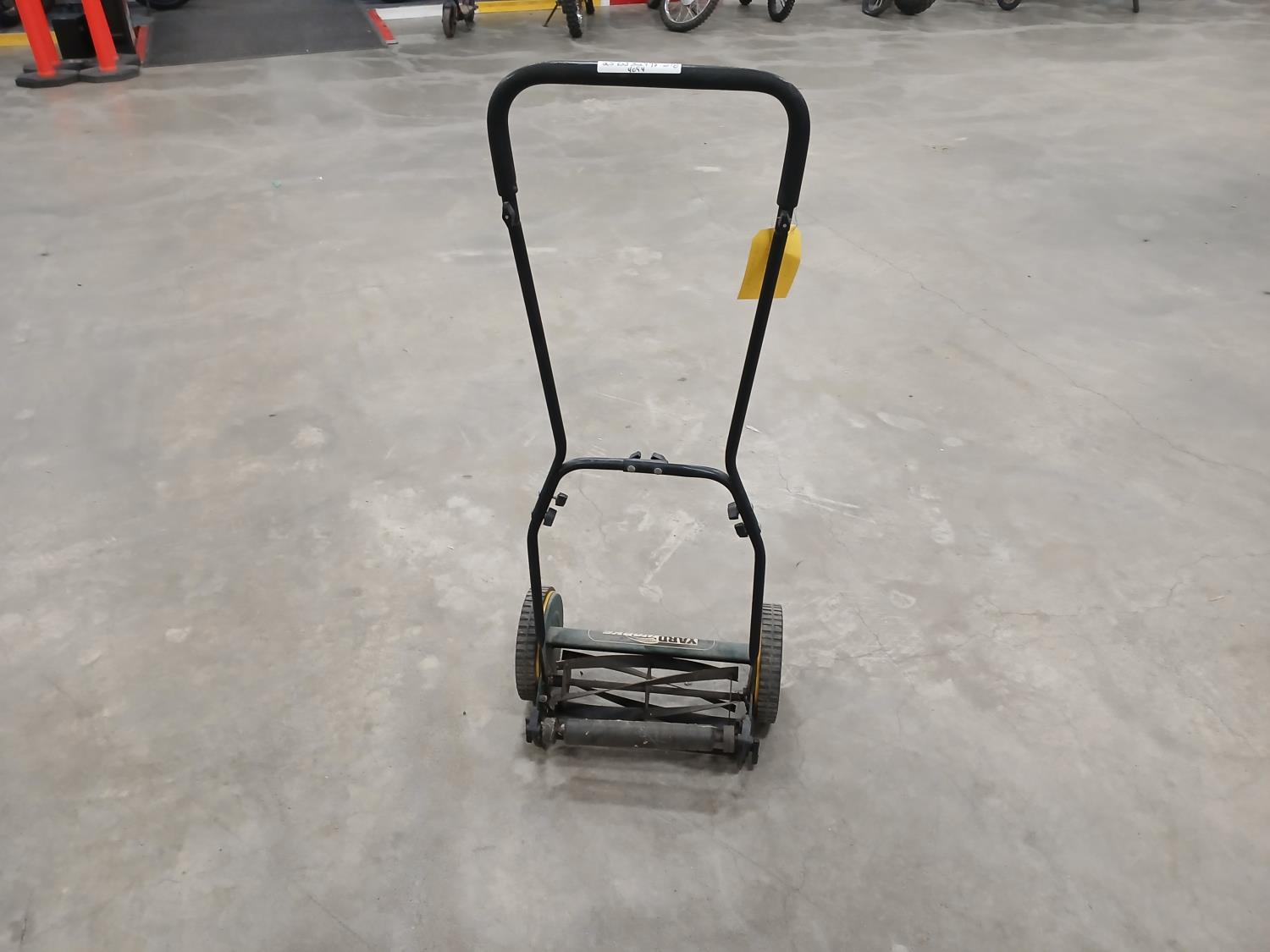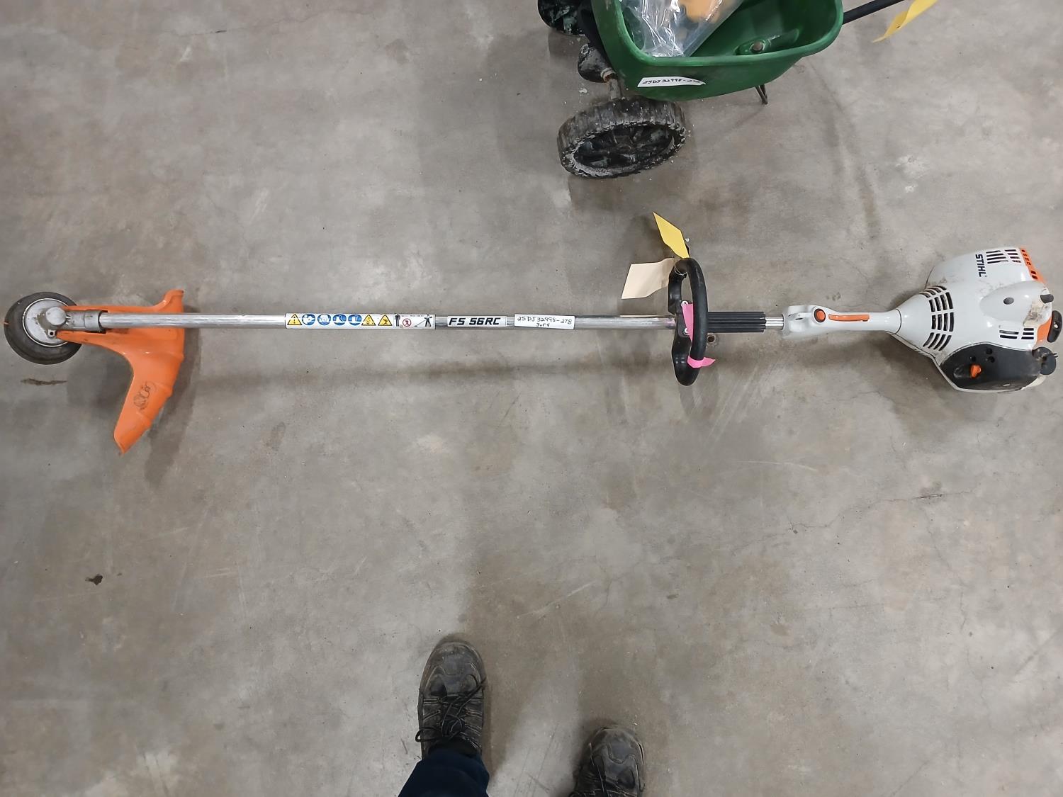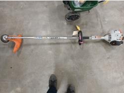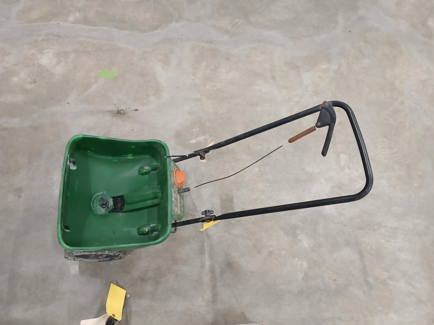 (1) Stihl weed trimmer (gas operator), (1) Yard Works push mower, (1) Scotts Turf builder seeder, (1) DeWalt Pruning shears, with battery