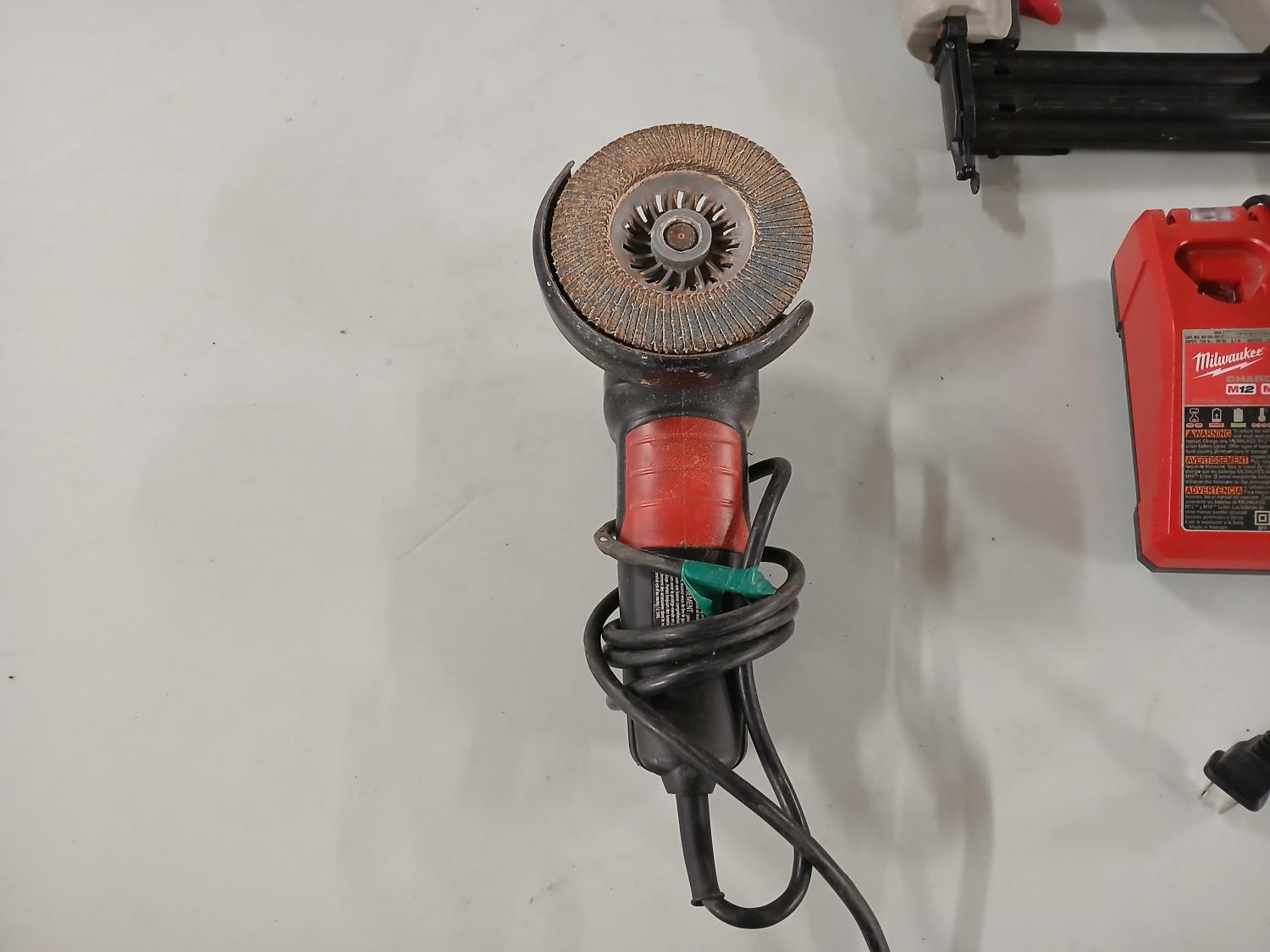 (1) Porter Cable brad nailer, (1) Milwaukee charger, (1) Craftman reciprocating saw, (1) Job mate angle grinder, (1) engineering red book of track and structure requirements, (1) air hose, (4) various sized clamps, 1 large Husqvarna wood tool box.